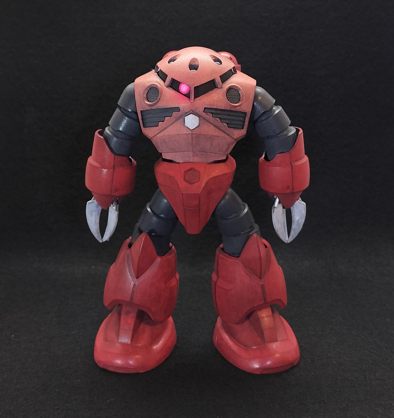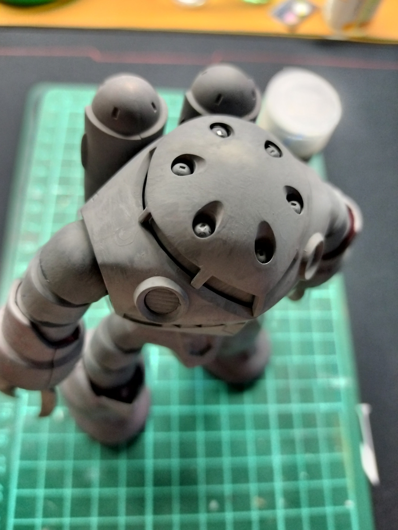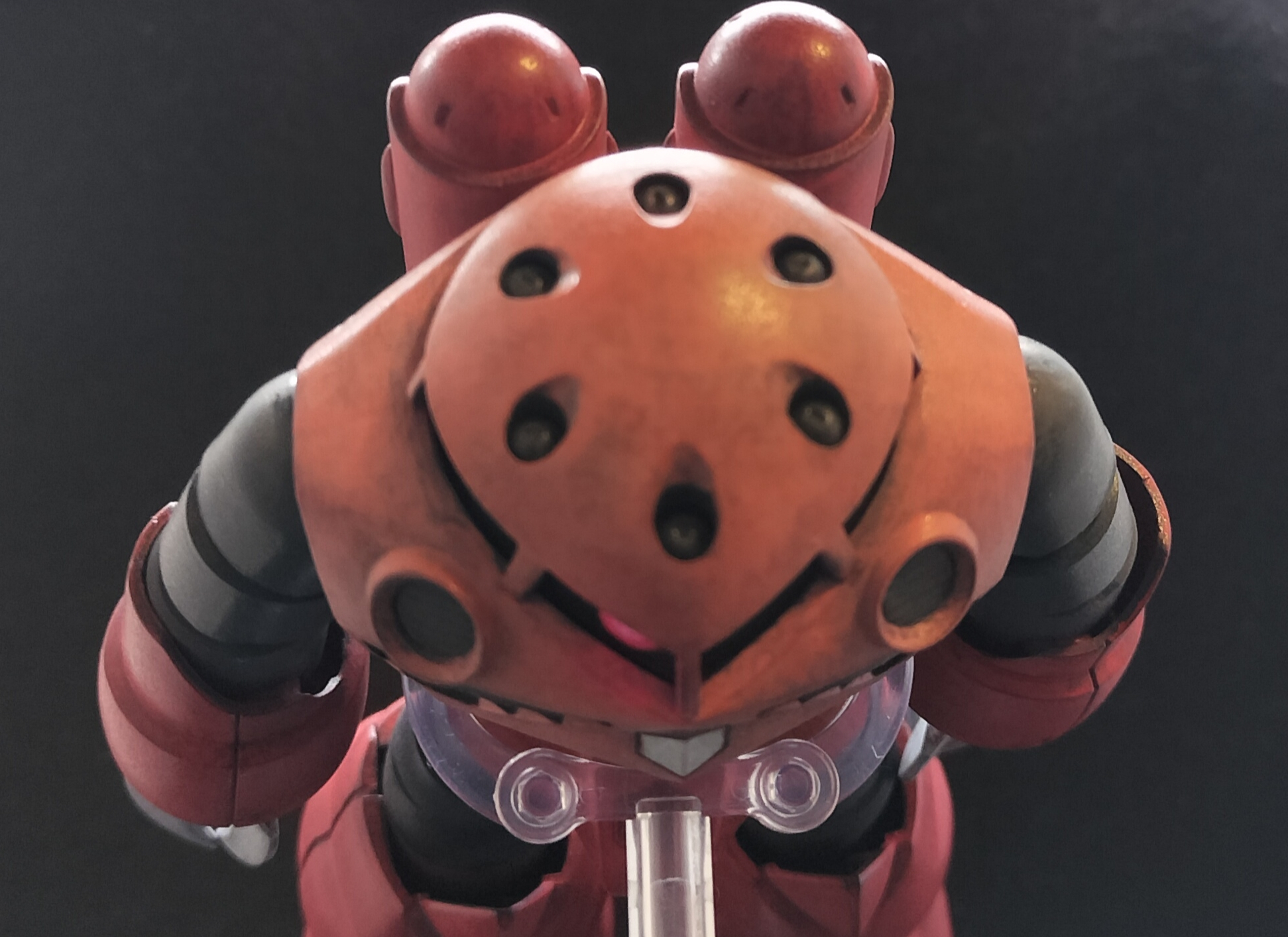 モノアイはやっぱり光らせたいってことで、頑張って描きました。アクリルガッシュの蛍光ローズで慎重に、慎重に…。周囲もドライブラシでほんのり蛍光ローズをのせて、反射を表現。