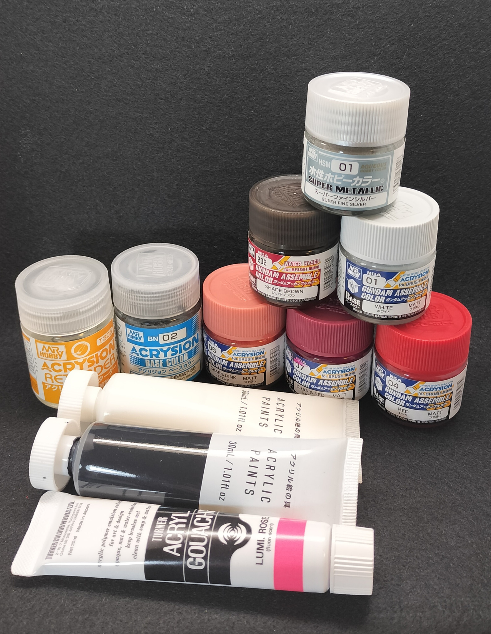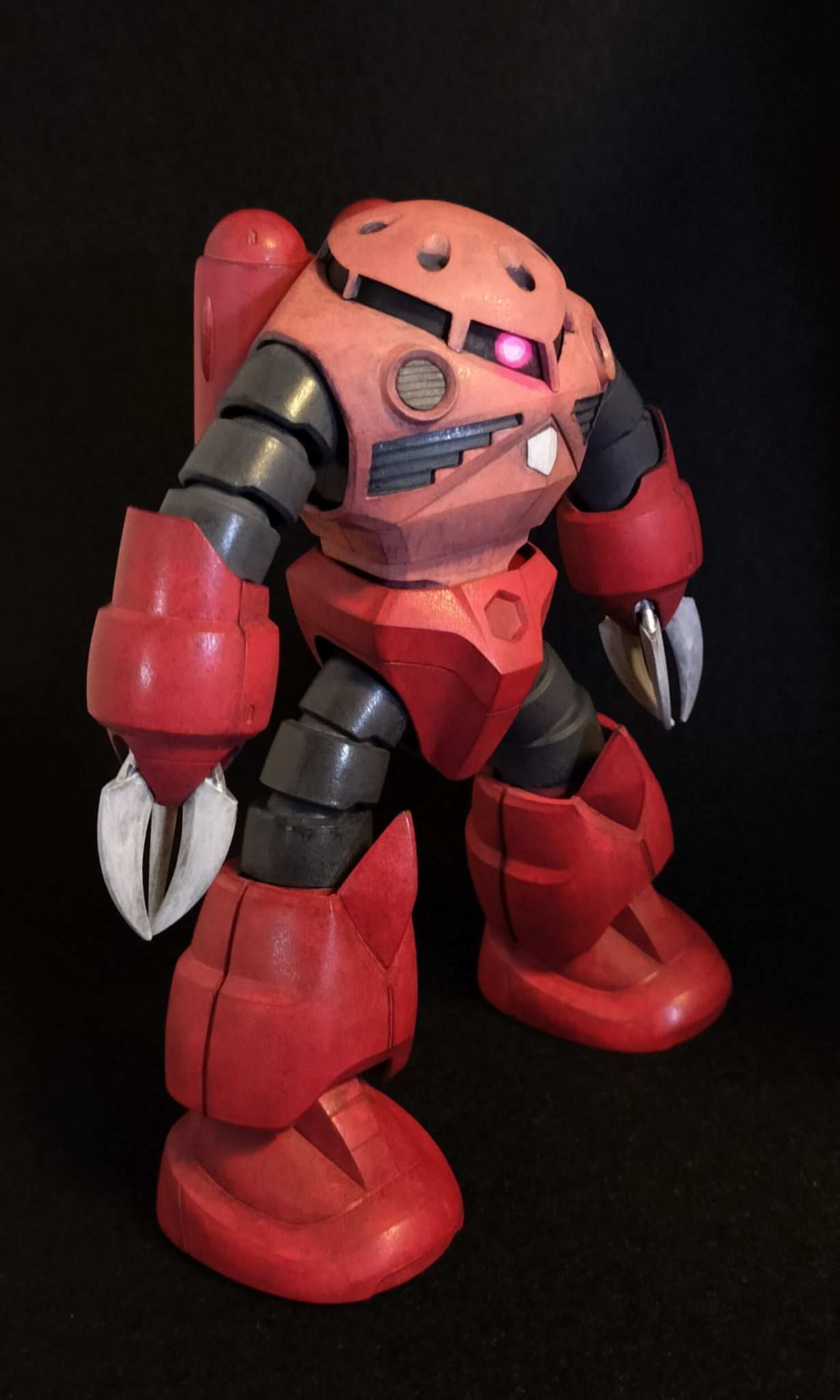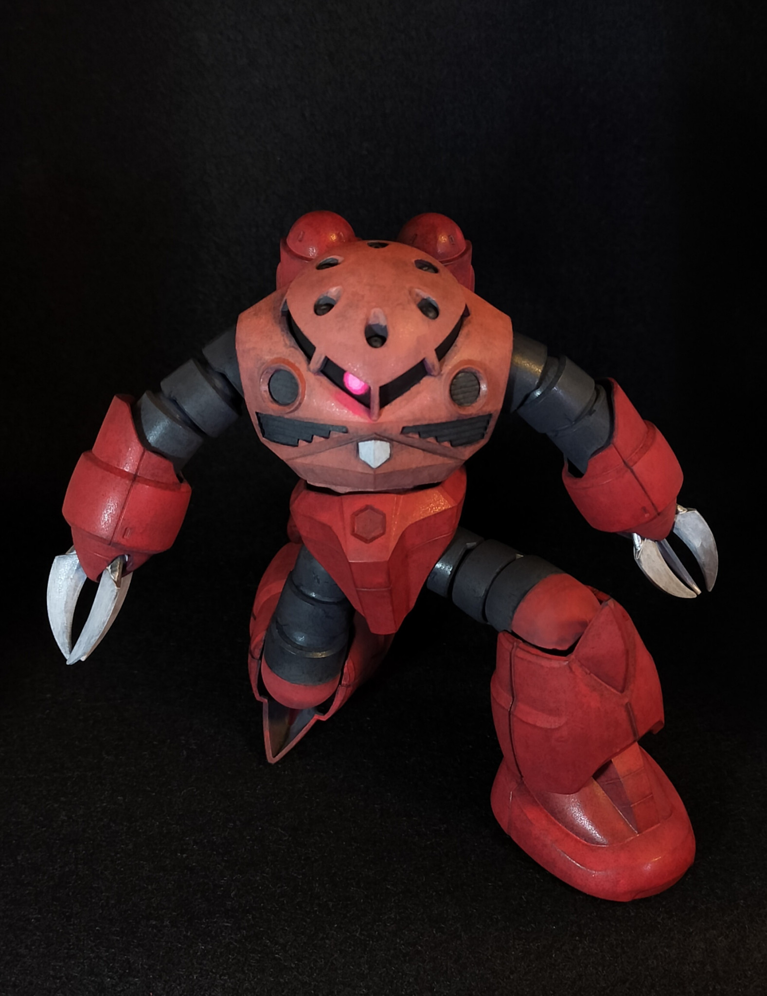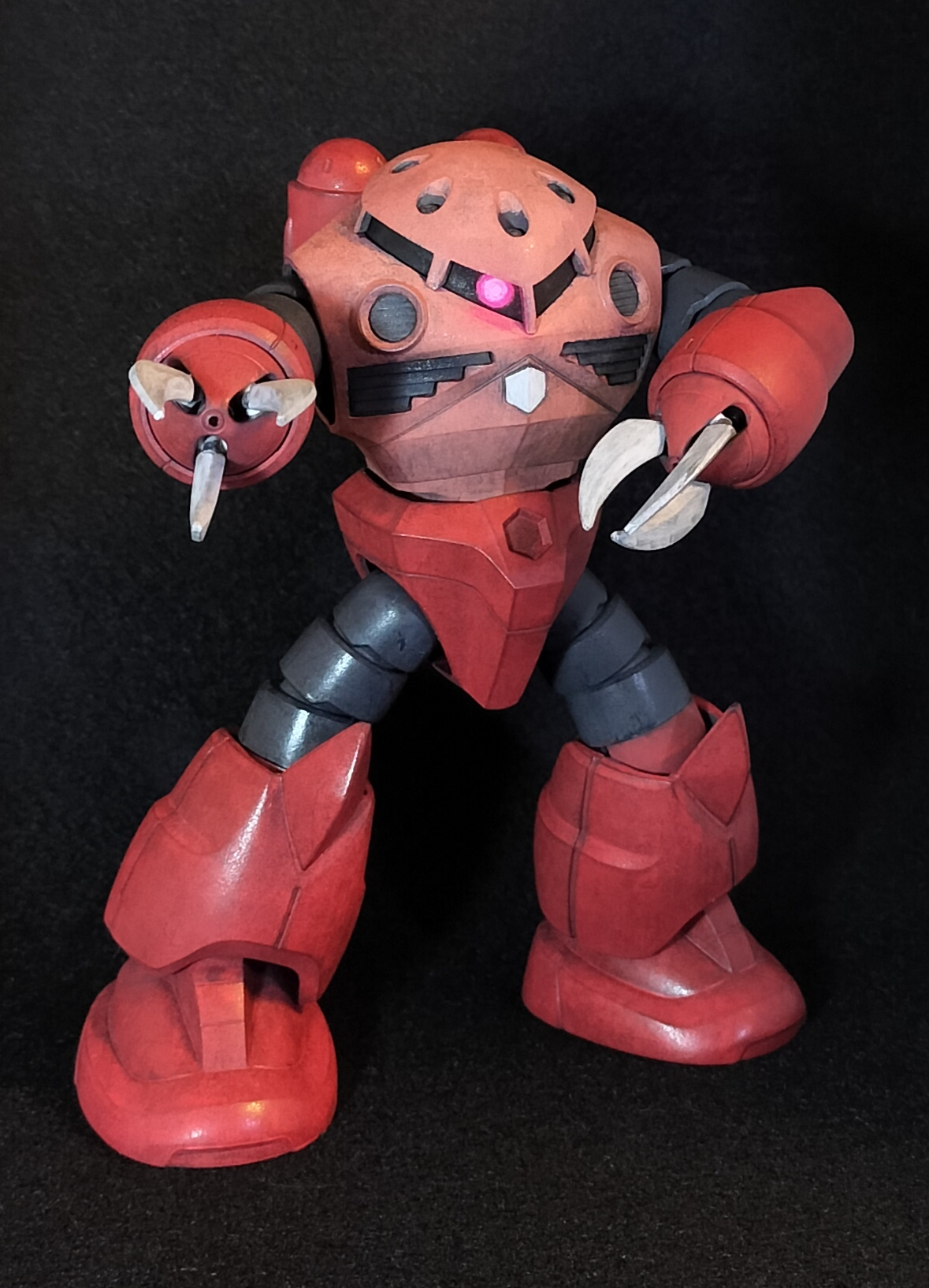 モノアイはやっぱり光らせたいってことで、頑張って描きました。アクリルガッシュの蛍光ローズで慎重に、慎重に…。周囲もドライブラシでほんのり蛍光ローズをのせて、反射を表現。