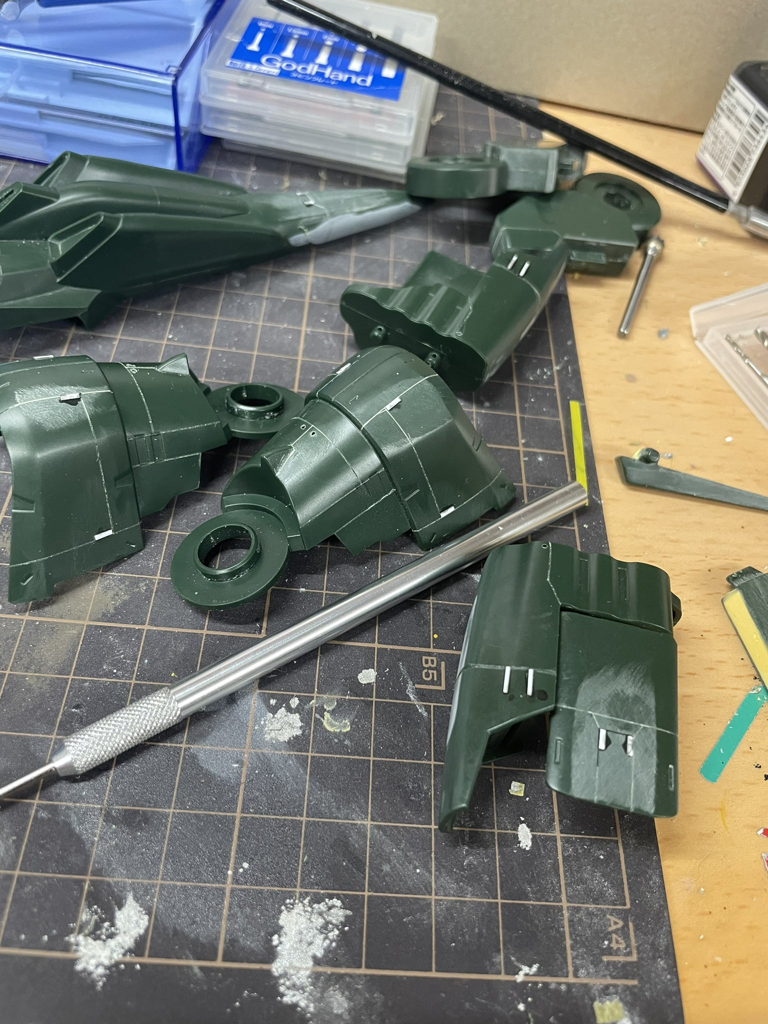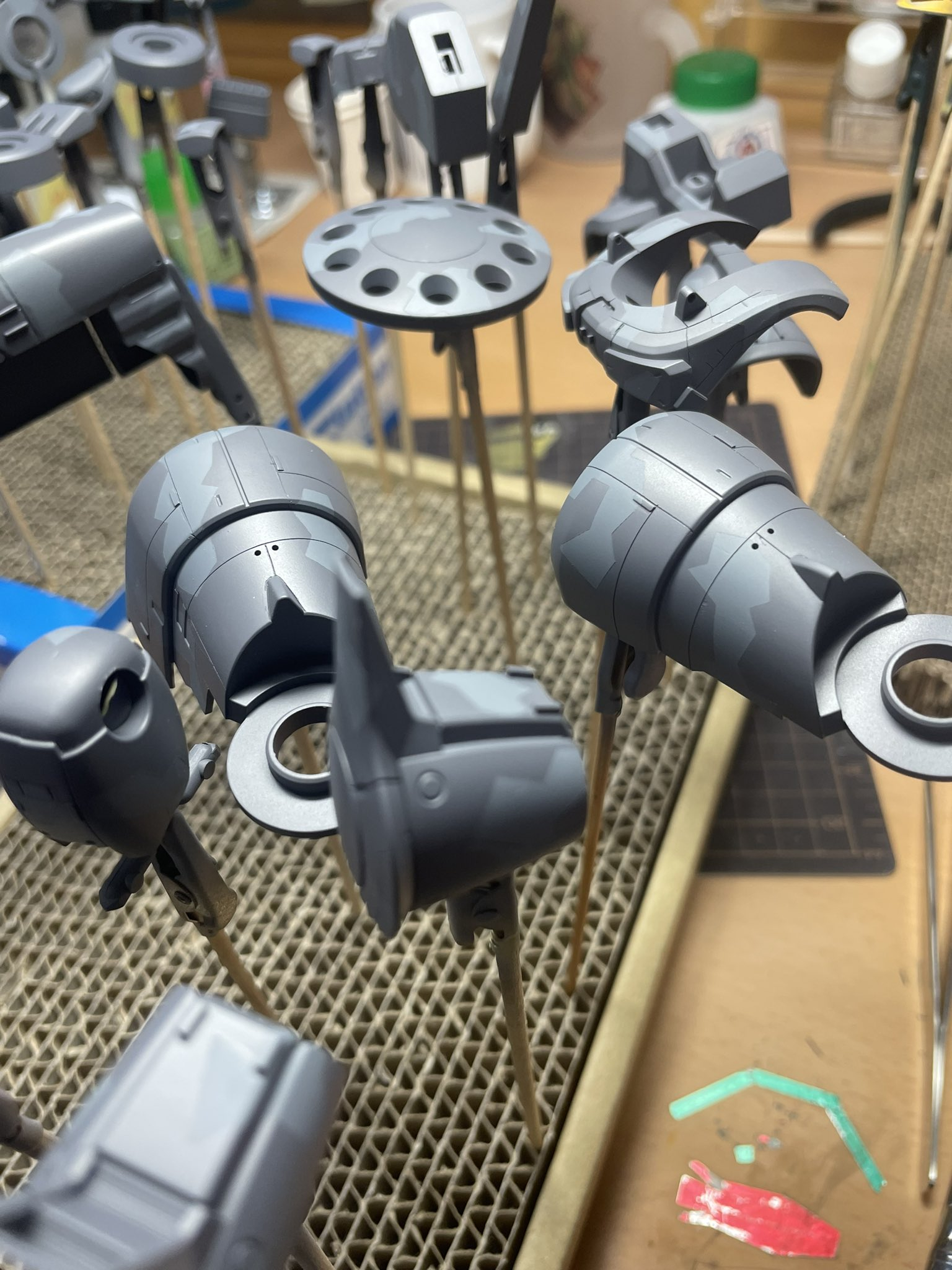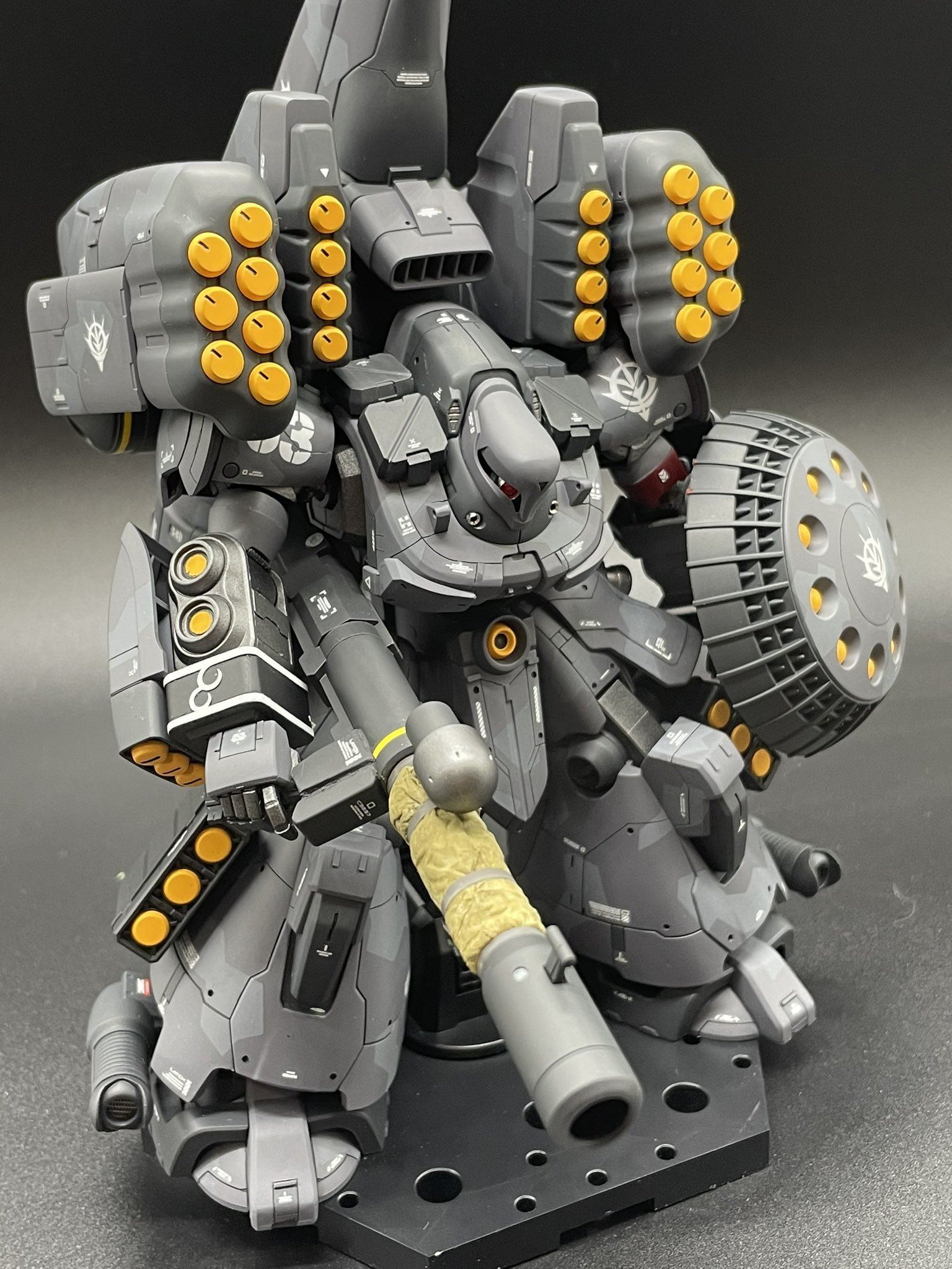 足はキットそのままを使う予定でしたがミサイル塗り分け面倒だなとか思いながら後ハメ加工してたら盛大にミスって治す気力も残ってなかったので急遽パーツ取りにしてたドムトロを使用 結果的に個性が出せたのでよかったです