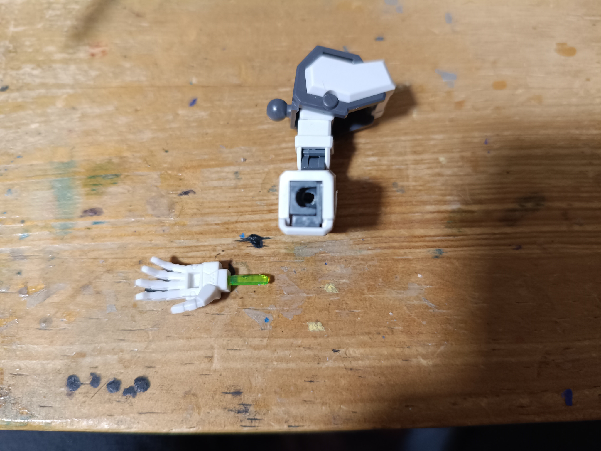 腕もマヴラブの機体から借りてきたので装備が無改造で装備可能性に ストライクの腕のポールジグを刺すとこに小さな穴を開けてビームサーベルを細かく切ってそれをマヴラブの機体手首パーツに刺してます