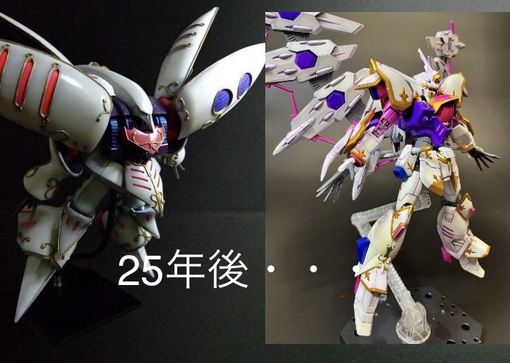 二つを比べてみると明らかに塗装スキルが上がっているなと感じました。当時は塗料の性能もあまり良くなく、キュベレイはクレオスのホワイトパールを吹いたのですが、全く光沢、パール感感じられません。また、股関節軸が折れてしまい、生まれて初めて軸うちし、間接復活させたのもいい思い出です。当時の電撃ホビーマガジンの作例を真似てハンダ線とポリパテでエングレイビングを施し、ペイントマーカーでチマチマ金色に塗装していました😊