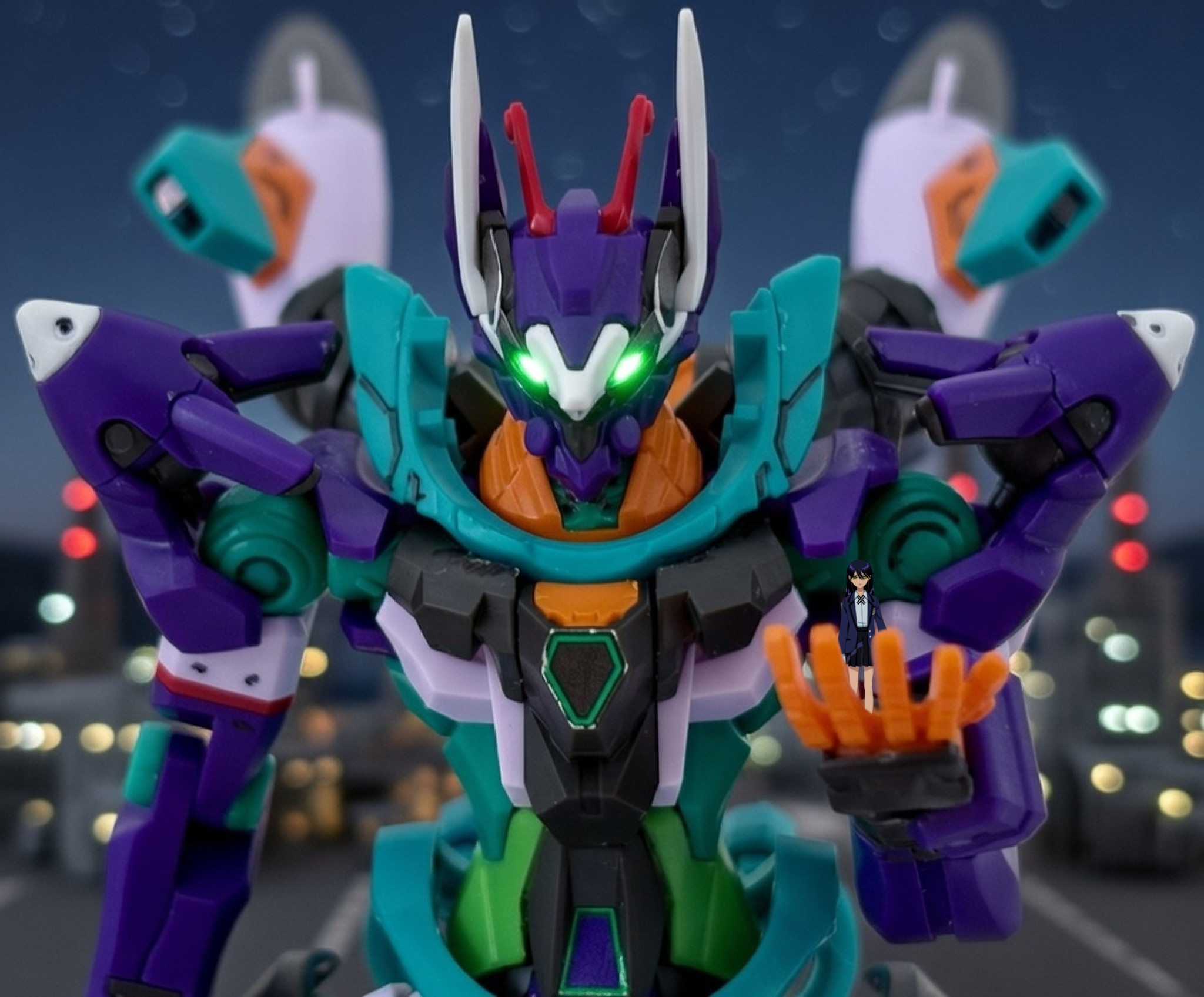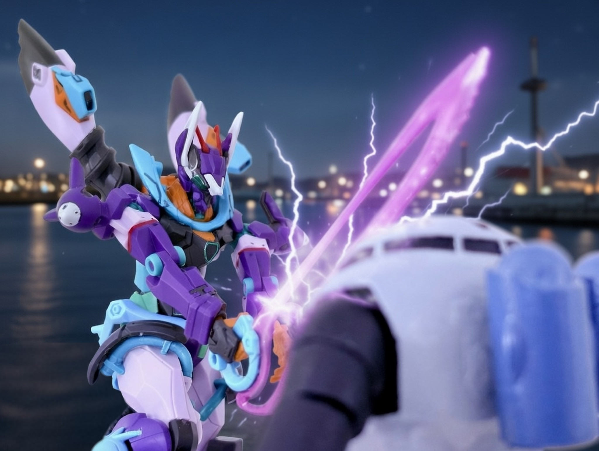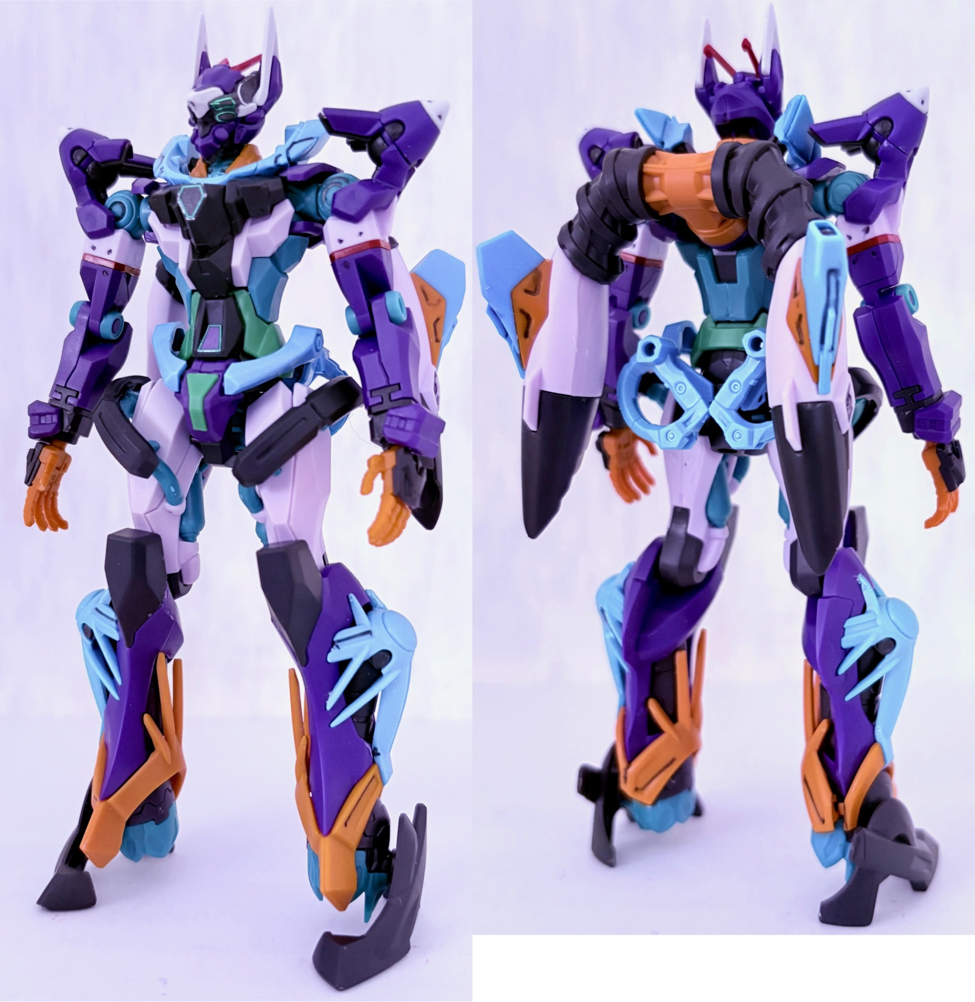 フロントビューとリアビュー。紫色の機体とキツネか猫のような耳(ビット)が特徴。恥ずかしながら小生は初見でコイツを見た時にトランスフォーマーのレーザーウェーブ(ショックウェーブ)を思い出してしまった(zaku-kao4)