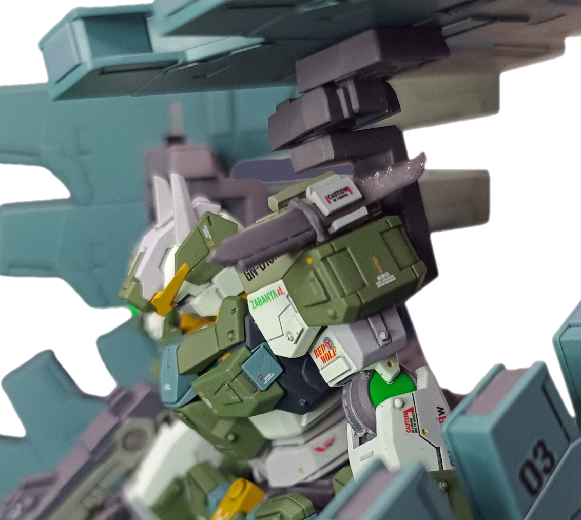 肩とボディ左右にGNコンデンサをオープンするギミック。物足りなかったので、ボディの上下も切ってオープン!なんかウイングガンダムみたいになってしまったw