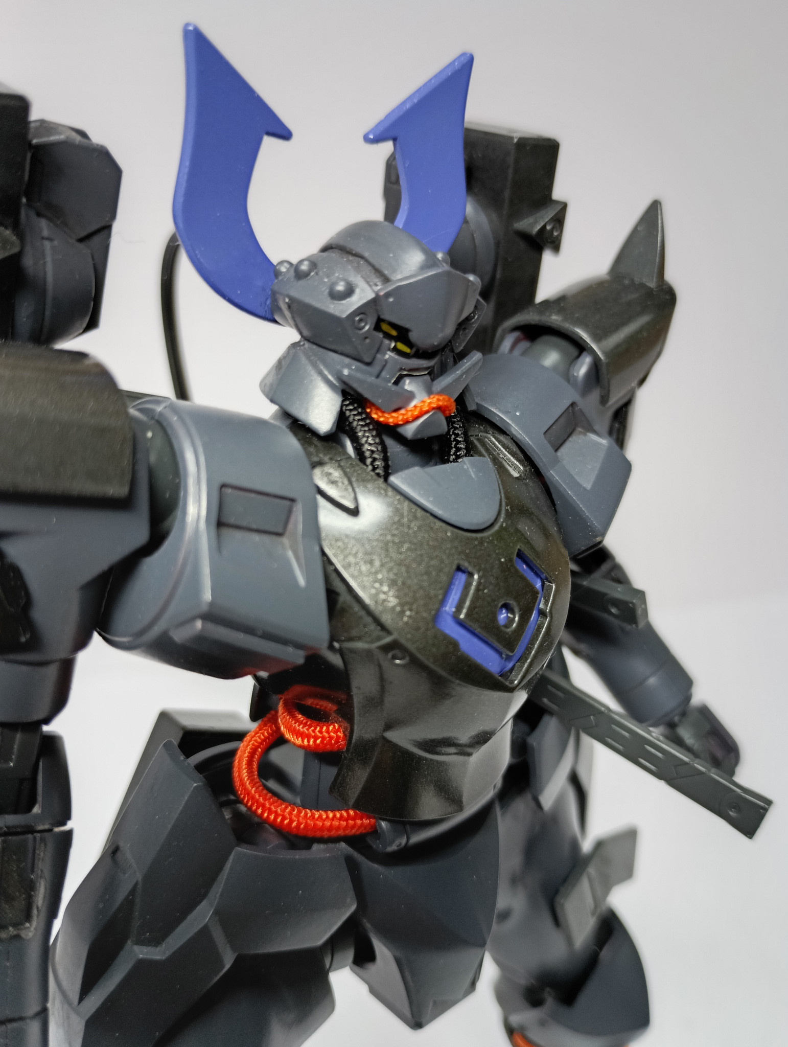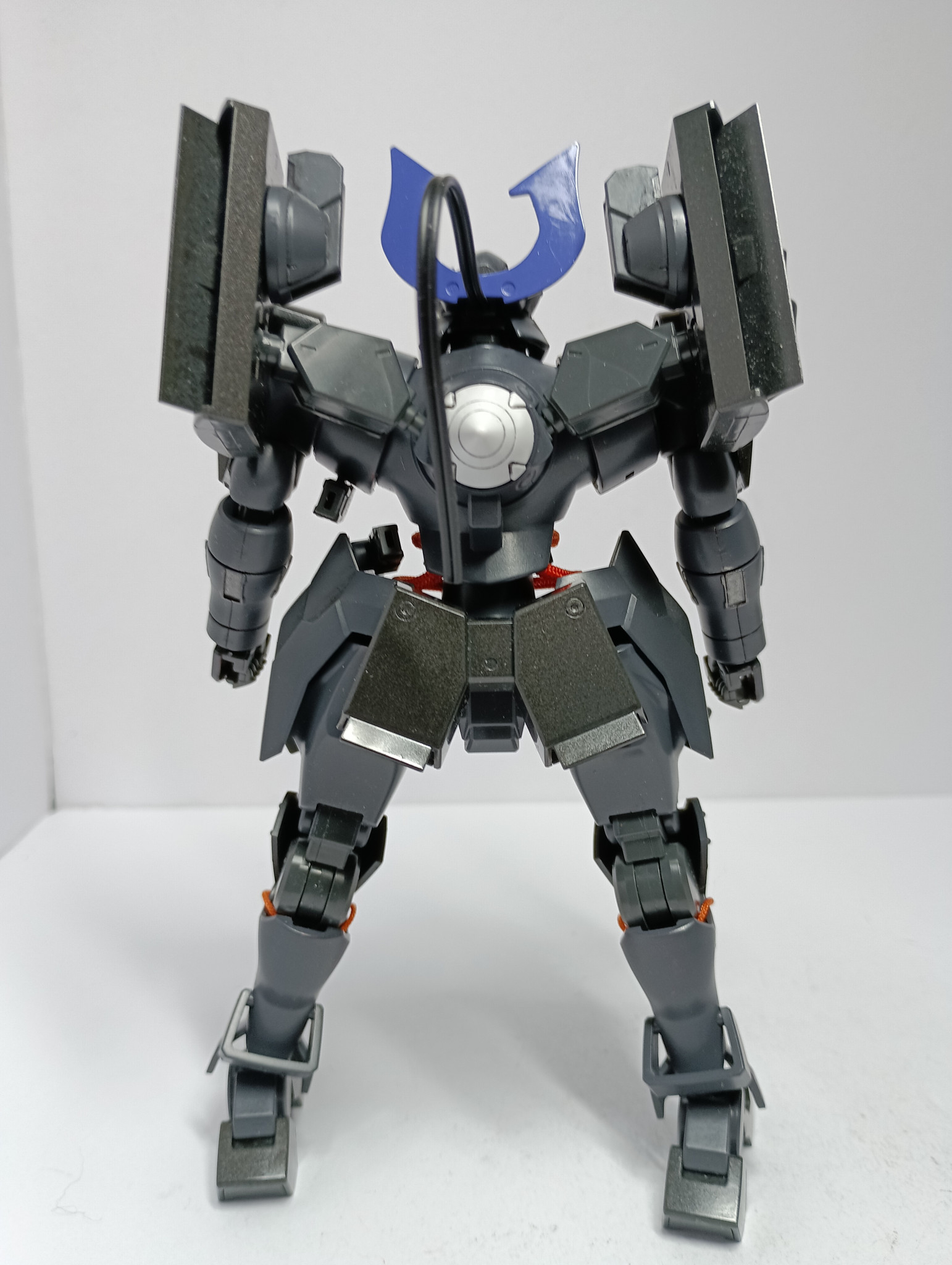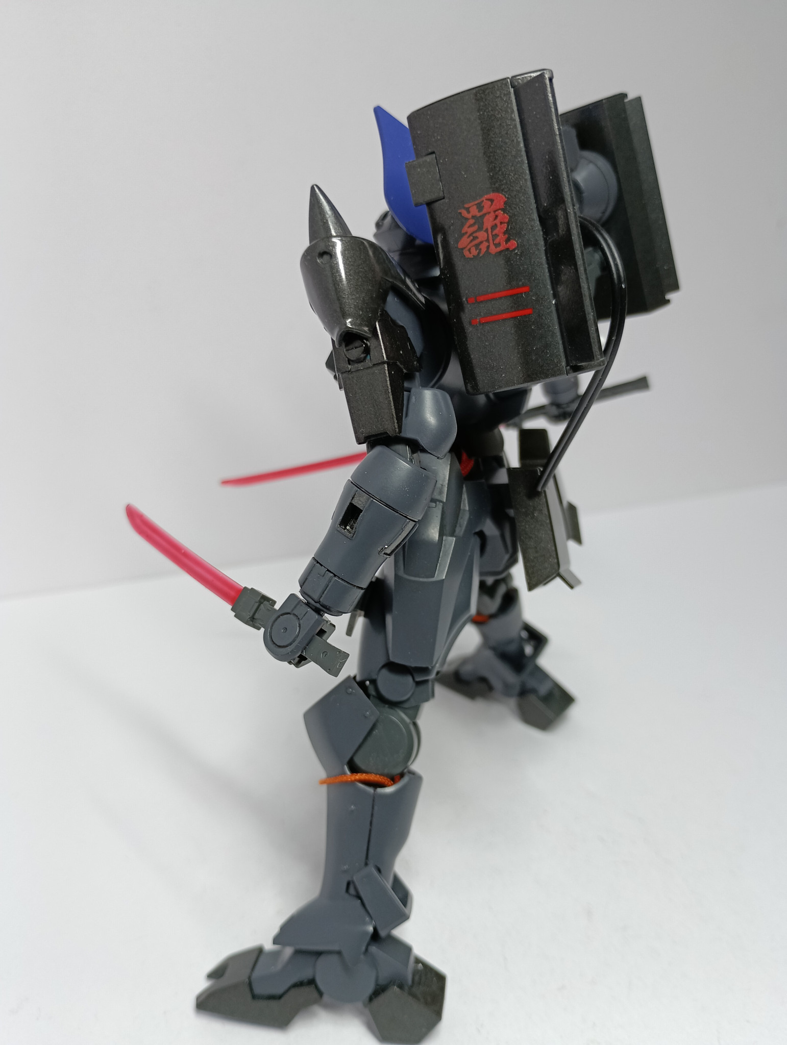 元々プロポーションが非常に良いので、プロポーションはそのままで、さらに武者感が出るようジャンクパーツを取り付けてます。オレンジの紐みたいに見えるのは、GN粒子伝達用のコードとなります。