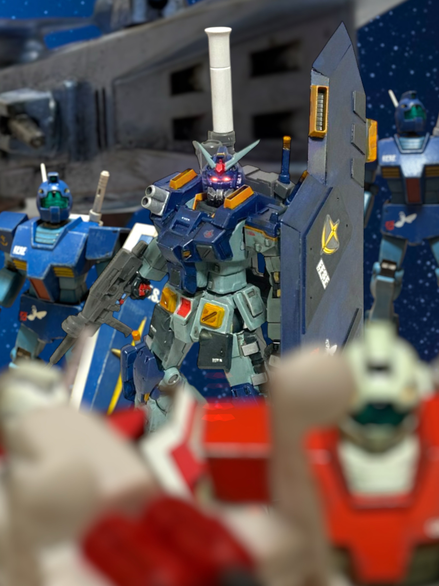 このキャラクターを主役に、というのが、企画のスタート地点の一つでした。「臆病者の嫌味爺ィ」とか「キャプテンアメリカ風の真面目なお兄ちゃん」とか、色々アイディアを出し合いましたが、妻子との関係や、巨大な盾を持ったガンダムなど、諸々のアイディアをまとめて、現在のキャラクターに収まりました。