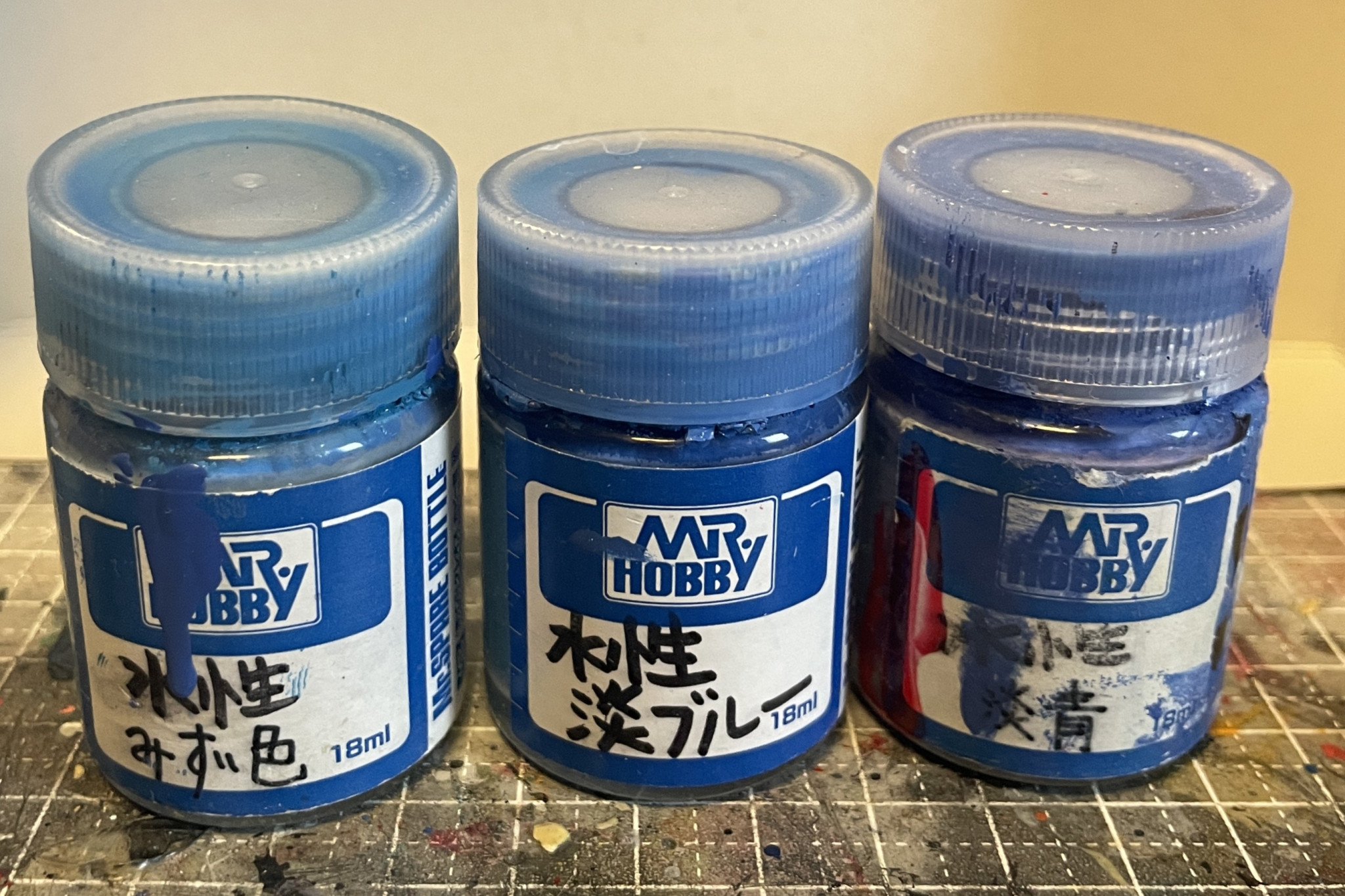 このホワイトをベースに塗料を作れば、基本的に隠ぺい力の高めの塗料が出来上がる寸法です。いくつかのスペアのボトルに白を分けて入れて、異なる分量の青色を注げば・・・??