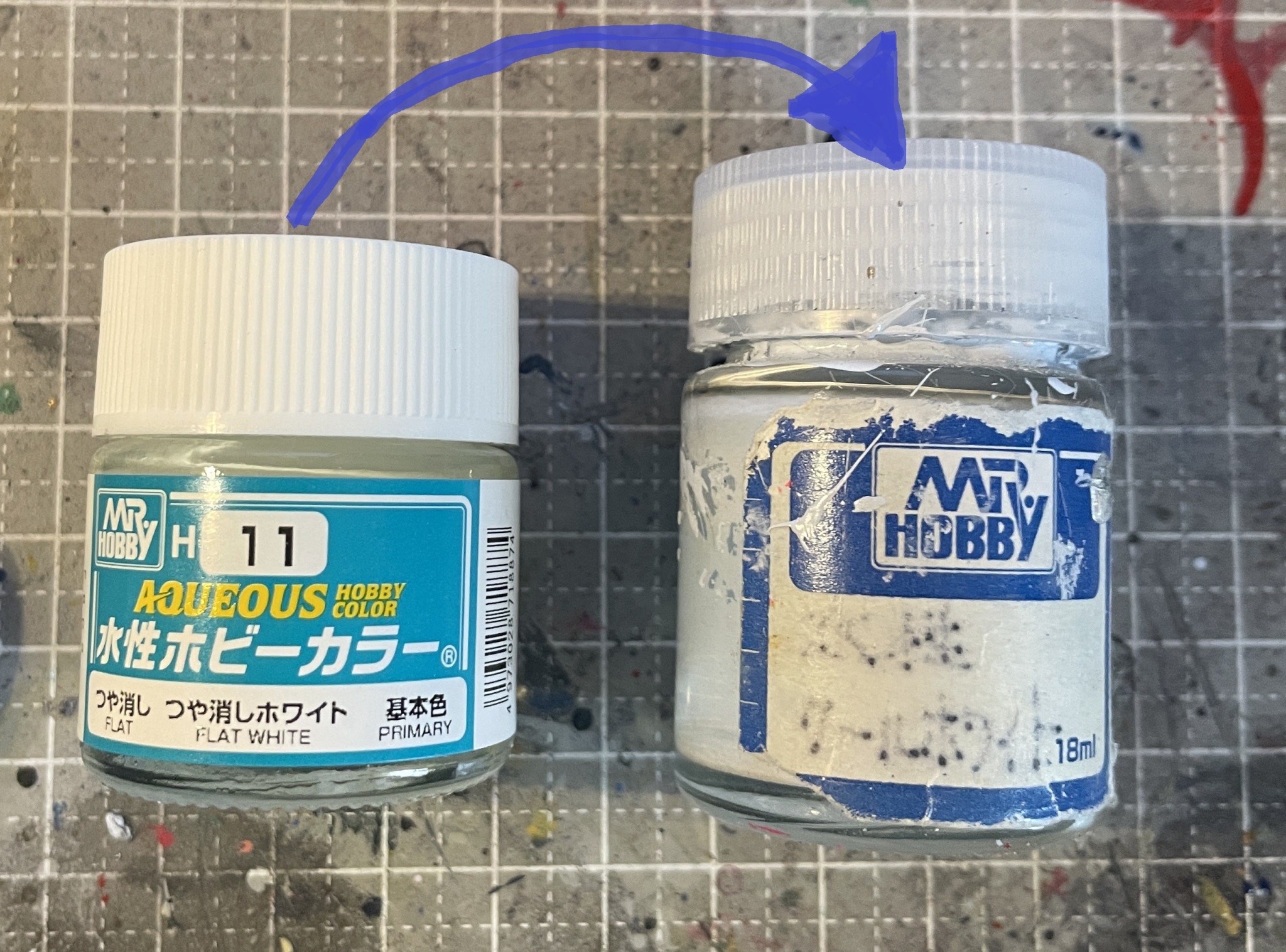 まず、新品の艶消しホワイトを、スペアボトルに一本丸々いれます。そこに、色を少しずつ加えていきます。