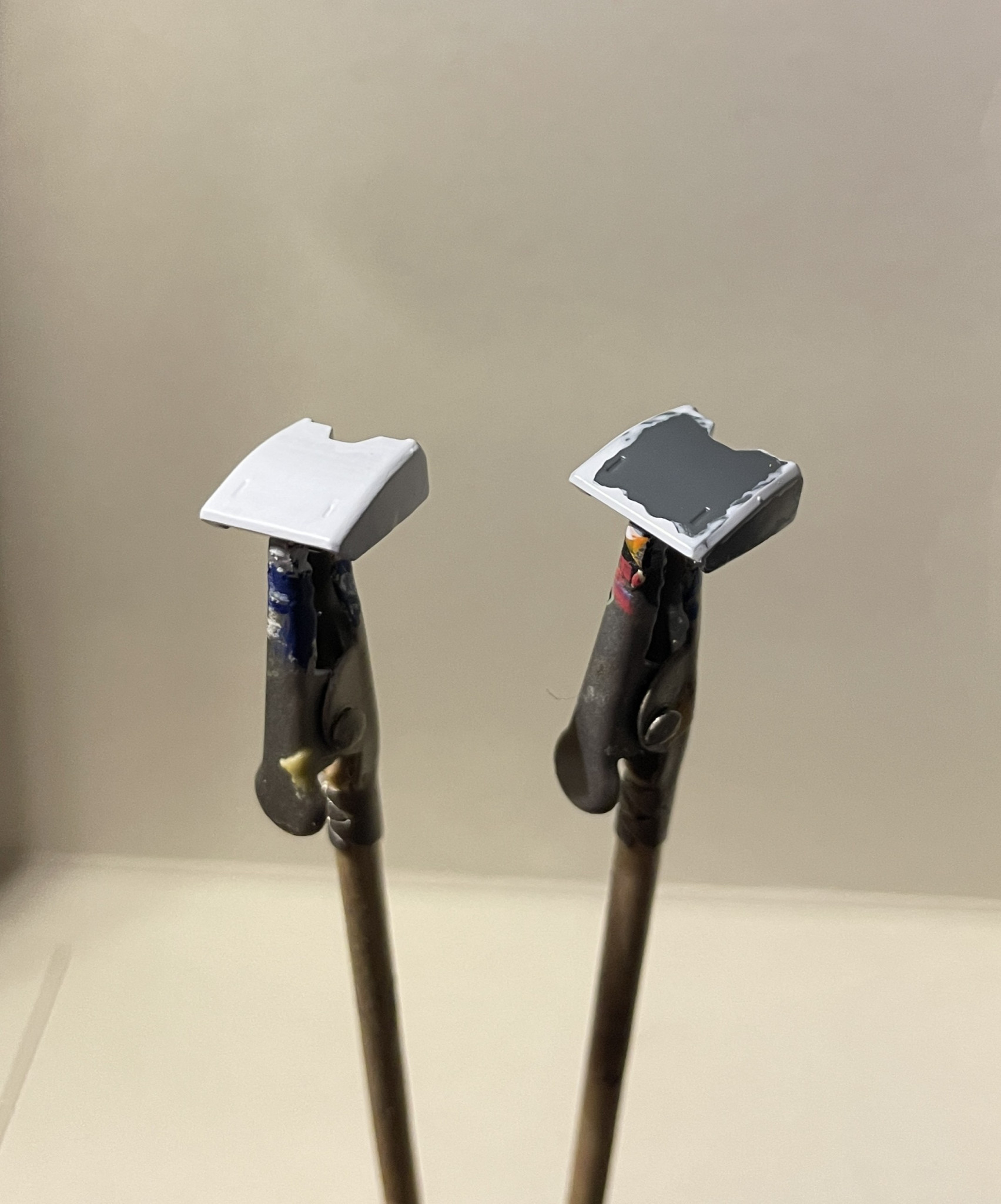 そう、角ばったパーツに白は鬼門。でも裏技は在ります。こうしたパーツで色がノリにくいのは、いわゆるエッジの部分のせいです。
