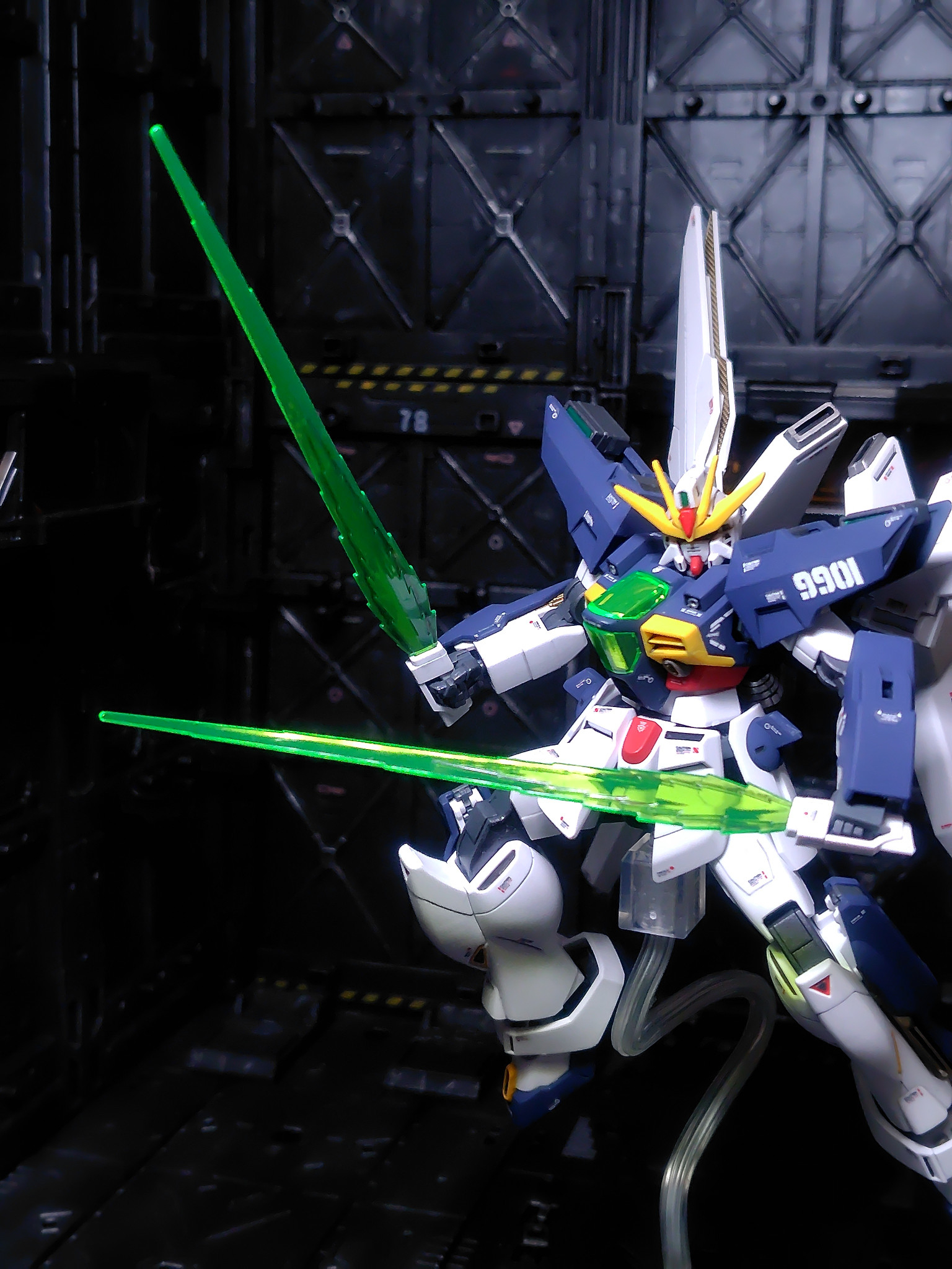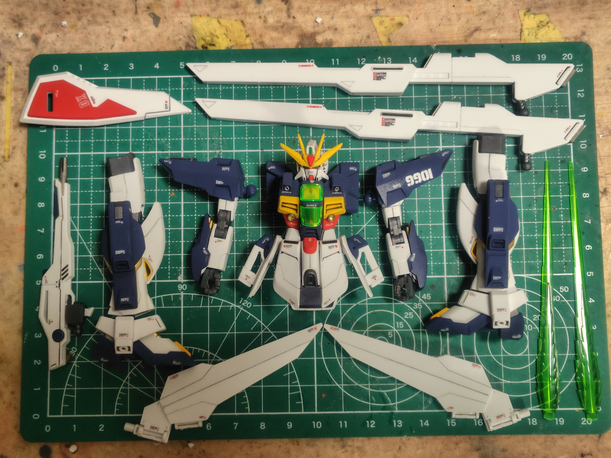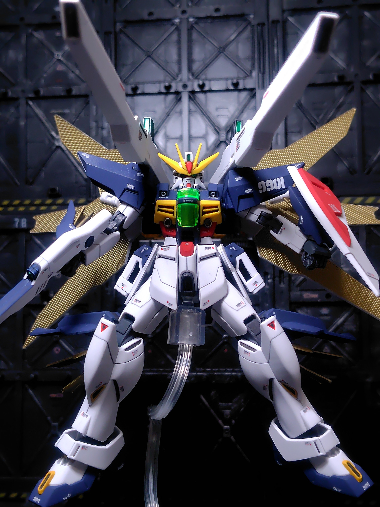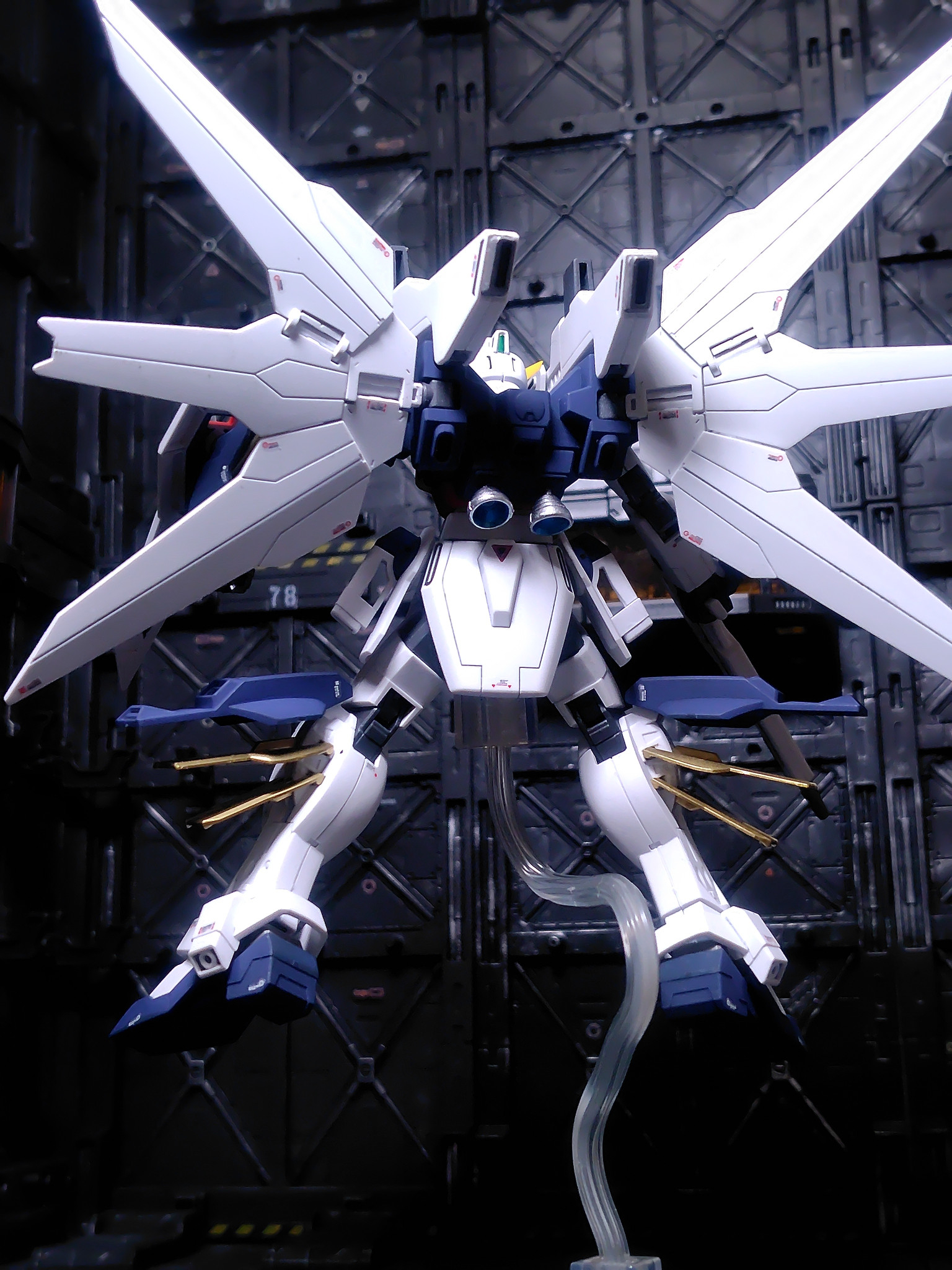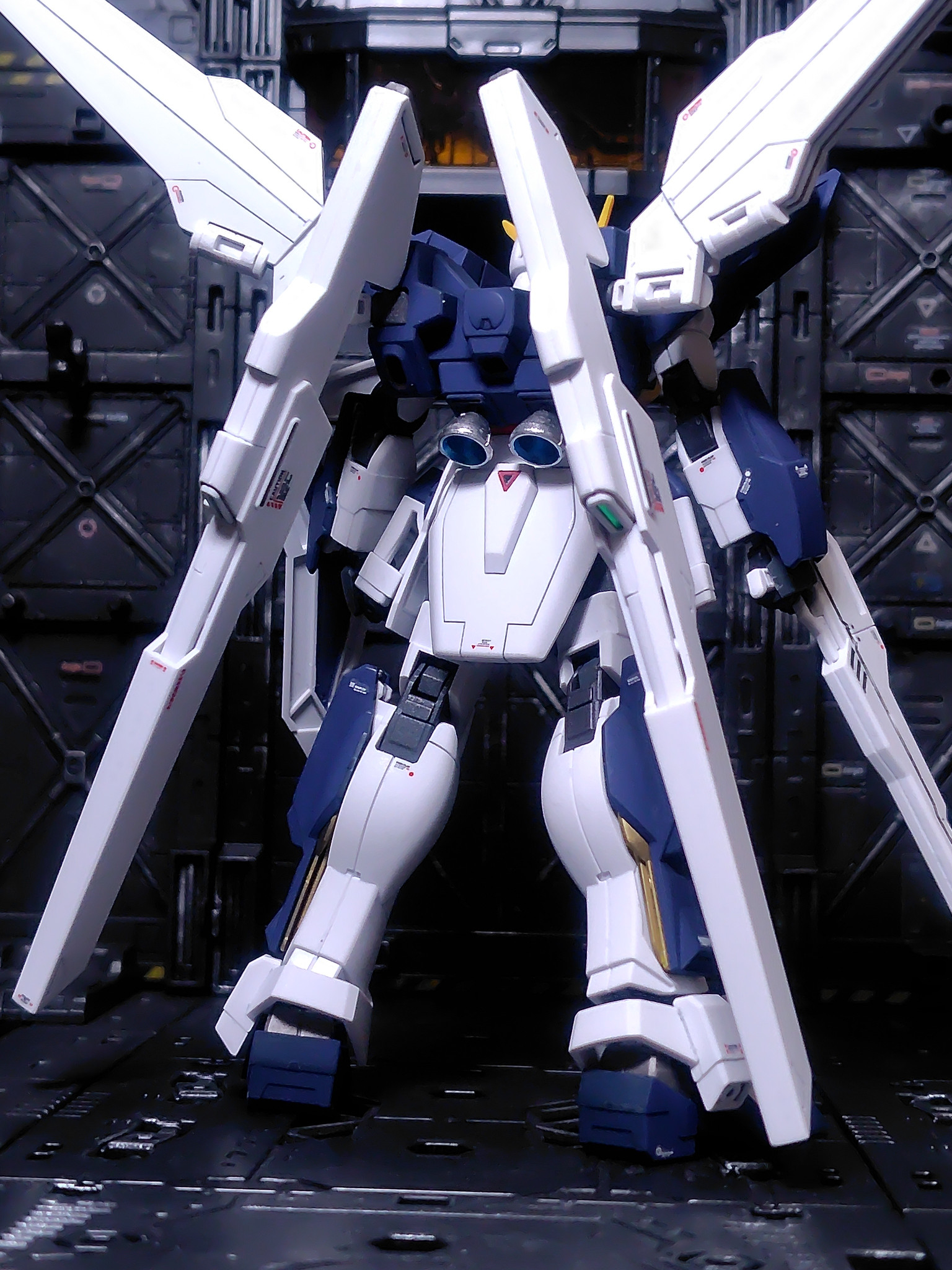 スラスターはシャインシルバーとメタリックブルー。ツインサテライトキャノンの合わせ目は前半分は普通に消して、後ろ半分は段落ち化。ライフルとふくらはぎも段落ち化。