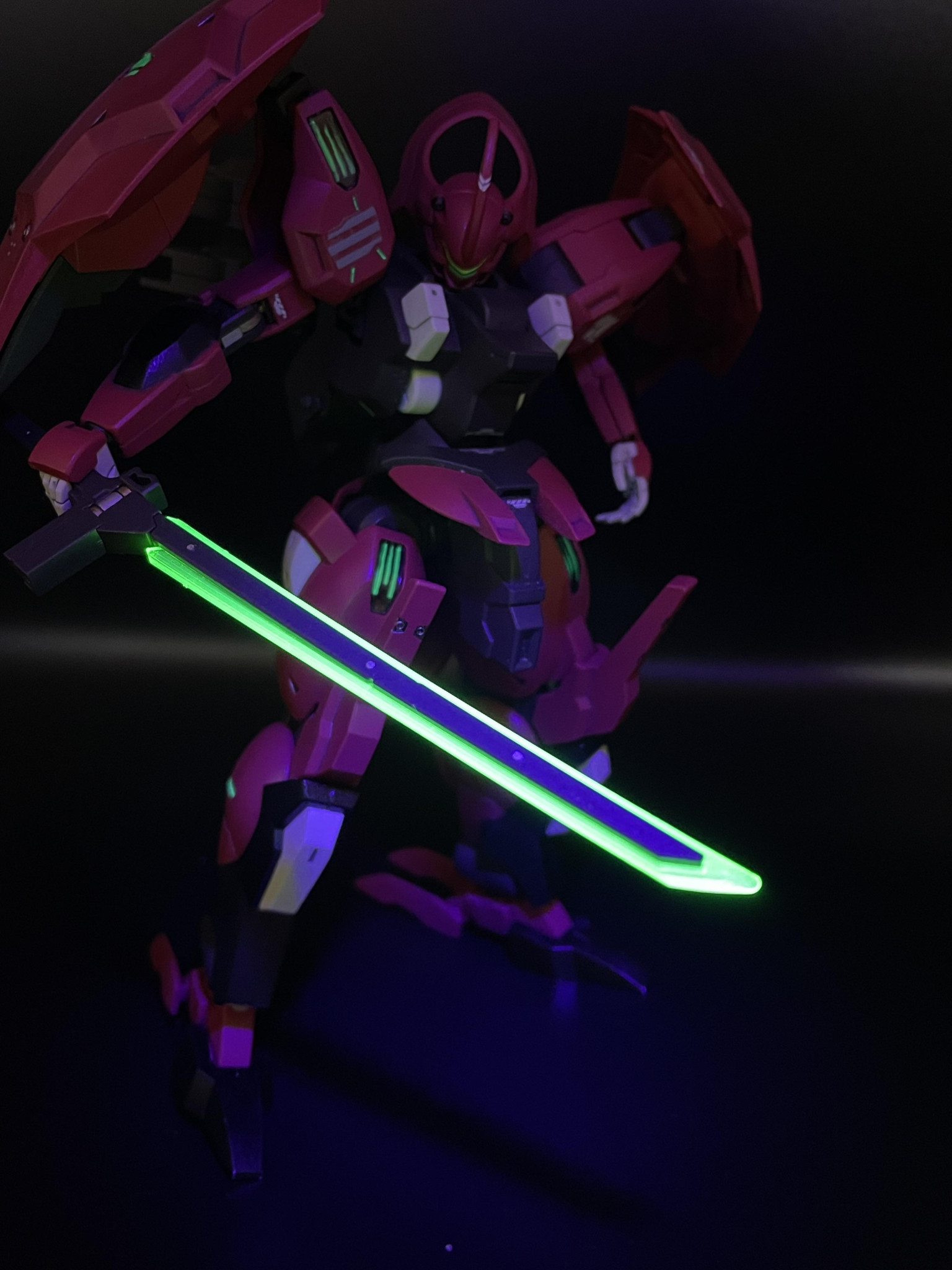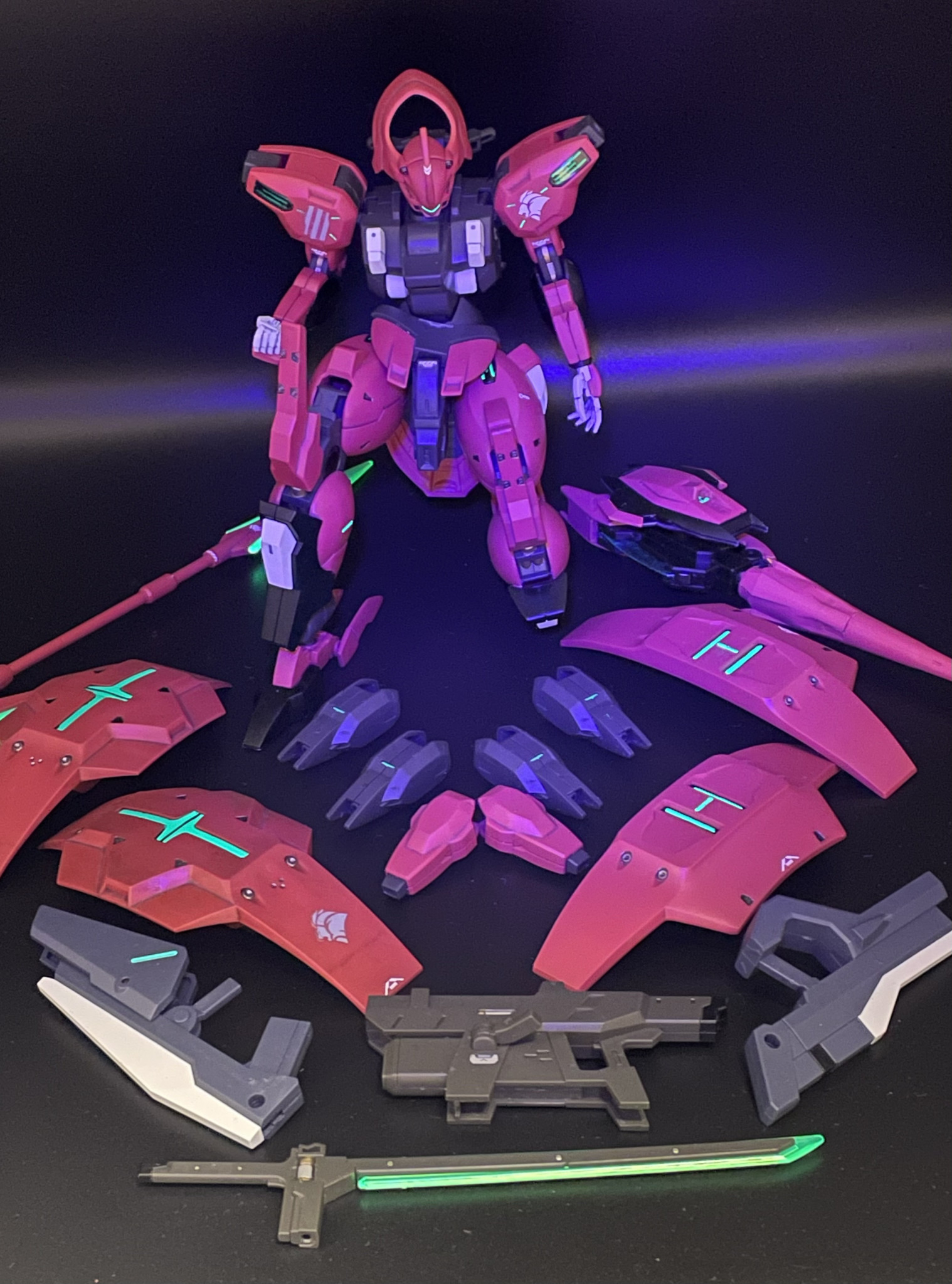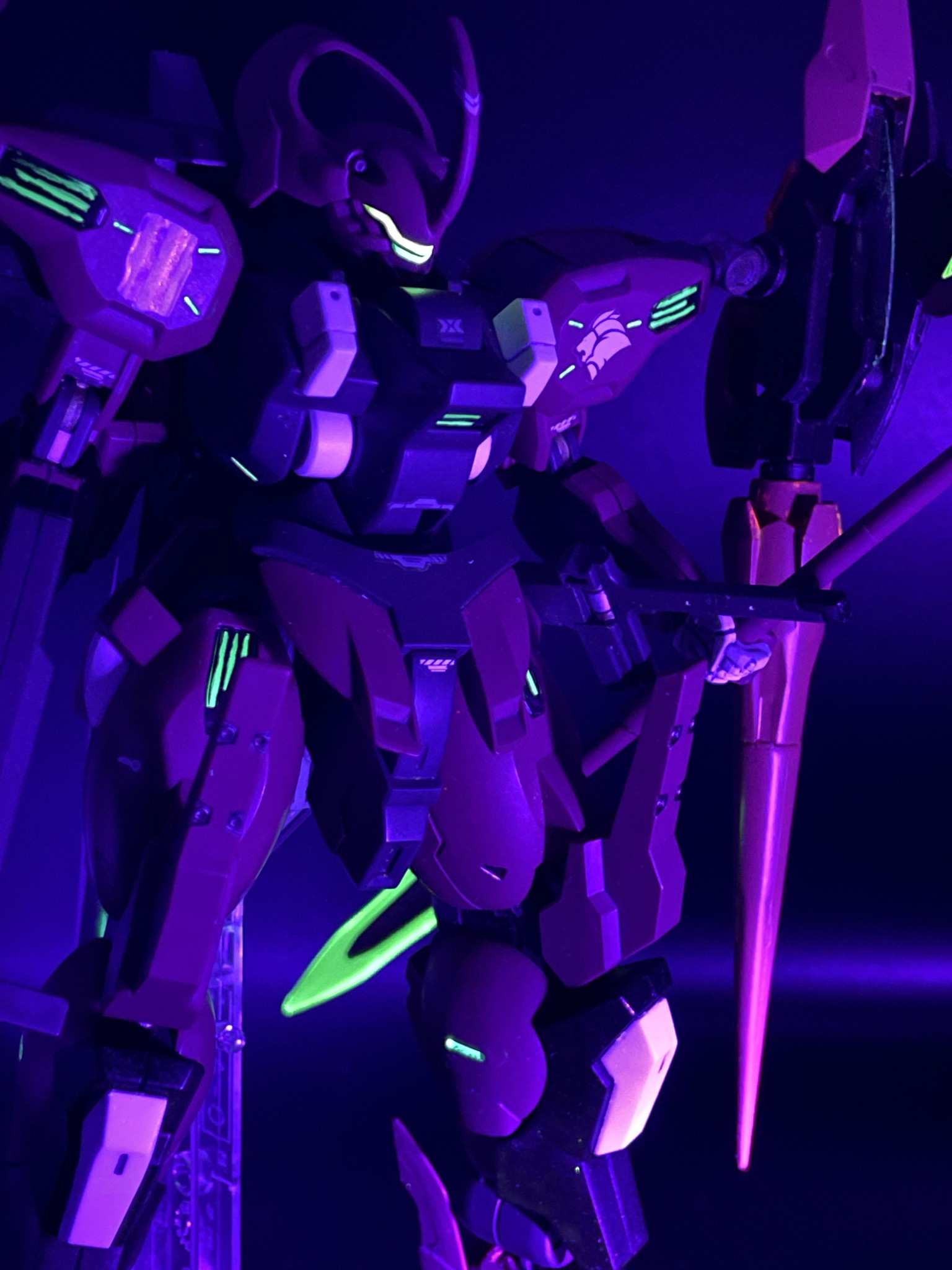 全身緑発光(意志拡張AI)を増設、UVライトに反応、元からある肩のシールも蛍光塗料で塗り直しました。
