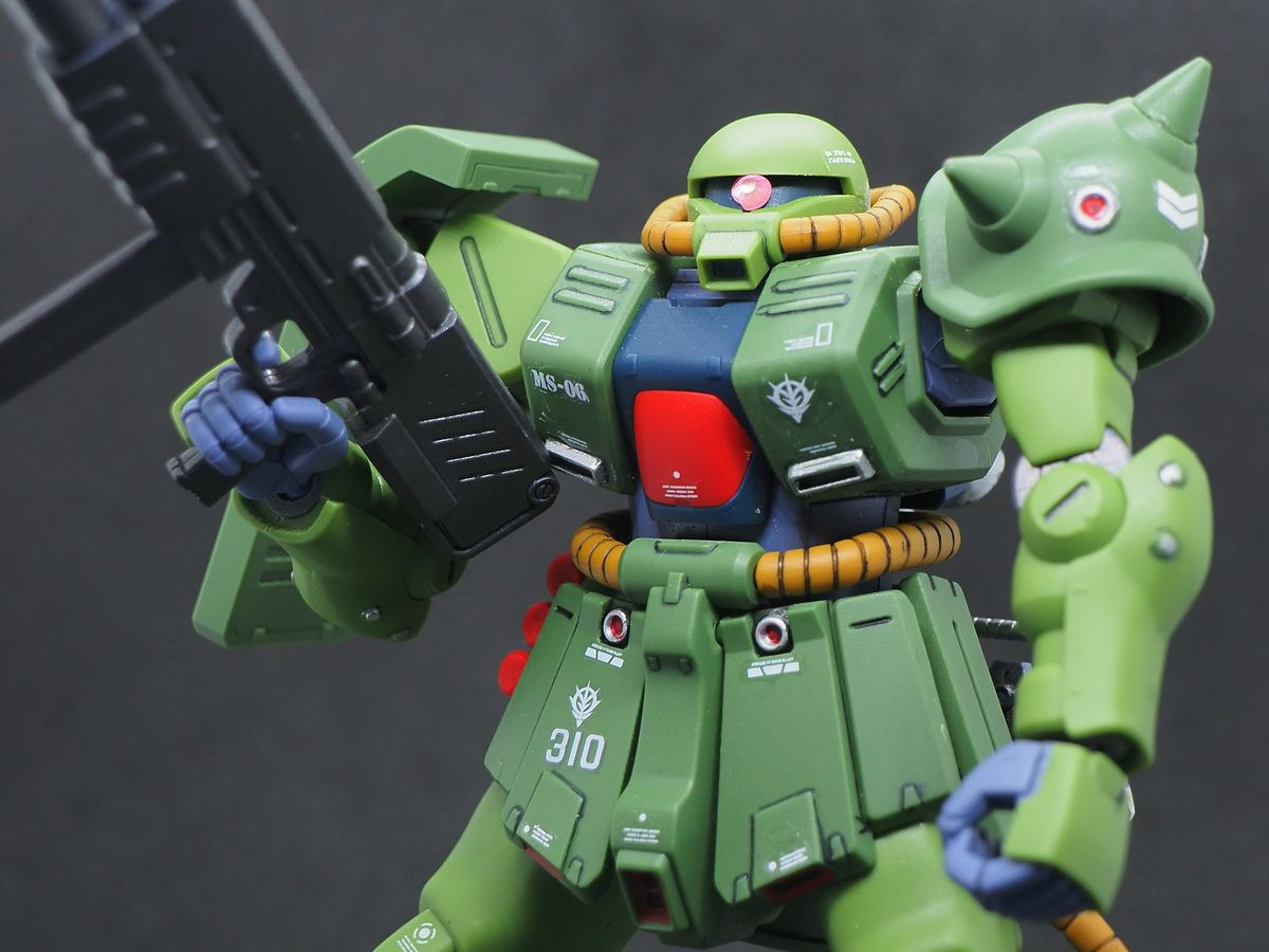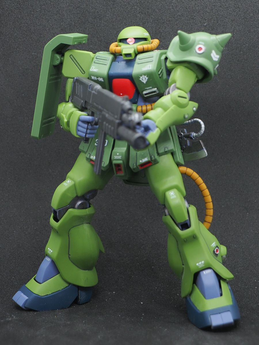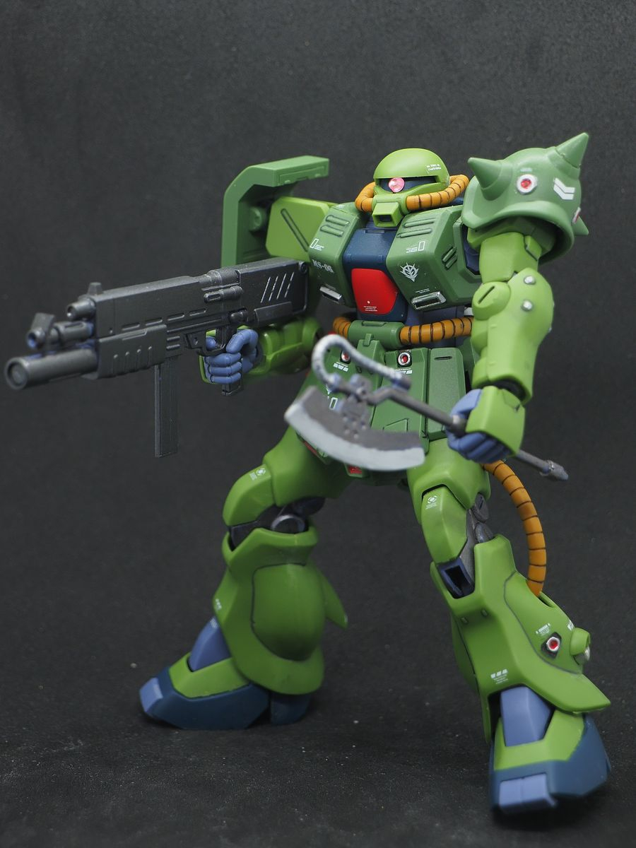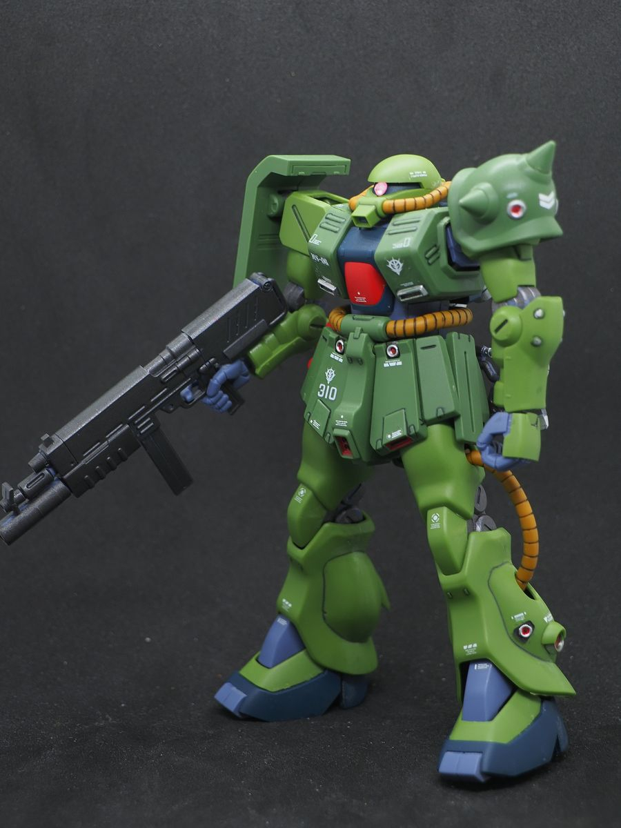 リニューアルは、全ての関節を焼き鉄色で塗装、アポジモーターをジェラルミンで塗装、マシンガンはガンメタル、モノアイは100均のデコシール、デカールは貼り替えています(zaku-kao2)