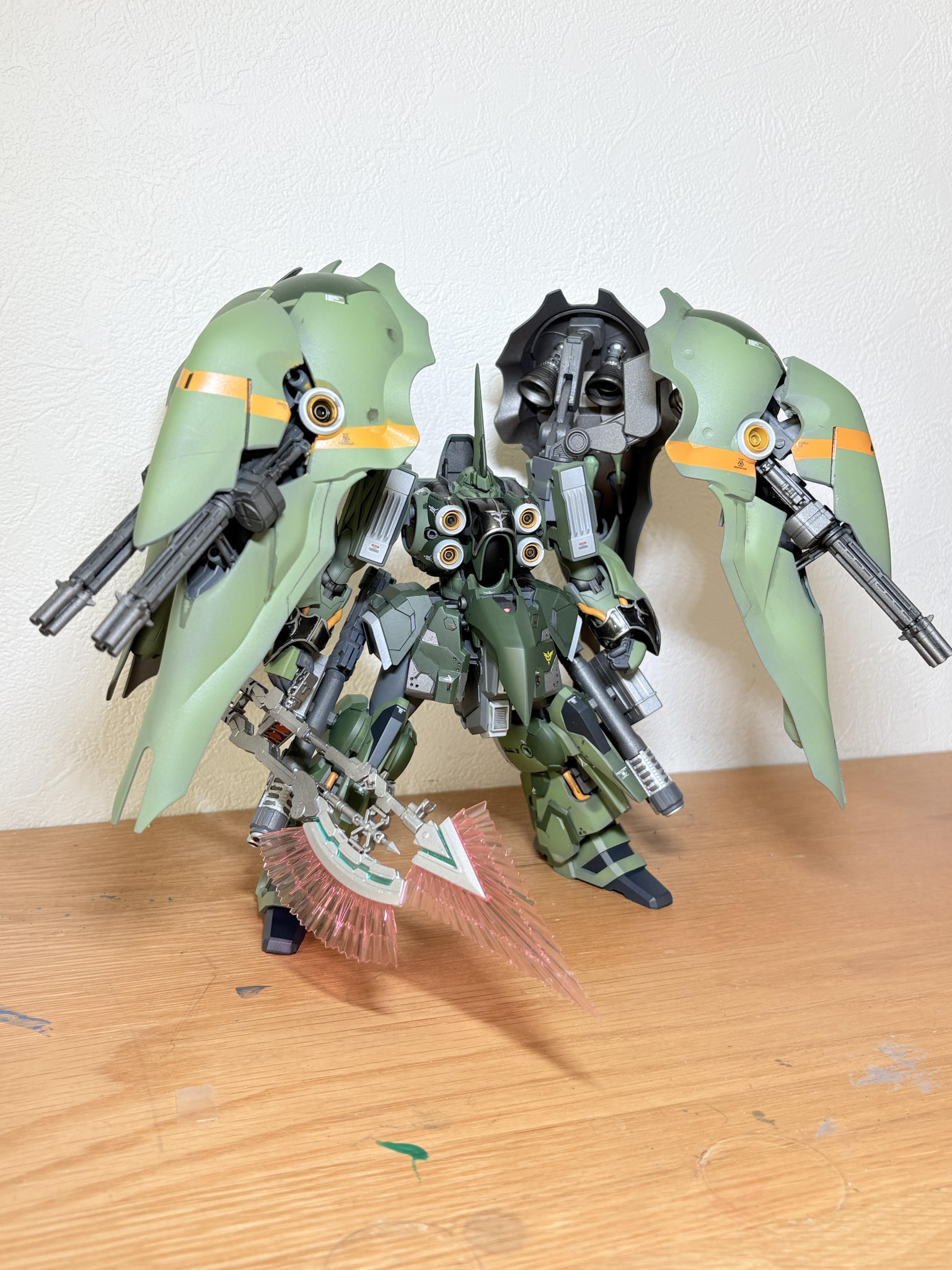 武装プラットフォームという設定なので、ファンネル以外にも武装乗っけたいよね、ということでRGフルアーマーユニコーンよりビームガトリングガンを借用。バインダーから直結したエネルギーで動作するので比較的威力も高いんじゃないでしょうか。知らんけど。 ちなみに開け閉めもできます。