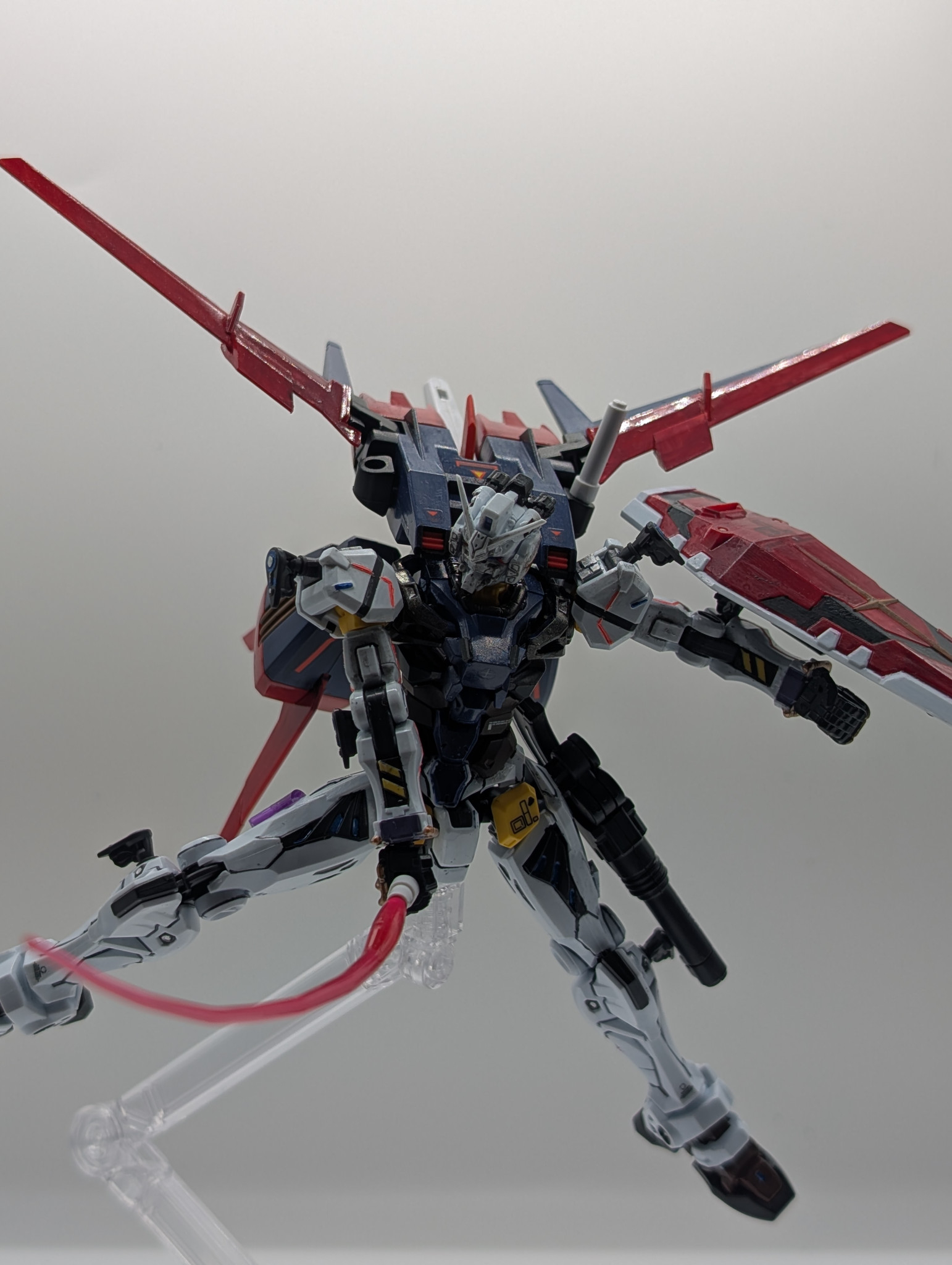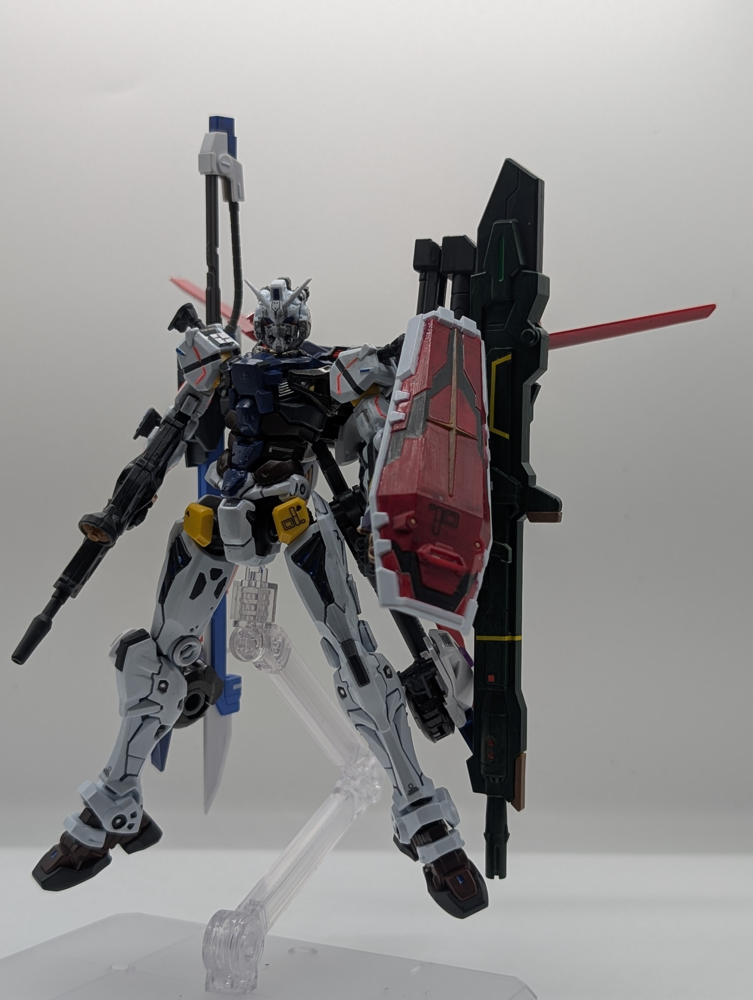 パンツァーアイゼンはつけられるんですがパーツを無くしてしまい断念しました。脚部に追加スラスターを装備、ガンダムフレームの胴体部分と他ジャンクパーツで作成し、キットに付属しているジョイントパーツを埋め込んで接続してます。シールドはマイダスメッサーなどと同じ位置に装備させました。