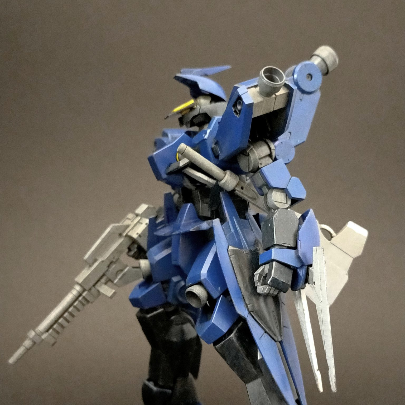 グシオンの時と違ってグレイズのフレームは共通なので、ニコイチでも問題なく作れました。 塗装は紫の上に青を塗り重ねたら中間的な色合にならないかなと思いながら塗ったらほぼ青になりました。 塗る順番を逆にするか、もっと薄く塗ればよかった。 頭部のセンサー部分に少し手を加えたのですが、どうせならグレイズのセンサーパーツを流用したほうが良かったかもしれません。