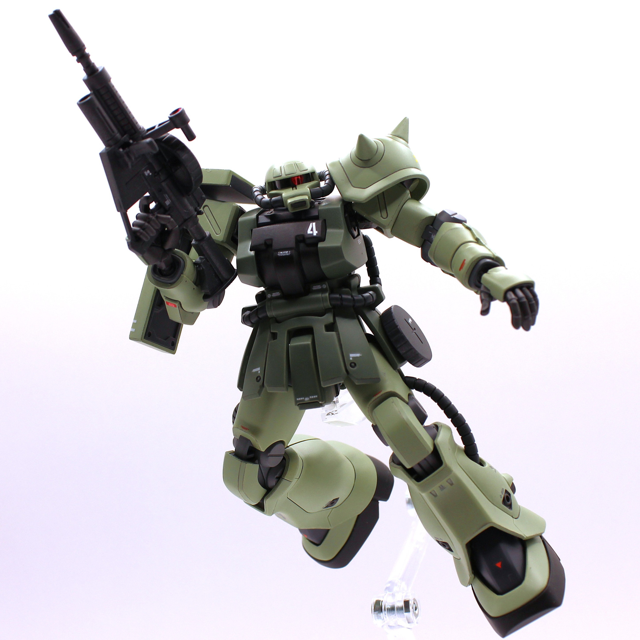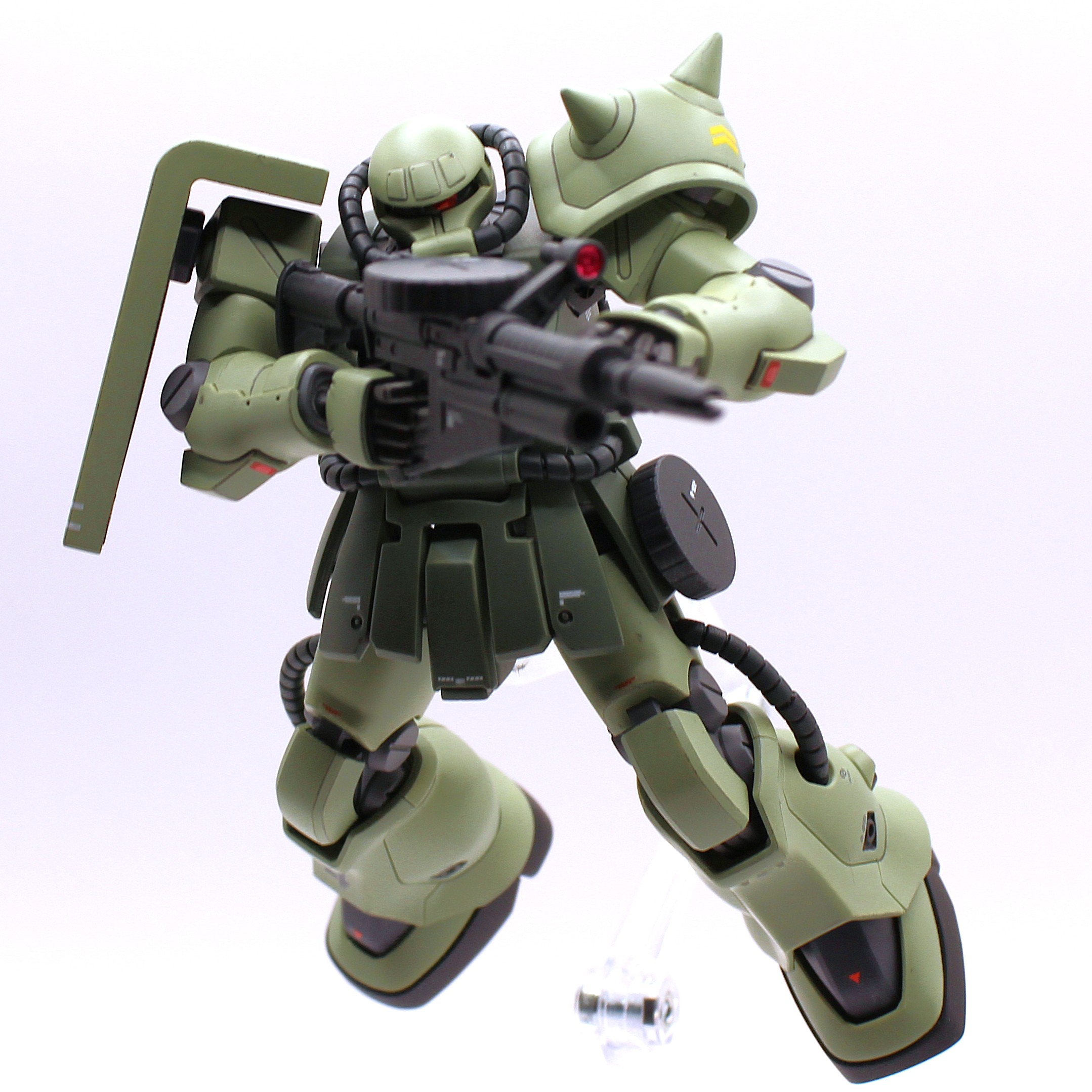 手首が角度付き、肩関節付け根がスイング可能なので、ザクの定番装備のザクマシンガンやザクバズーカの両手持ちがさせやすいのもこのキットの美点ですね。