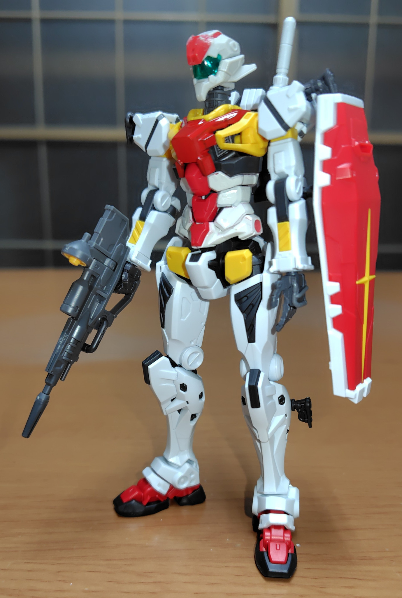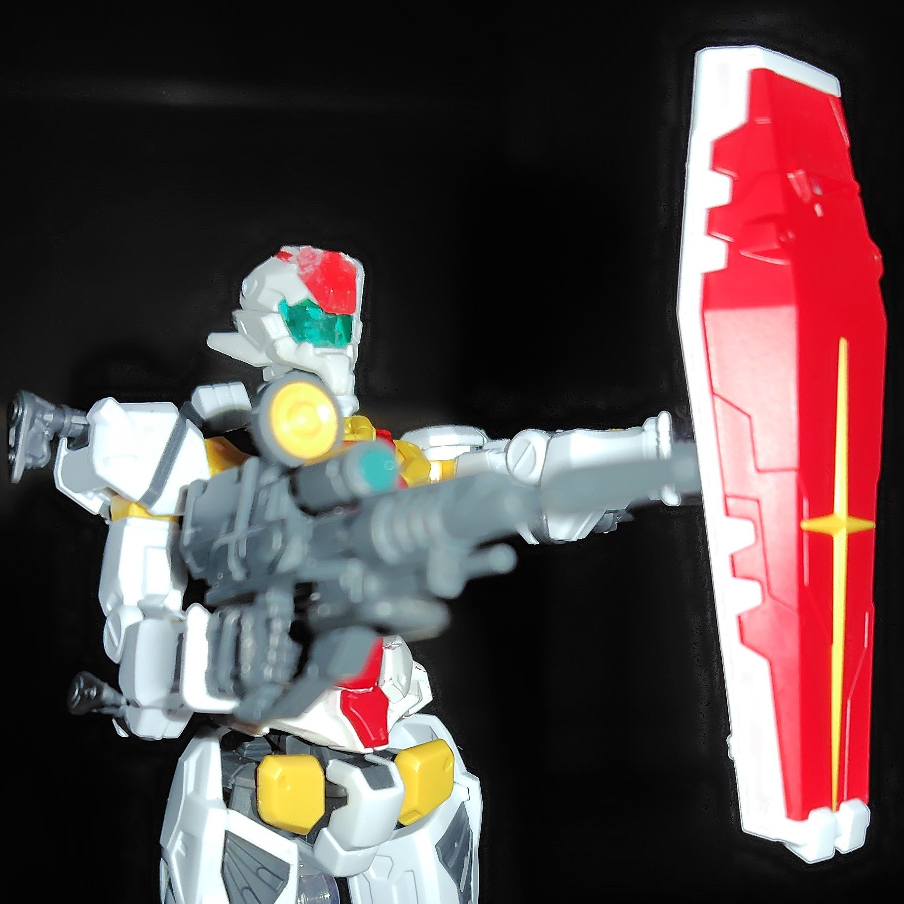 全体像。下半身と両腕辺りは「白いガンダム」胴体は「赤いガンダム」による塗装でジムに似通わせてる。首と頭部は「軽キャノン」を流用。盾は「白いガンダム」の物だがビームライフルは軽キャノンのライフルを使用。ビームサーベルは左側に一本だけ。