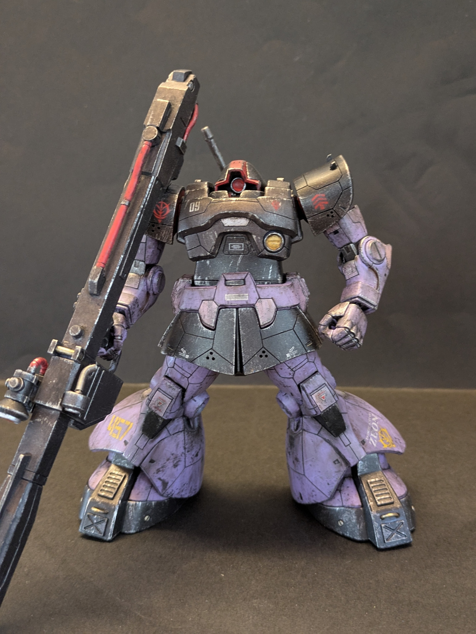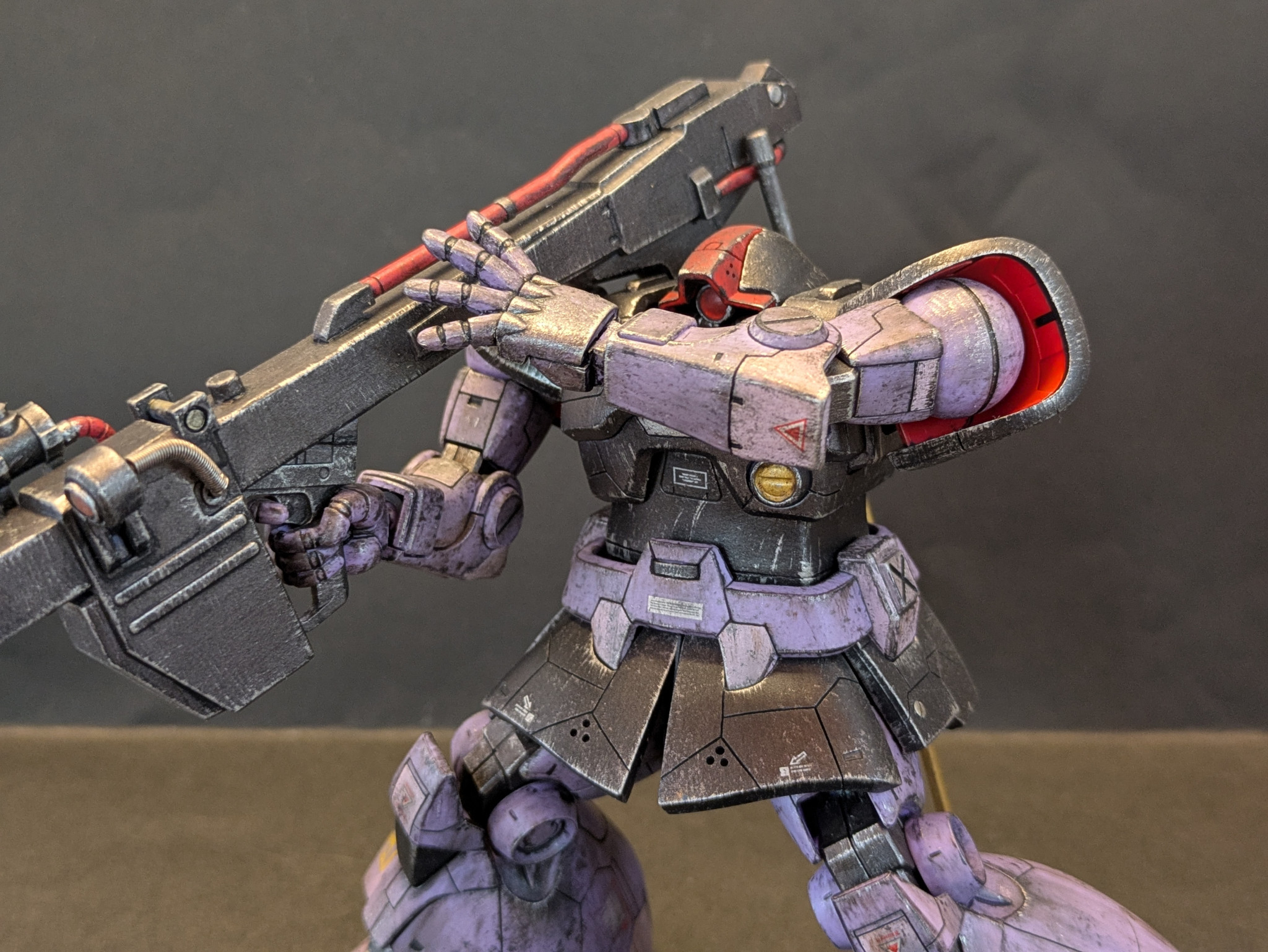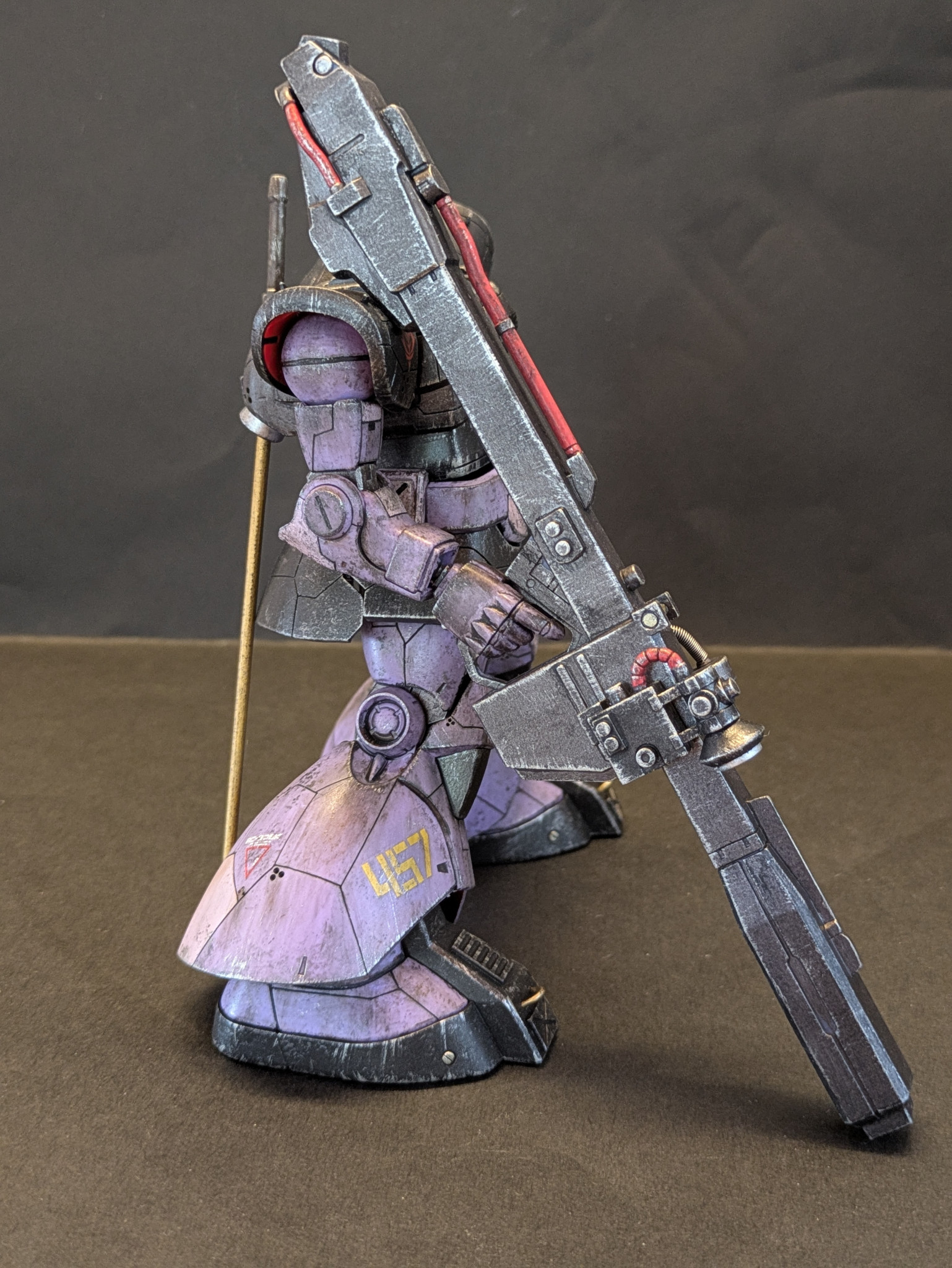 改造としてはモノアイやバズーカのセンサーを市販パーツに変更、胴体を1ミリ延長、頭の接続位置を後部に変更、部分塗装に汚し塗装、スジボリなどを施しました。