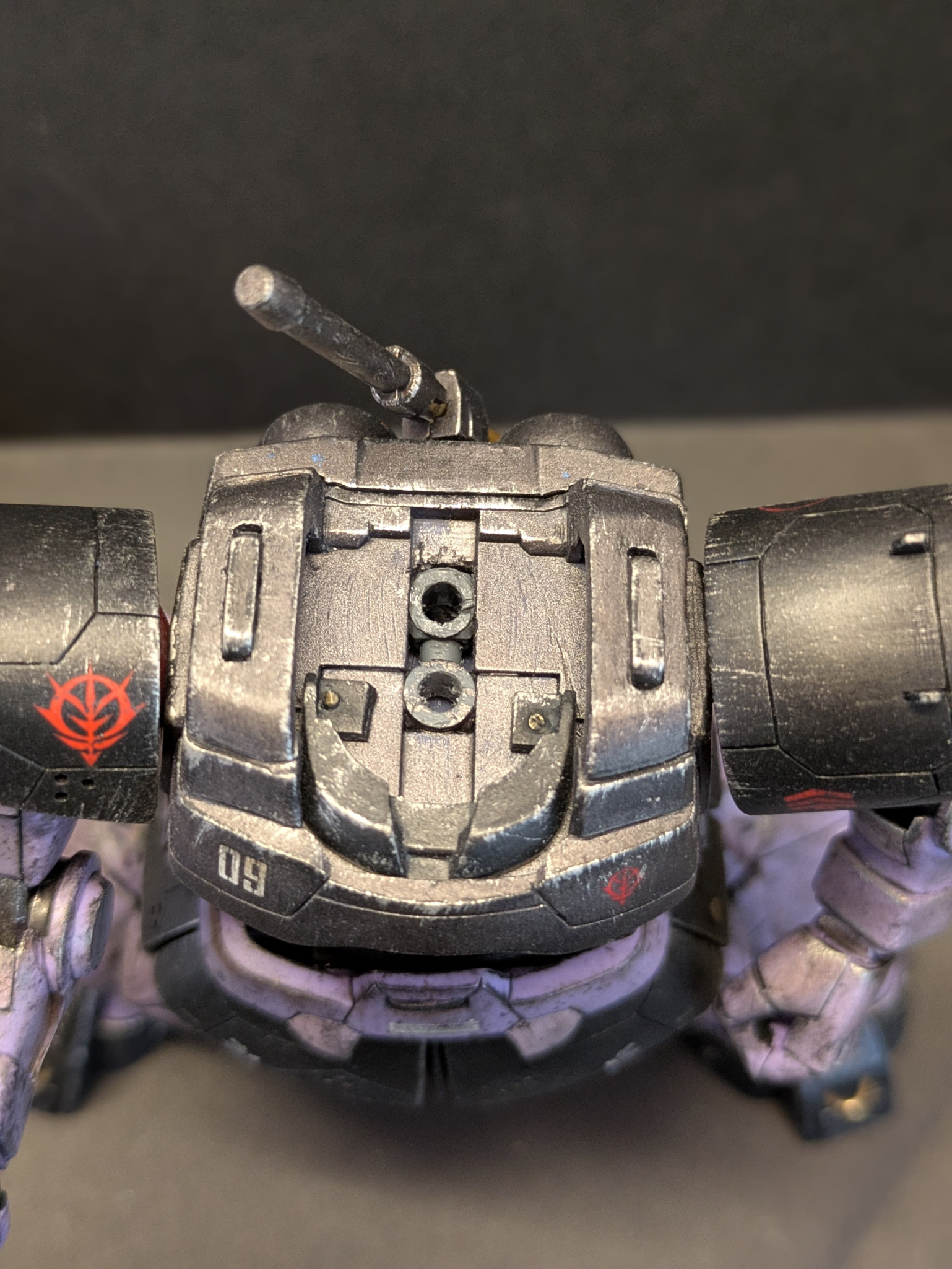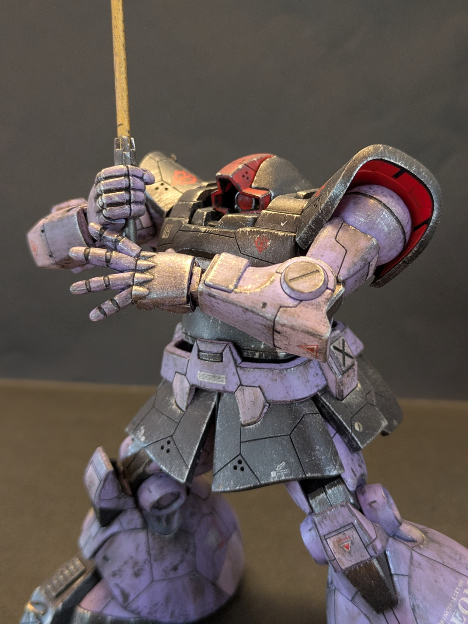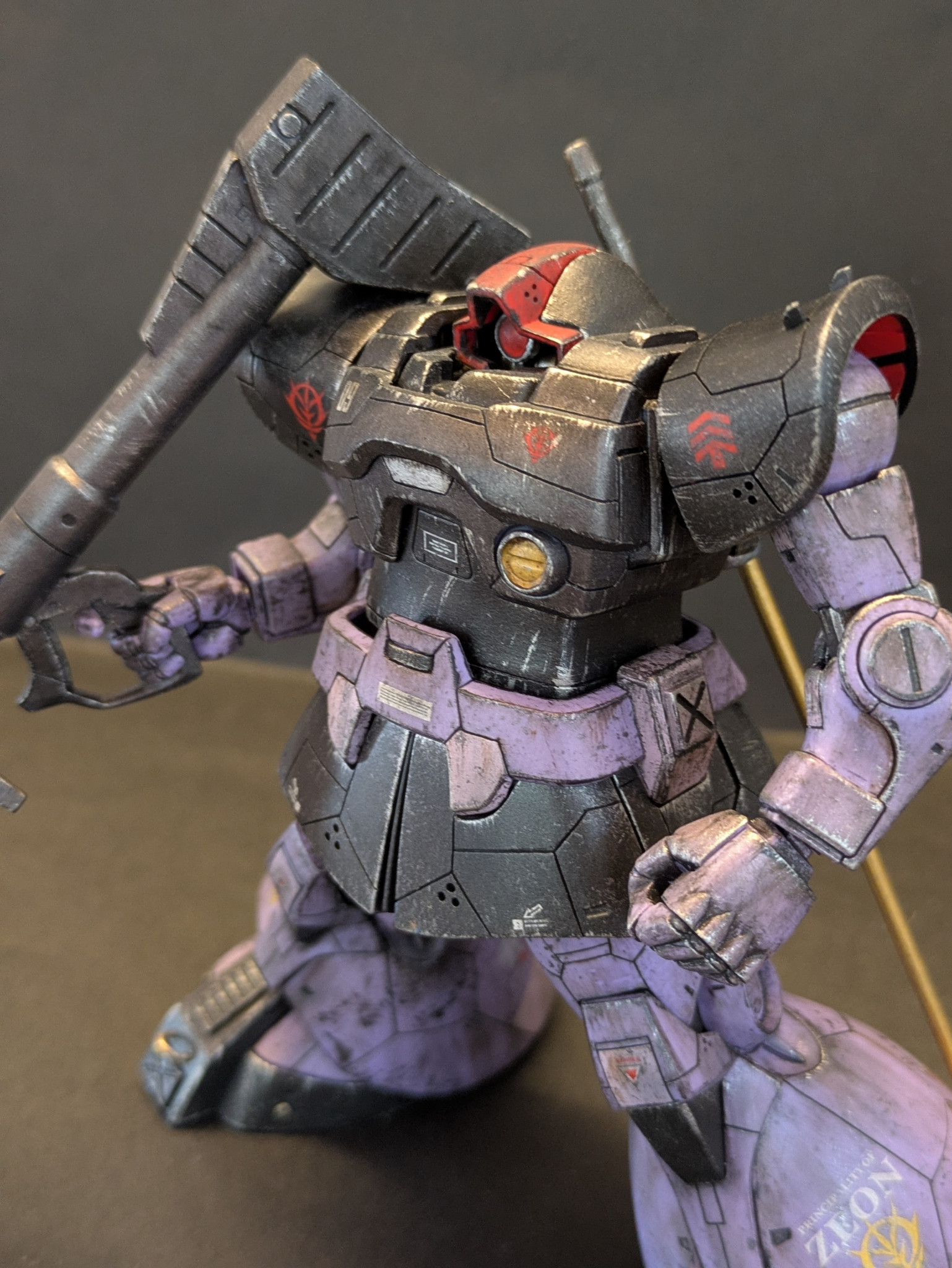 改造としてはモノアイやバズーカのセンサーを市販パーツに変更、胴体を1ミリ延長、頭の接続位置を後部に変更、部分塗装に汚し塗装、スジボリなどを施しました。