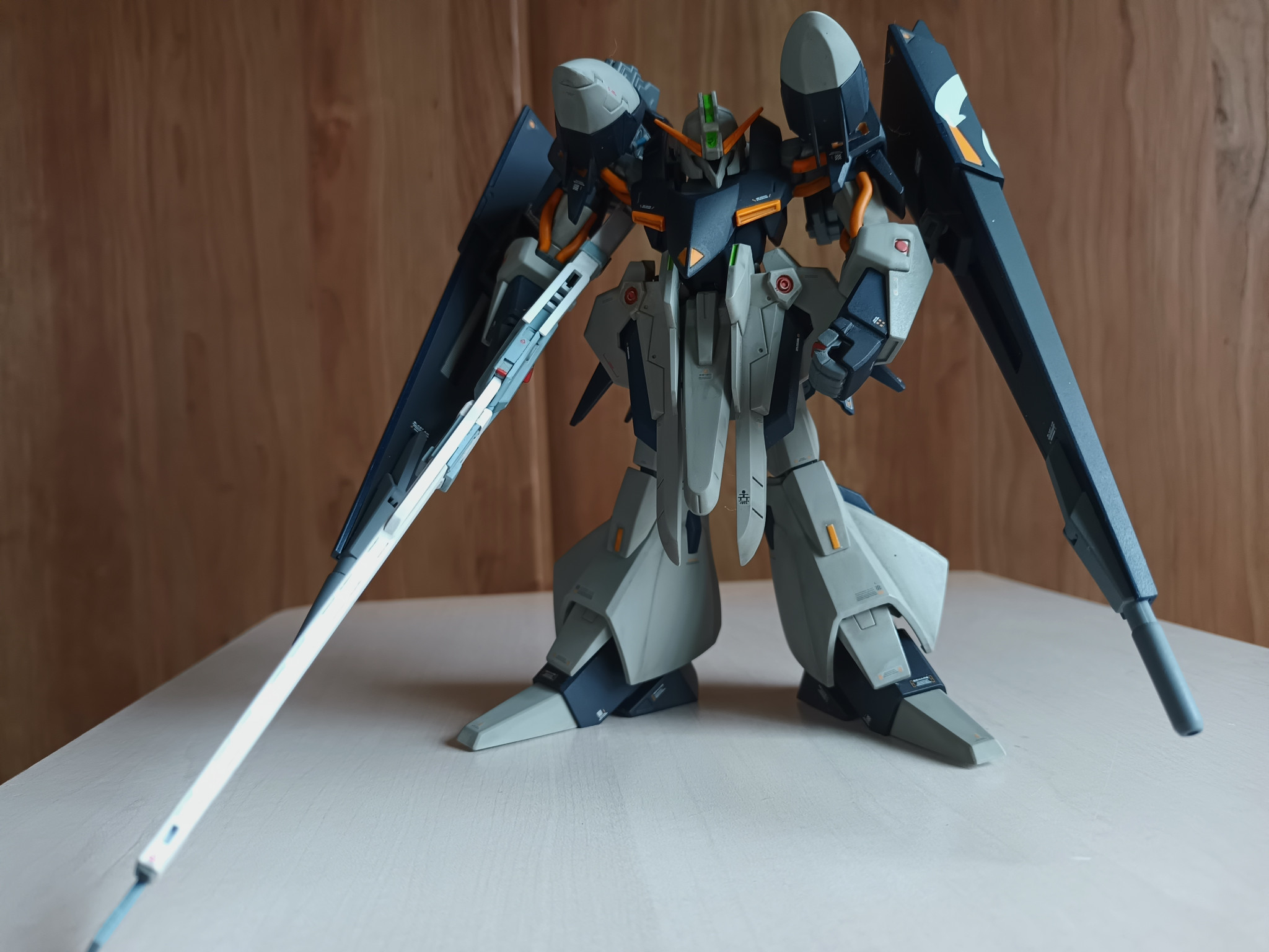 白はギャプランのイメージに合わないなぁと思って明灰白色を使ったらグレイに寄り過ぎました。まぁ何となく気に入ったのでそのまま使いました。バインダーは伸びた状態で固定にして、伸縮レールの隙間を溝付きのプラ版で埋めています。長物のライフルはあえて真っ白にして本体とのギャップを狙ってみました。
