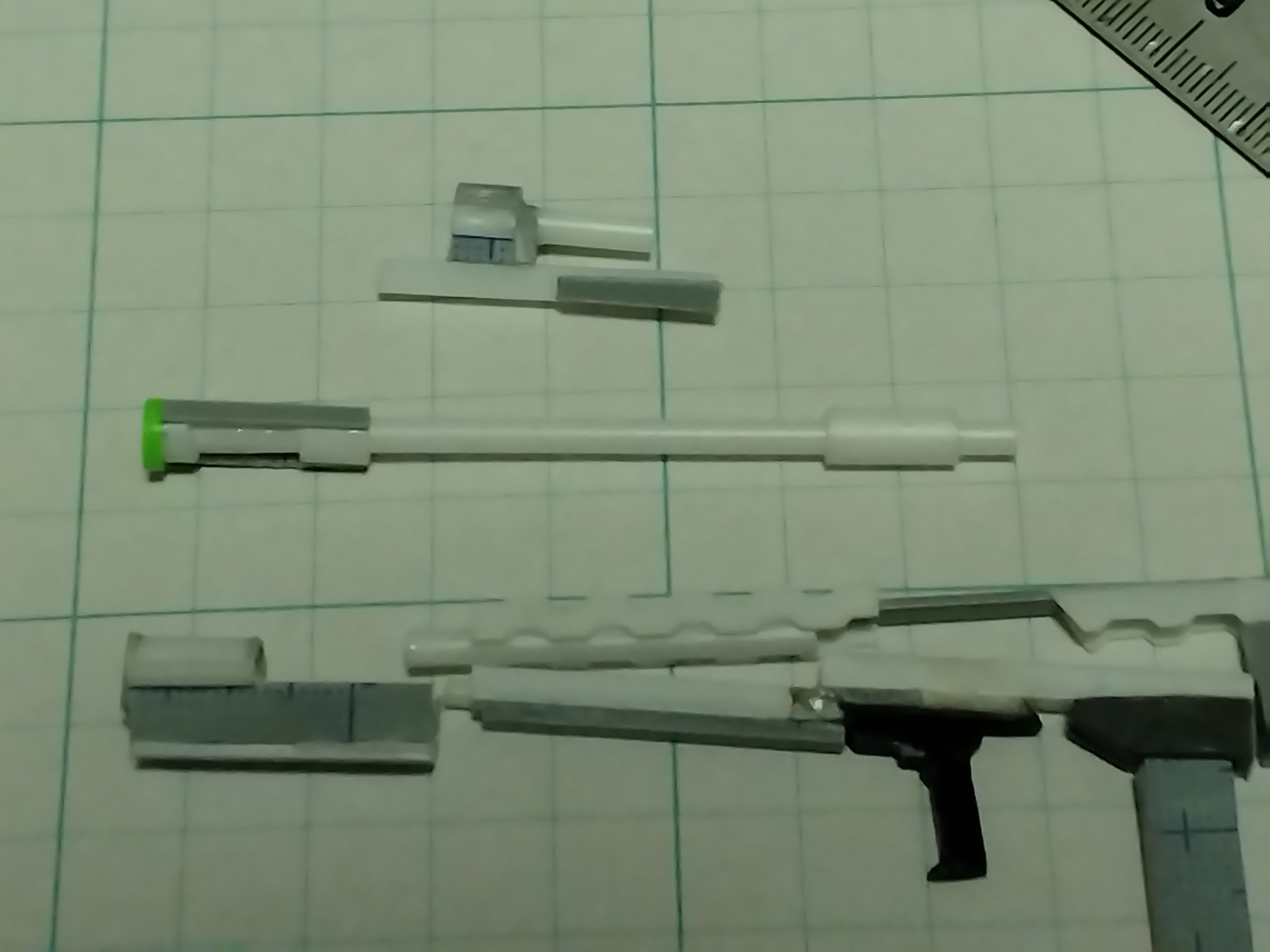 ヅダは上マガジン式ですが、あえてブルパップ式に。ブルパップは飛距離は変わらず銃自体を短くするのが目的なのに銃身が長いという。グリップ以外フルスクラッチ。塗装はエヴァのポジトロンライフル参考に試作武器感を出してみました