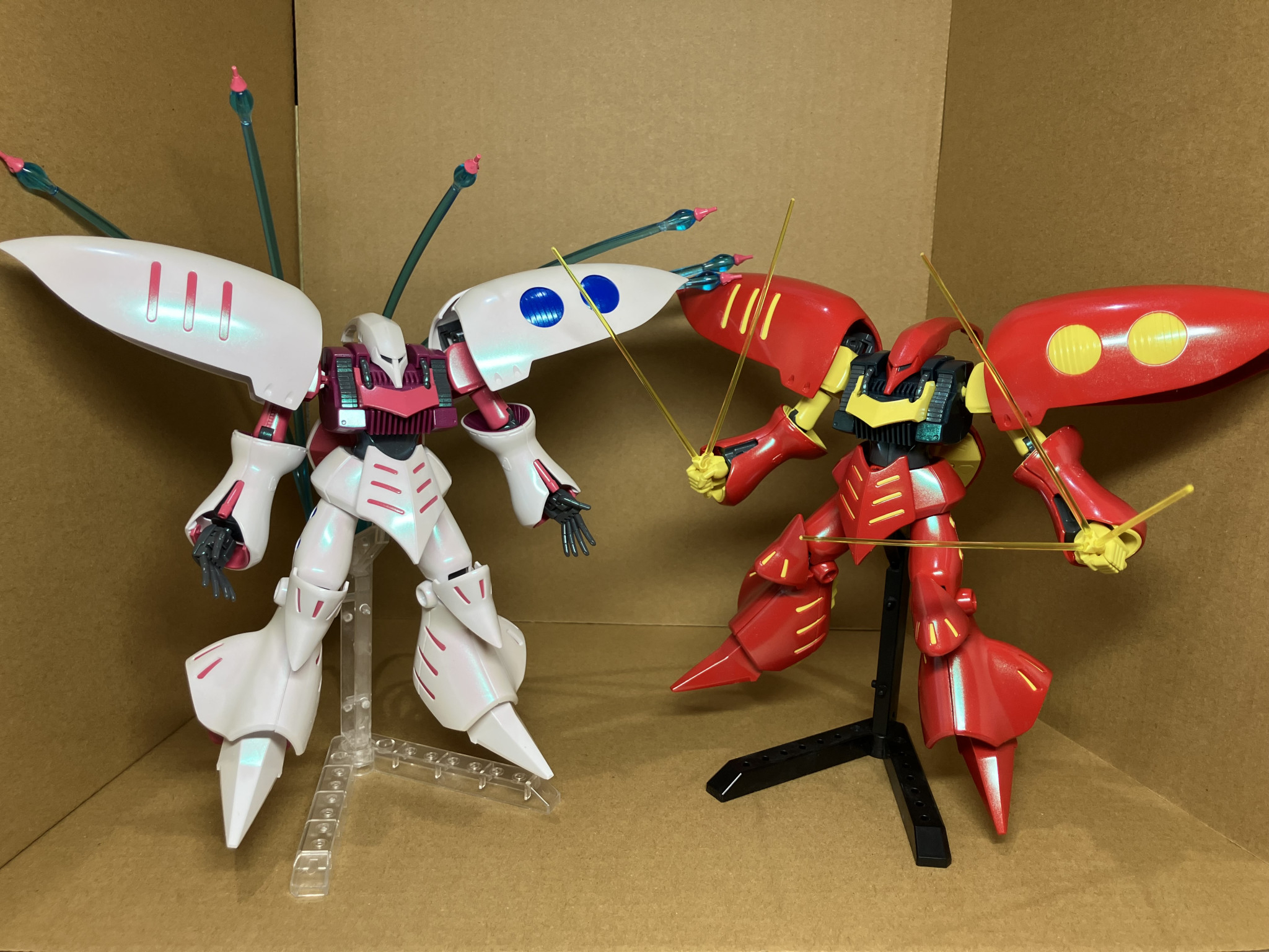 ままままんぼう HG 2026.01/18更新 【新年】キュベレイ紅白セット 32 30 いいねしたモデラー(30) 0 0 作品を共有 1月も下旬に差し掛かっていますが、新年のおめでたい感じをイメージして、キュベレイ紅白セットにしました。 ハマーン様の白プルツーの赤ファンネルエフェクトもあります。それぞれパールカラーを吹いて、光沢クリアーを吹きました。サイコミュをイメージしてグリーンのパールです。 2026年最新作 キュベレイ キュベレイMk-Ⅱ コメント コメントをして応援しよう コメントにはログインが必要です ままままんぼう 2025年6月にGUNSTAを始めました。 分からないことも多いのでご容赦いただけると助かります。 子育ての合間に趣味の範囲でガンプラを作ります。 幼児が2人いるため、限られた時間の中で、自分の作りたいものを作れる範囲で作っています。 合わせ目は消しませんし、表面処理もしませんし、サーフェイサーを吹かないことが多いです。 技術力は高くありませんので、設定通りのものは作れませんが、〇〇風の作風で自分なりに楽しく作っています。 温かい目で見守ってくださると嬉しいです。 自宅に飾るスペースが少ないので、作った作品はジャンク品としてフリマアプリで出品しています。 これまで作ったもの(売れたもの含め) 記憶に残るよう投稿してみようと思い始めました。 よろしくお願いします。 9 偽リックディアス隊 12月の再販で、レヴェルノヴァ (陸戦強化仕様)を購入できた… 2 ジャブローに散る 金魚の水槽の水を変えたときに、ズゴックとジムを入れてみました… 9 ガンダムFX9one ガンプラ合戦6機目はこちらです。 ガンダムナイオンって、どこ… 13 ルブリスtypeニルヴァーシュ ガンプラ合戦5機目はこちらです。 ルブリスをニルヴァーシュ風… ままままんぼうさんのページ この作品をお薦め作品に設定する Please login to update your profile! Please login to update your profile! Please login to update your profile! Please login to update your profile!