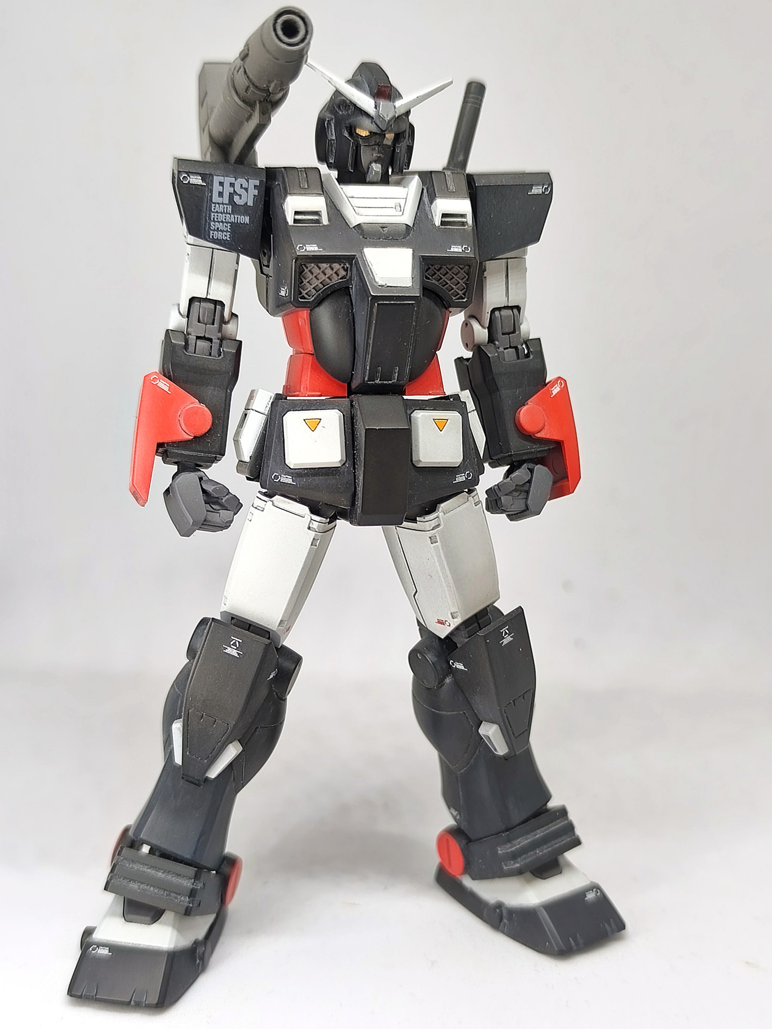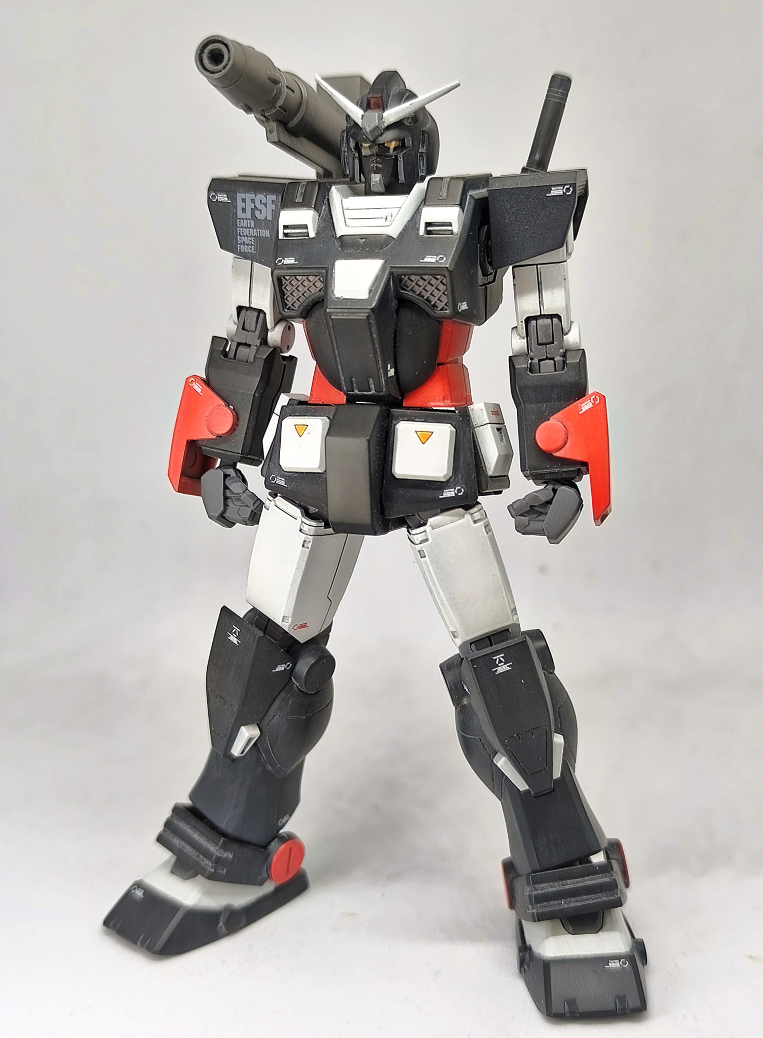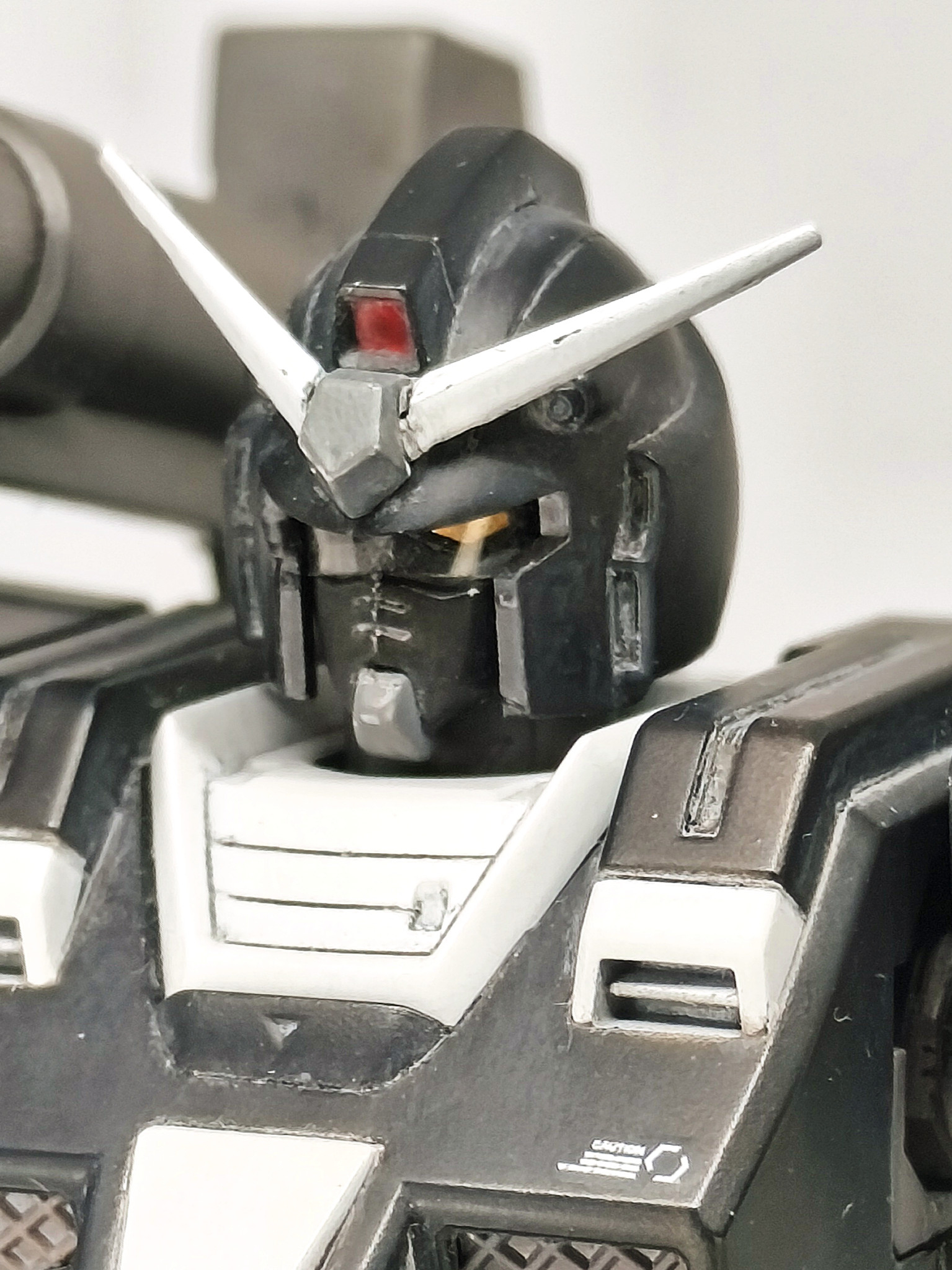 昔からこの機体の特徴的なバイザーがどうしても好きになれず、リバイブ版のガンダムの顔を移植し透明フィルムを最後に貼ってバイザーにしています。
