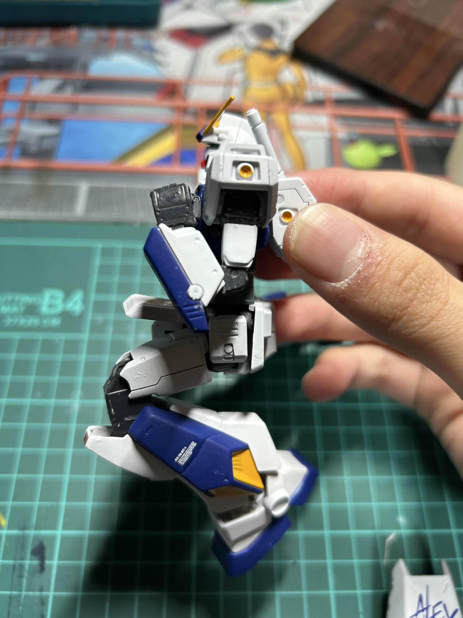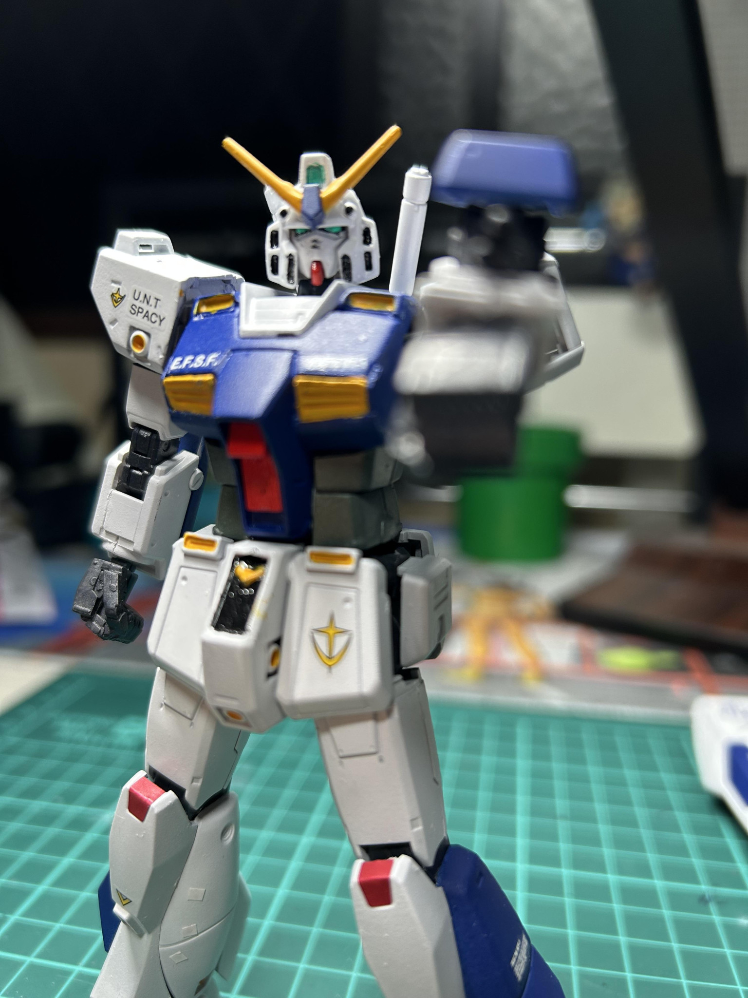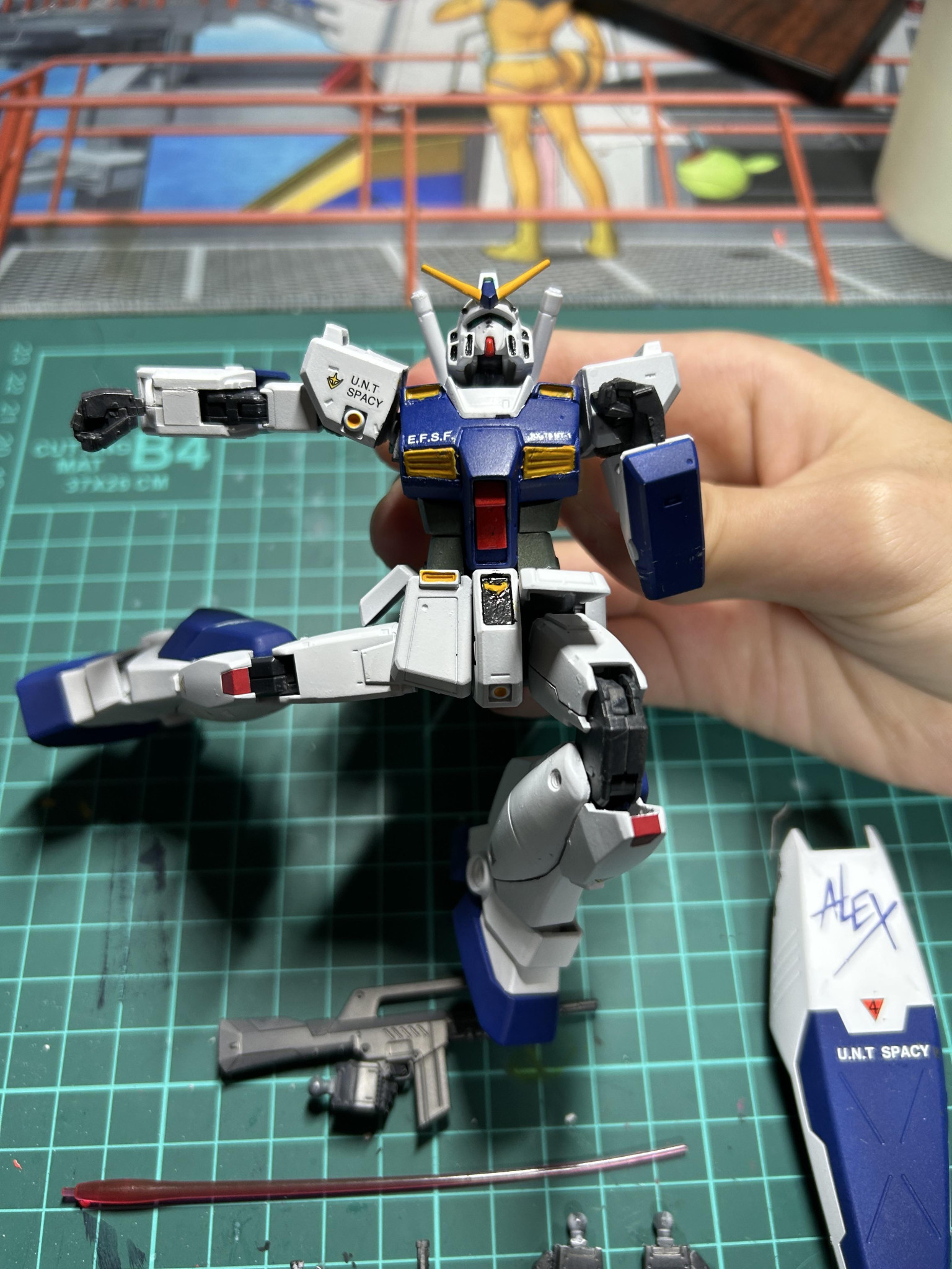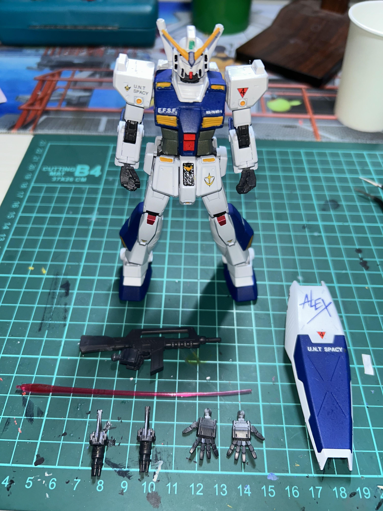 写真がなくて申し訳ないんですが、ランドセルはアレックスのランドセルのピンを切り飛ばして、そこにオリジンガンダムのランドセルの接続軸のあるパーツを薄く削ってつけてます。