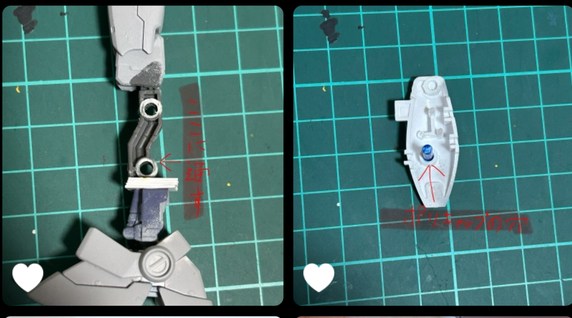 スリッパに接続するボールジョイントはパーツのうえから2番目のダボ穴のところでカットしてます。(反対側はボールジョイントの上の四角ぽいとこで切ってより安定するようにしました)