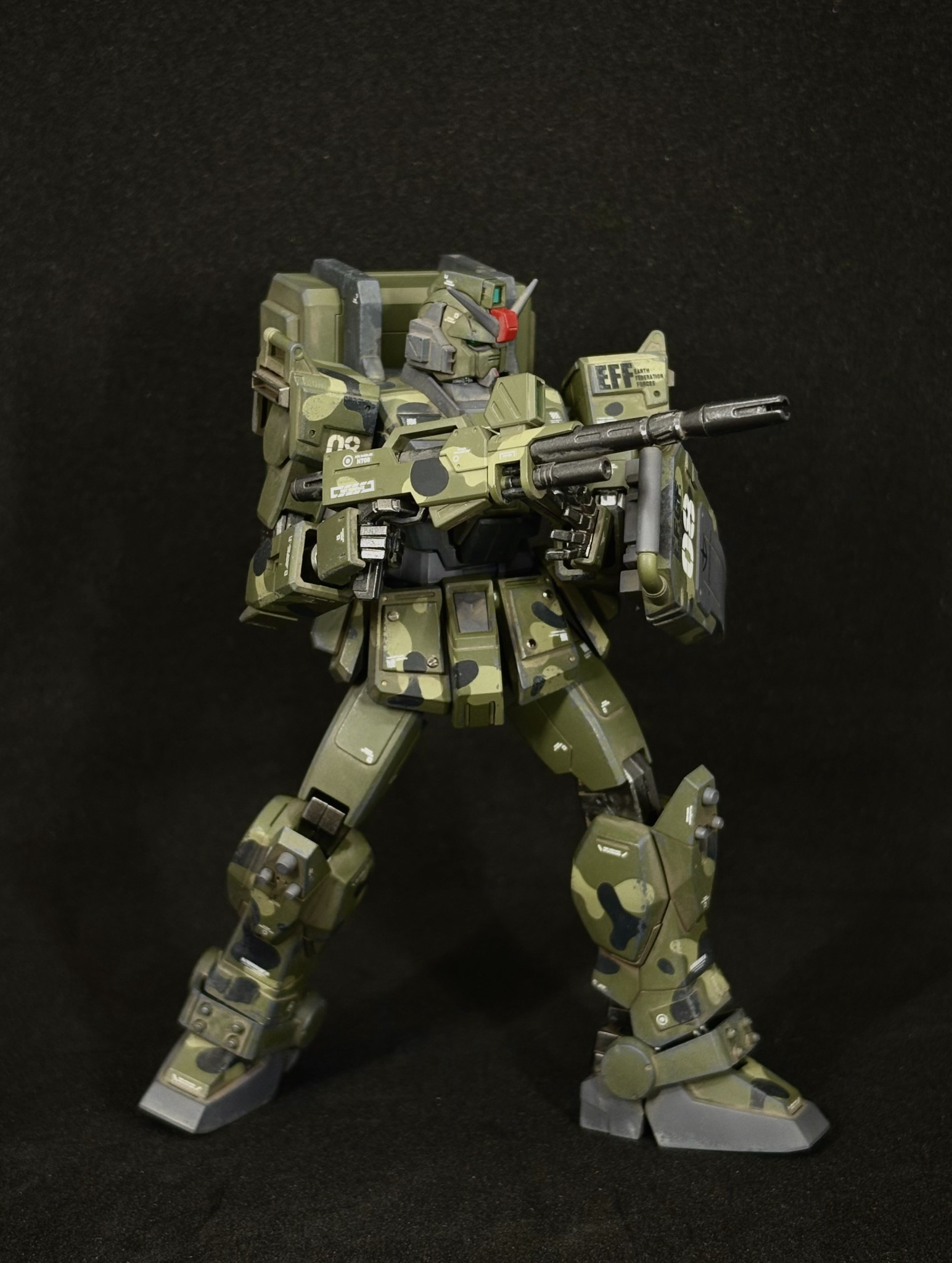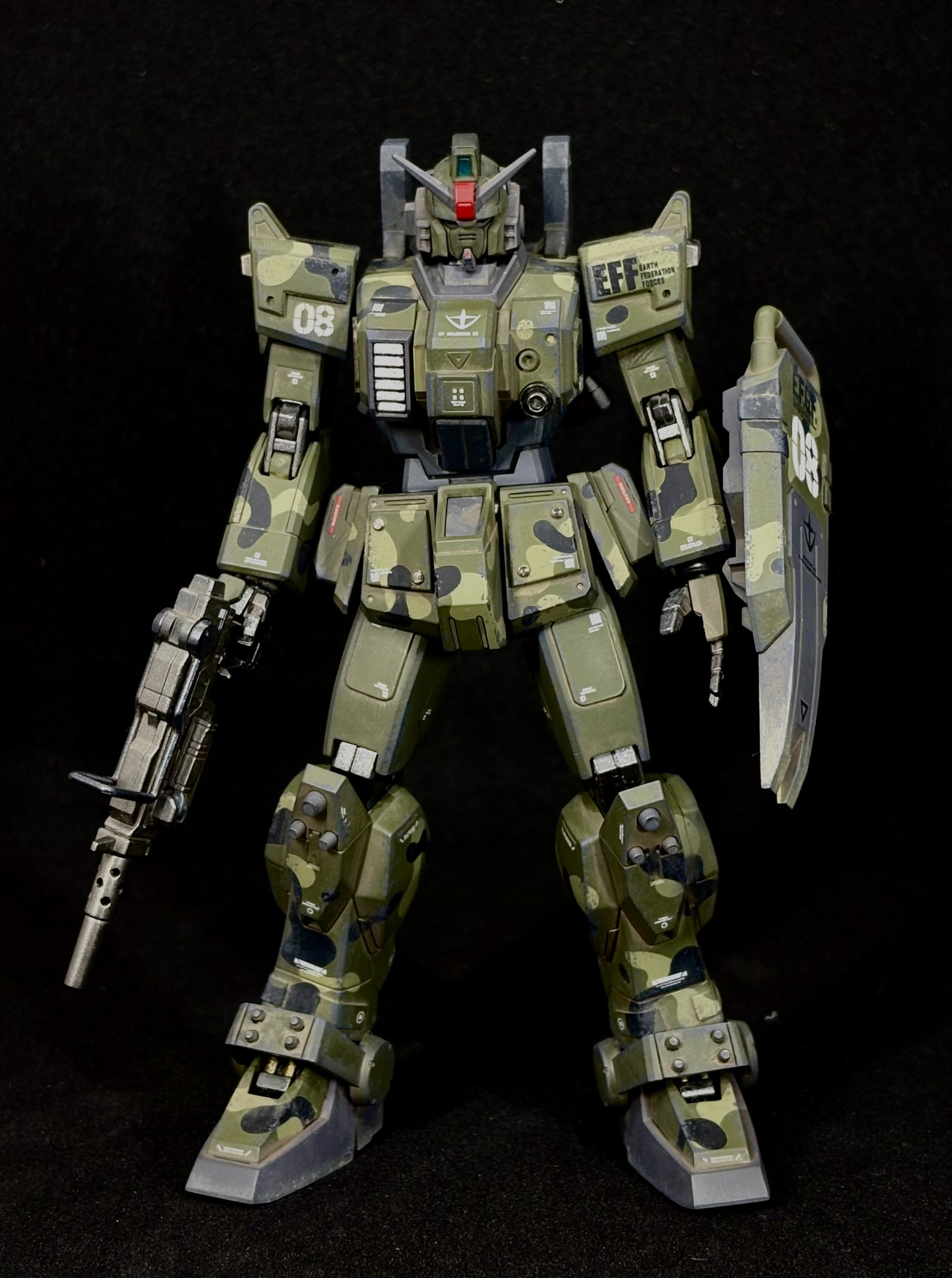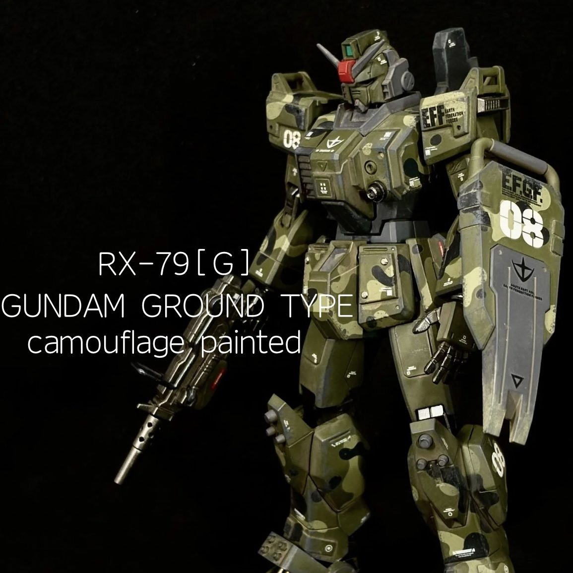 HGUC陸戦型ガンダムを迷彩塗装、ウェザリング仕上げで制作しました。
