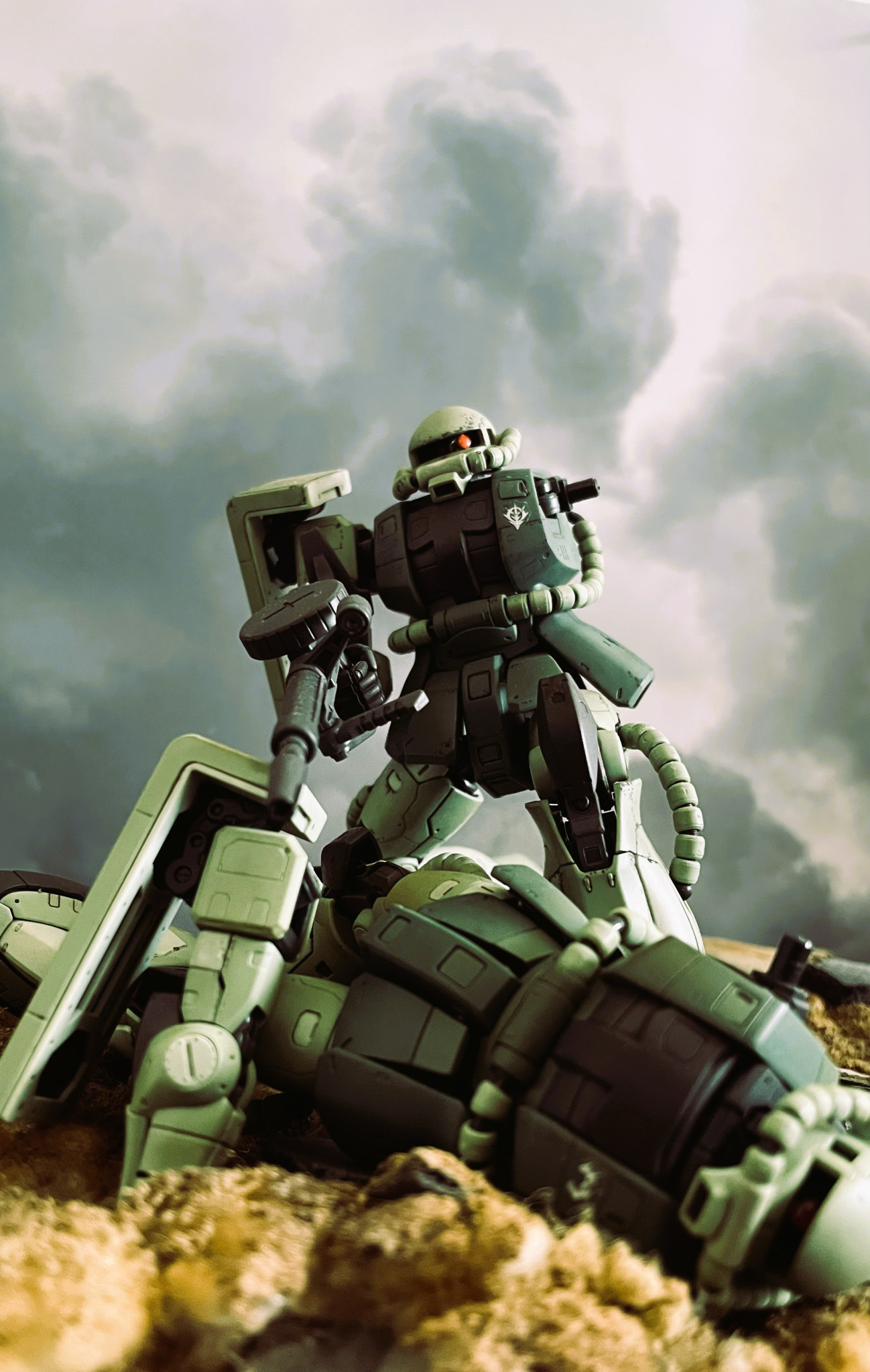 ジ・O IIとなります。HGを元ネタにしたミキシングビルドです。腹部を撃ち抜かれ崩れ落ちるGM IIを手前に置きました。”BAHFOOOOOOM”と口ずさんでいただければ。