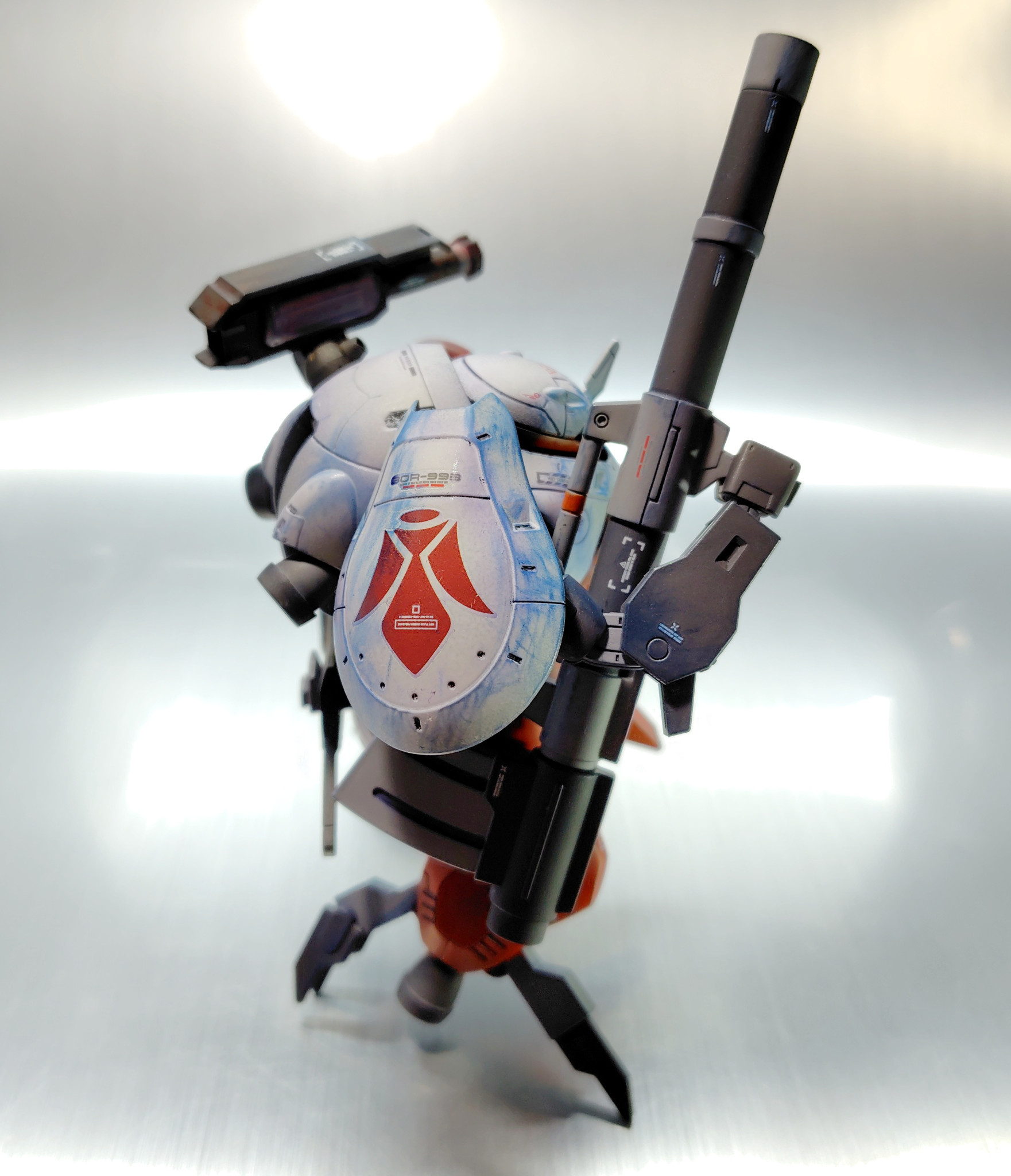 改修は背中にランチャーっぽいのとセンサーっぽいもの背負わせました。ランチャー取付位置の様子見で最初に空けた3mm穴位置が気に入らなかったのでチョットズラしてもう一箇所空けたので不要な穴塞ぎでセンサーっぽいのを突貫で仕立てて装着です。パテでキレイに穴塞ぐより楽チンだからと言うのは内緒です。