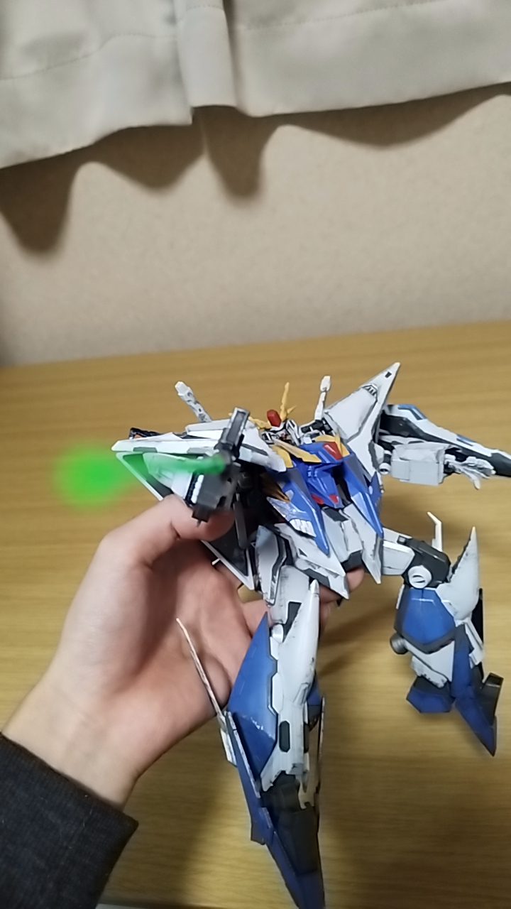 ビームライフルとサーベル、盾の3つ、そしてほかにはスカート裏にファンネル?ミサイル?みたいなのが仕込まれてますね。サーベルは2本ついててフリーダムのサーベルみたいに両方つけれます両刃ですね