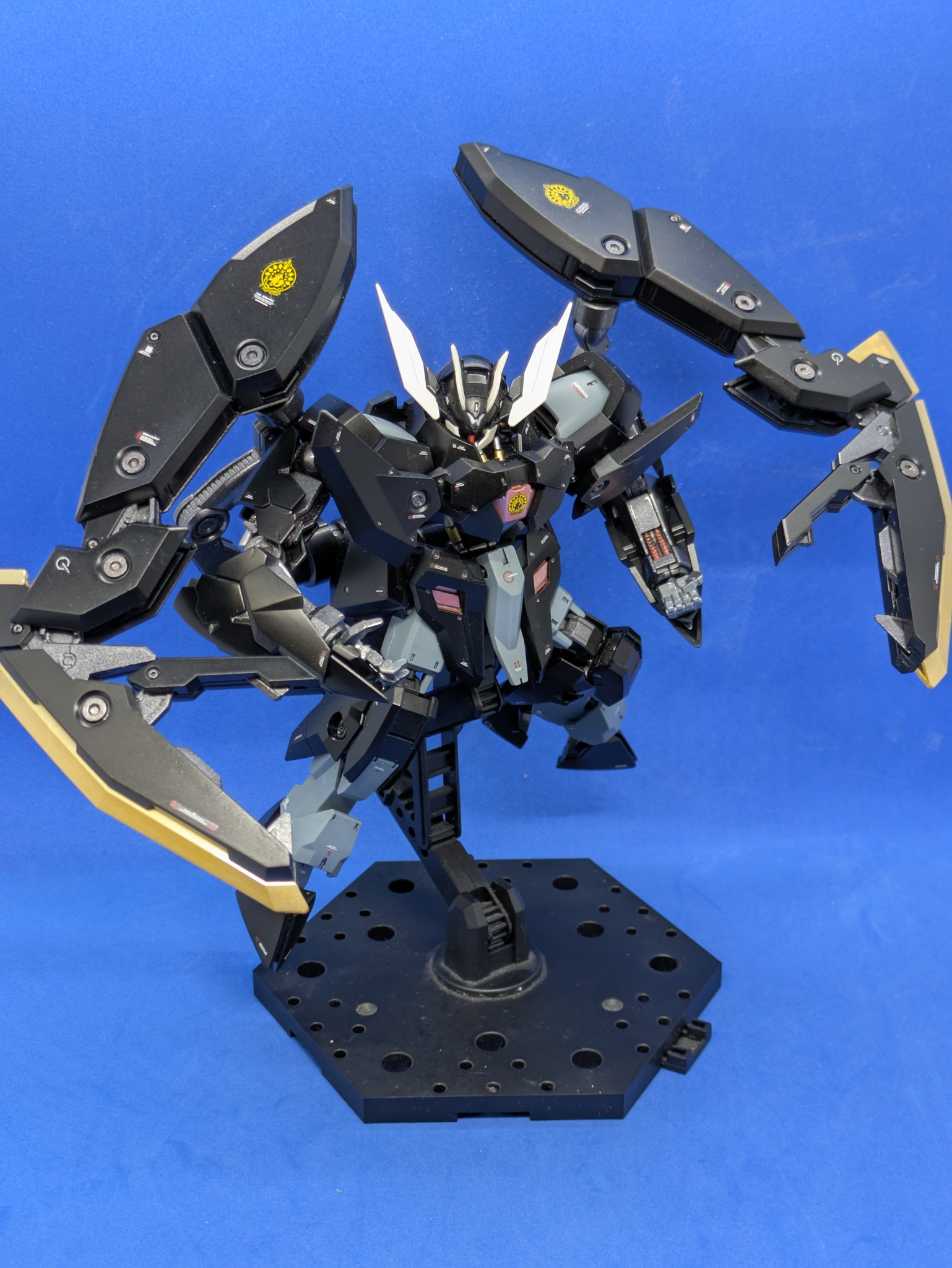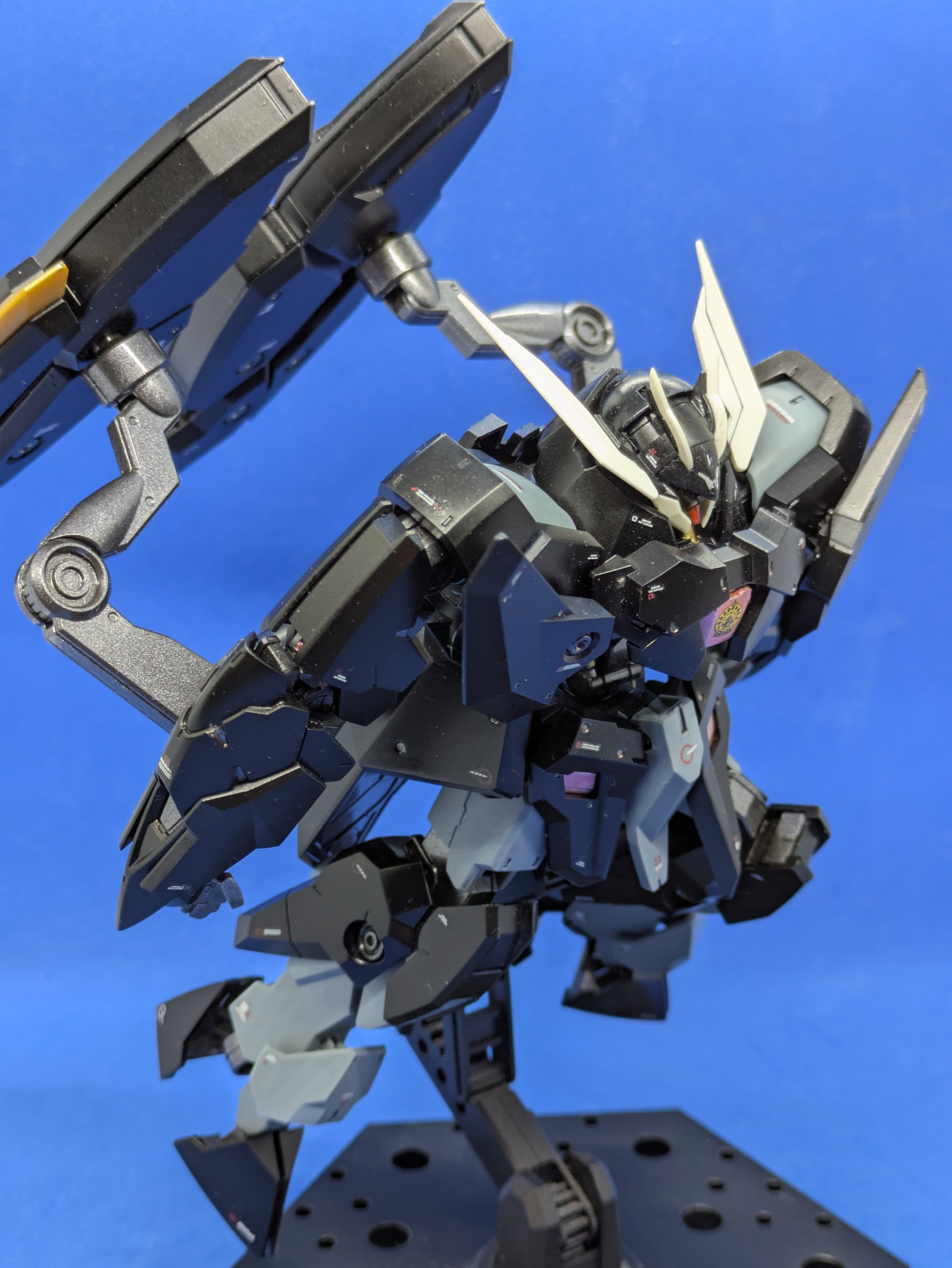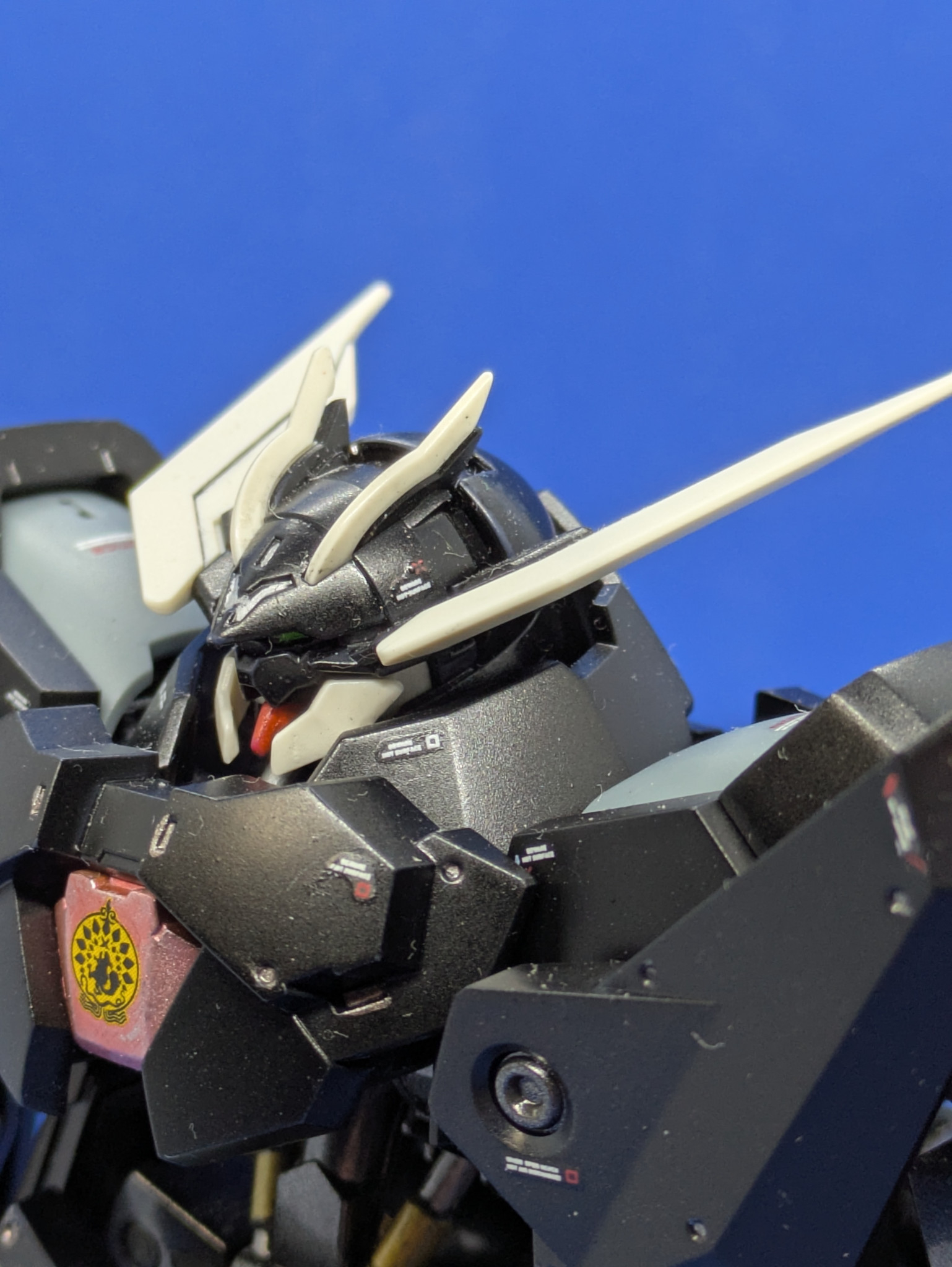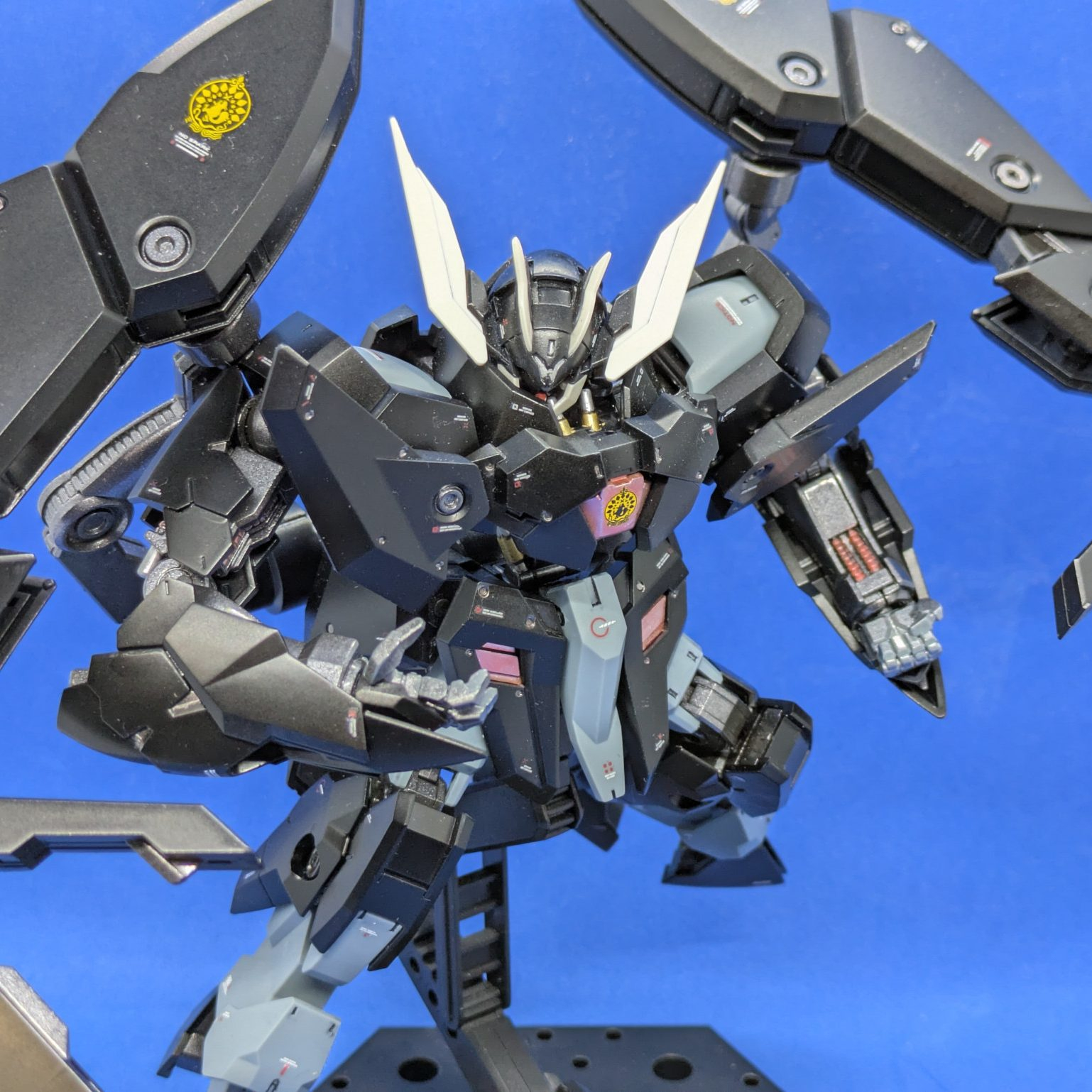 ガンダムデカール 鉄血のオルフェンズ汎用2のイシュー家のエンブレムを貼っていますが、ガンダムデカールの都合上、左右でエンブレムの配色が違います。