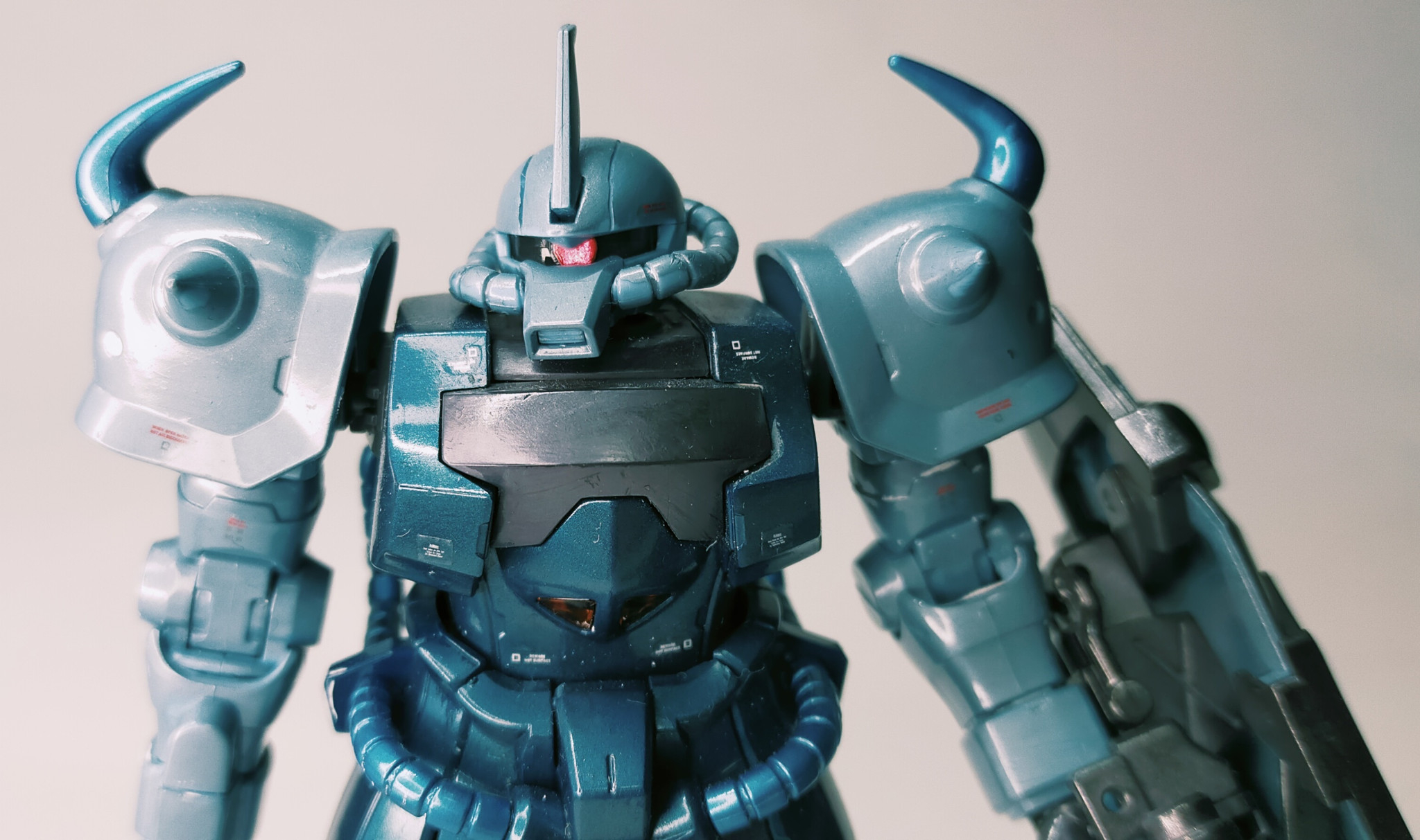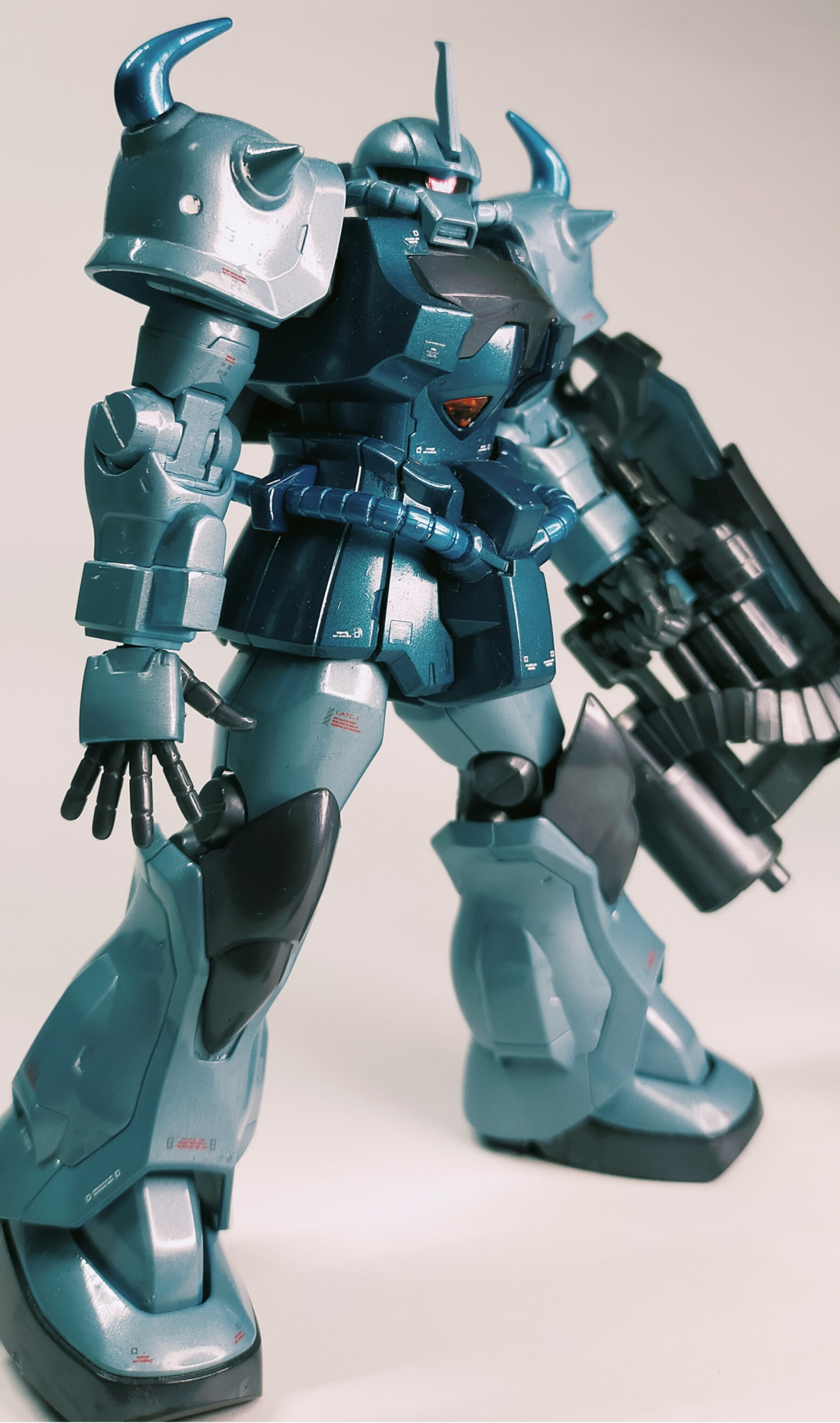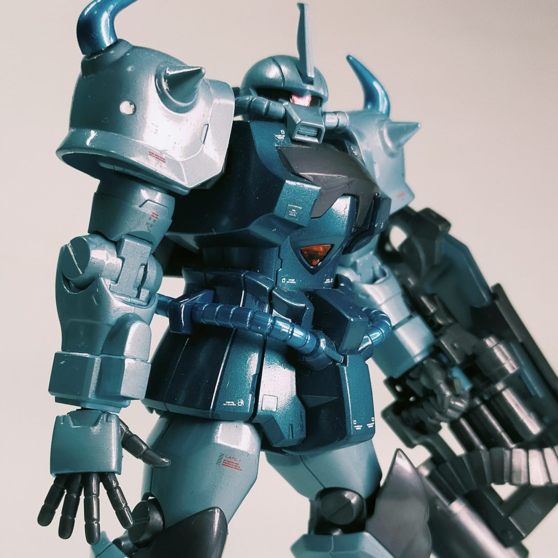 HGグフカスタムをメタリック塗装しました.成形色のように見えますが全塗装しています.本体は筆塗り,ガトリングガンのみエアブラシです.最後に水性クリアをトップコートの代わりに塗りました.