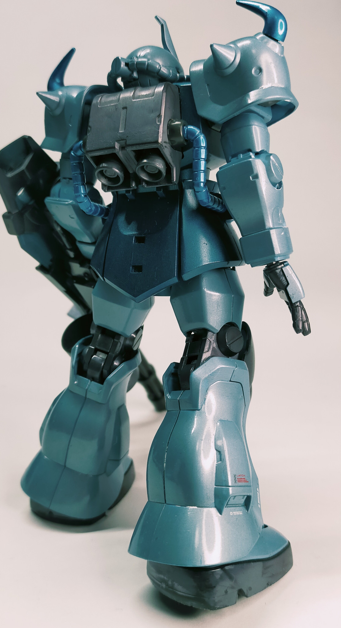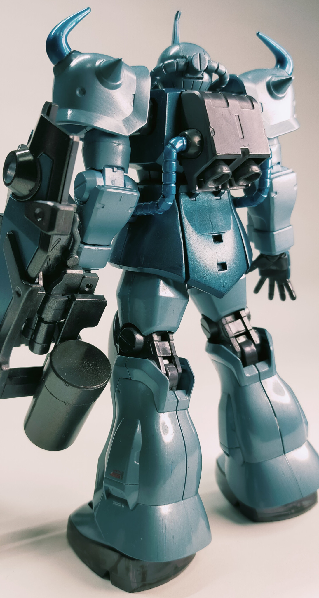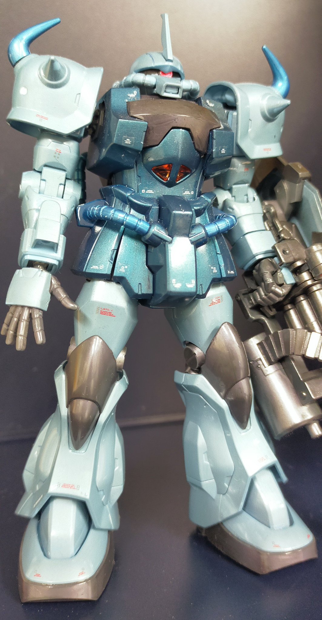 HGグフカスタムをメタリック塗装しました.成形色のように見えますが全塗装しています.本体は筆塗り,ガトリングガンのみエアブラシです.最後に水性クリアをトップコートの代わりに塗りました.