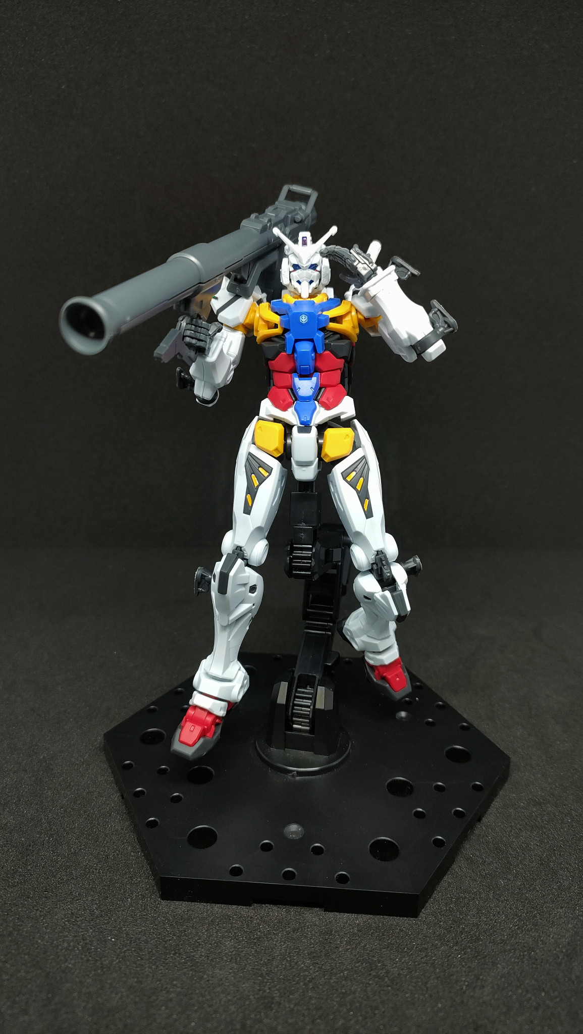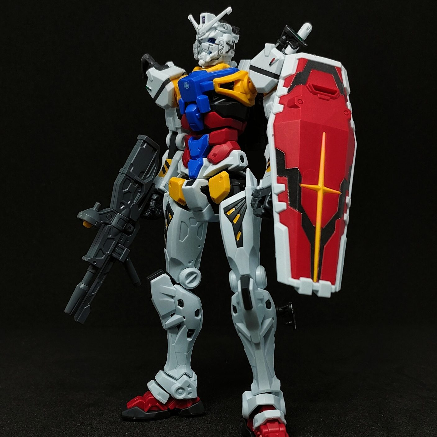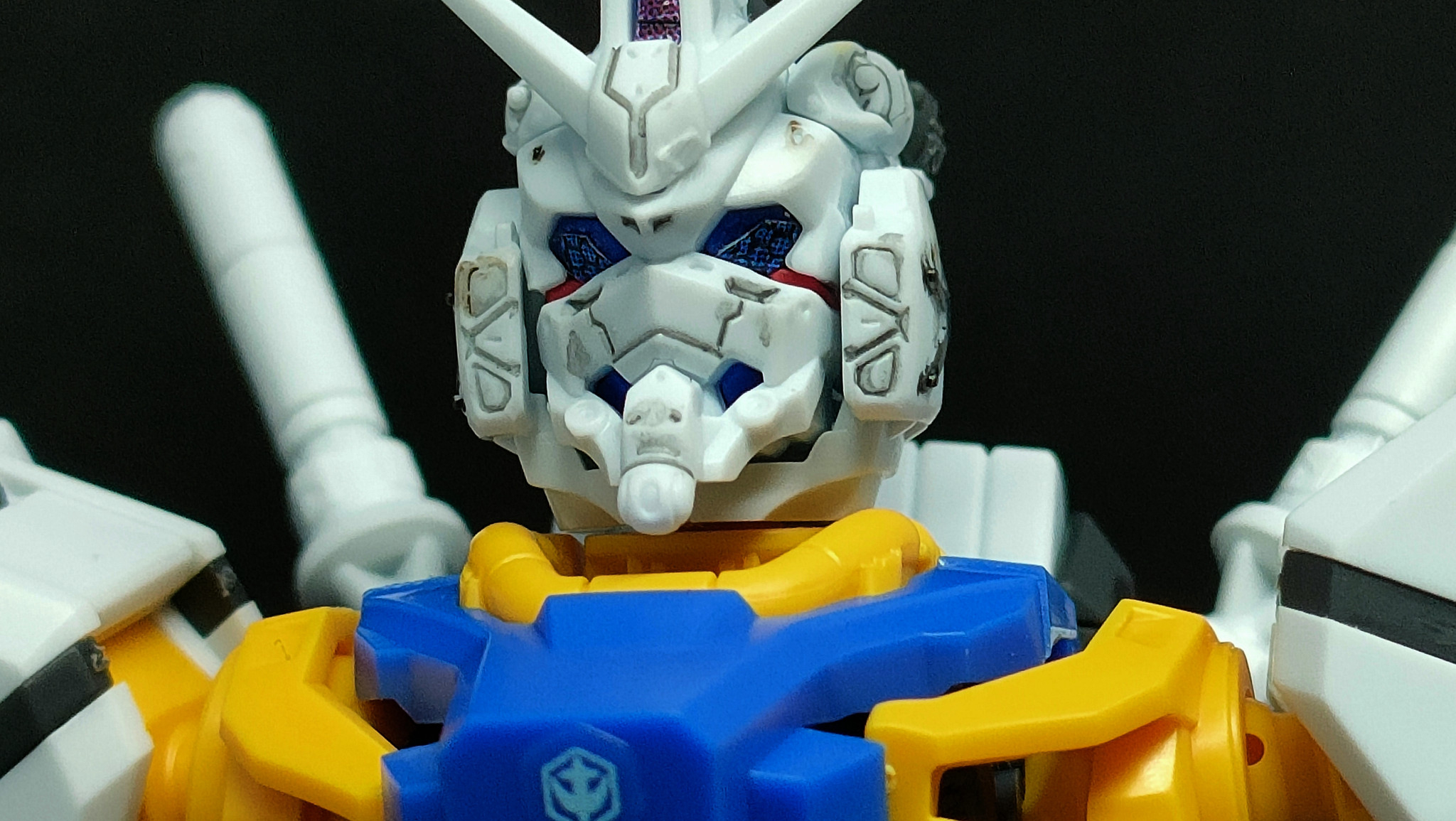 GQシリーズは自身のこだわりでパチ組みホイルシール仕上げが基本なんですが、紅白ガンダムのお顔だけはモールドの情報量多いのでダークグレーの墨入れだけはしました。あと白いガンダム頭部側面の新金型部品には色分けがされてないのでリアルタッチマーカー(グレー3)でそこだけ部分塗装しました。