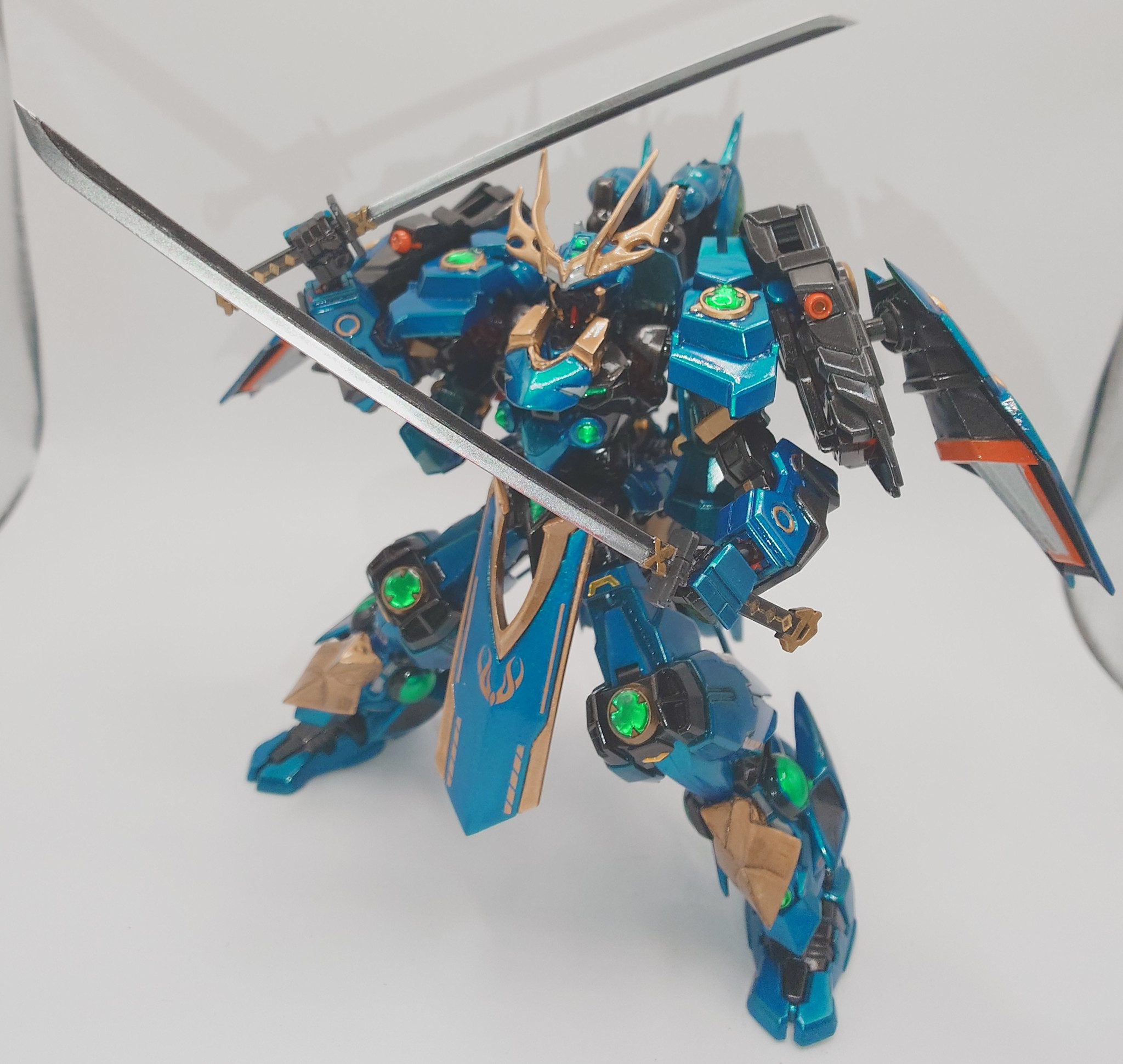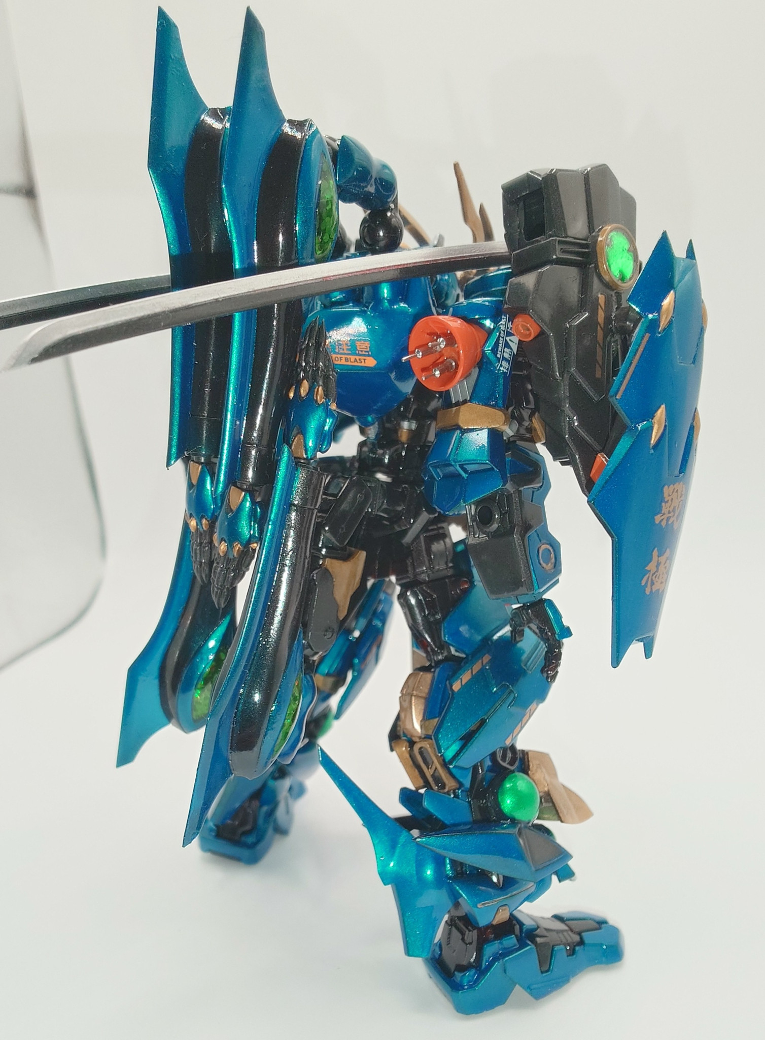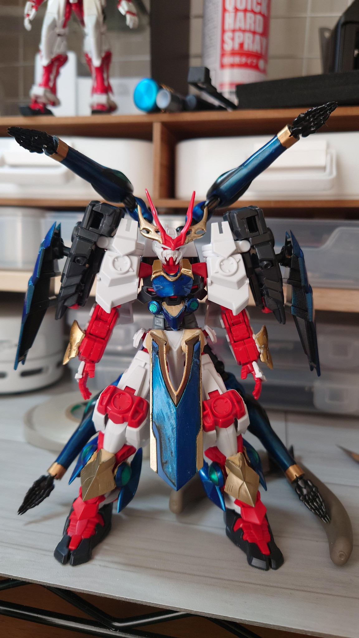 戦国アストレイを見てから、ナイツマのイカルガとミキシングしてみたいと思ったのがきっかけでした。本当は『鬼』のデカールを貼りたかったのですが見つからず、少し残念でした。