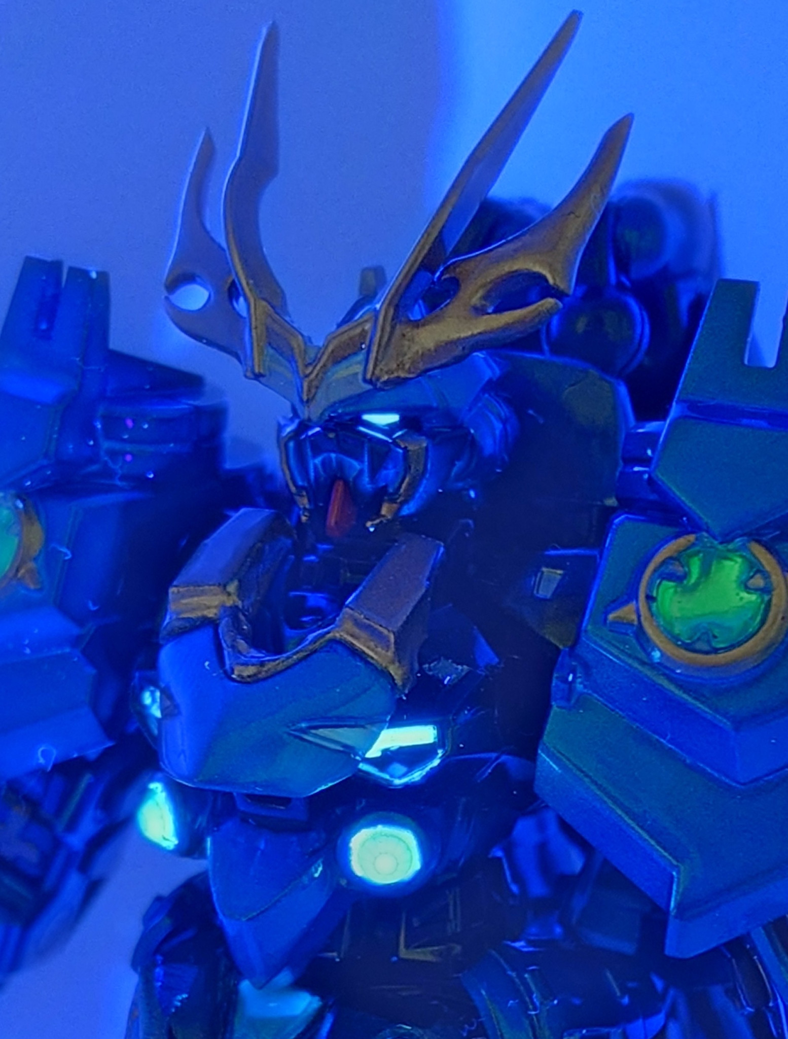 眼や胸部センサーには蛍光塗料を使用したので、ビコーンと光ります