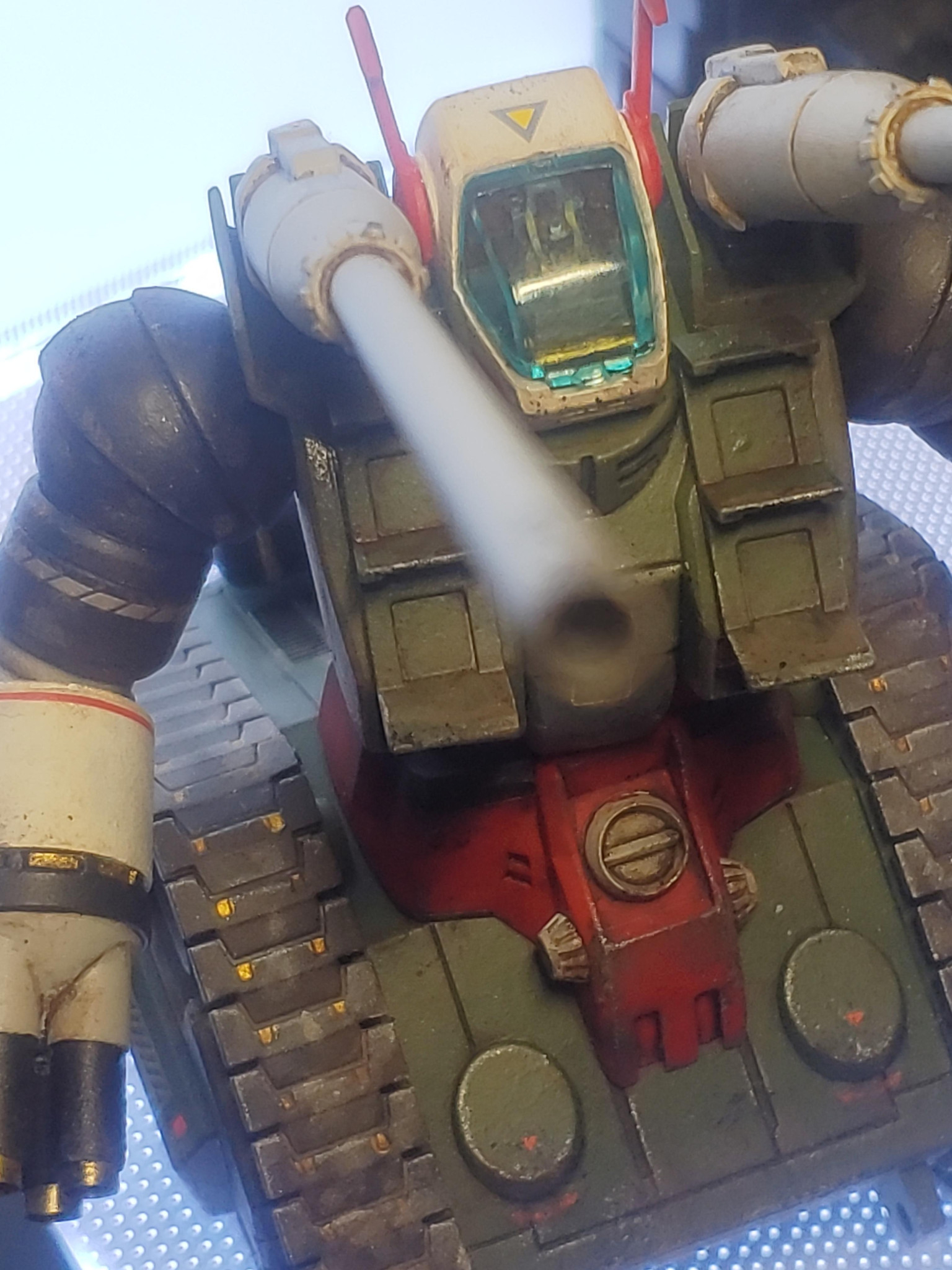 上からも1枚。キャノン越しのコックピット。パイロットも塗ったのですが、光の反射で見えにくいですね。後程別の写真でも紹介します。