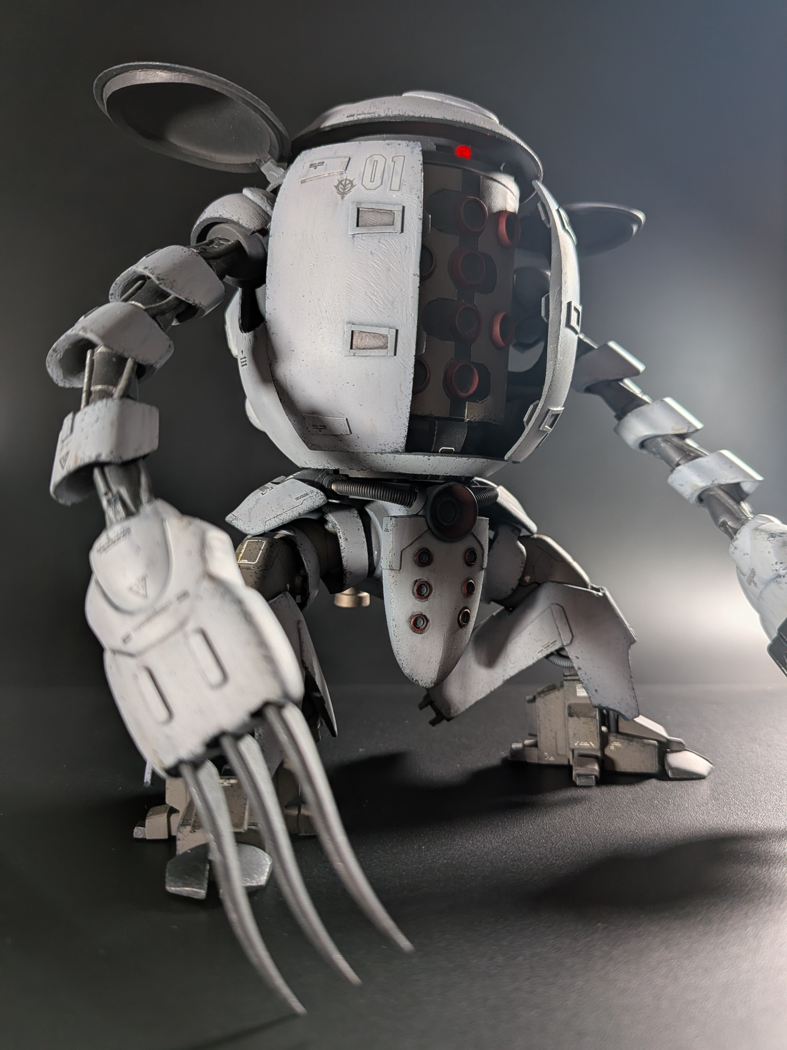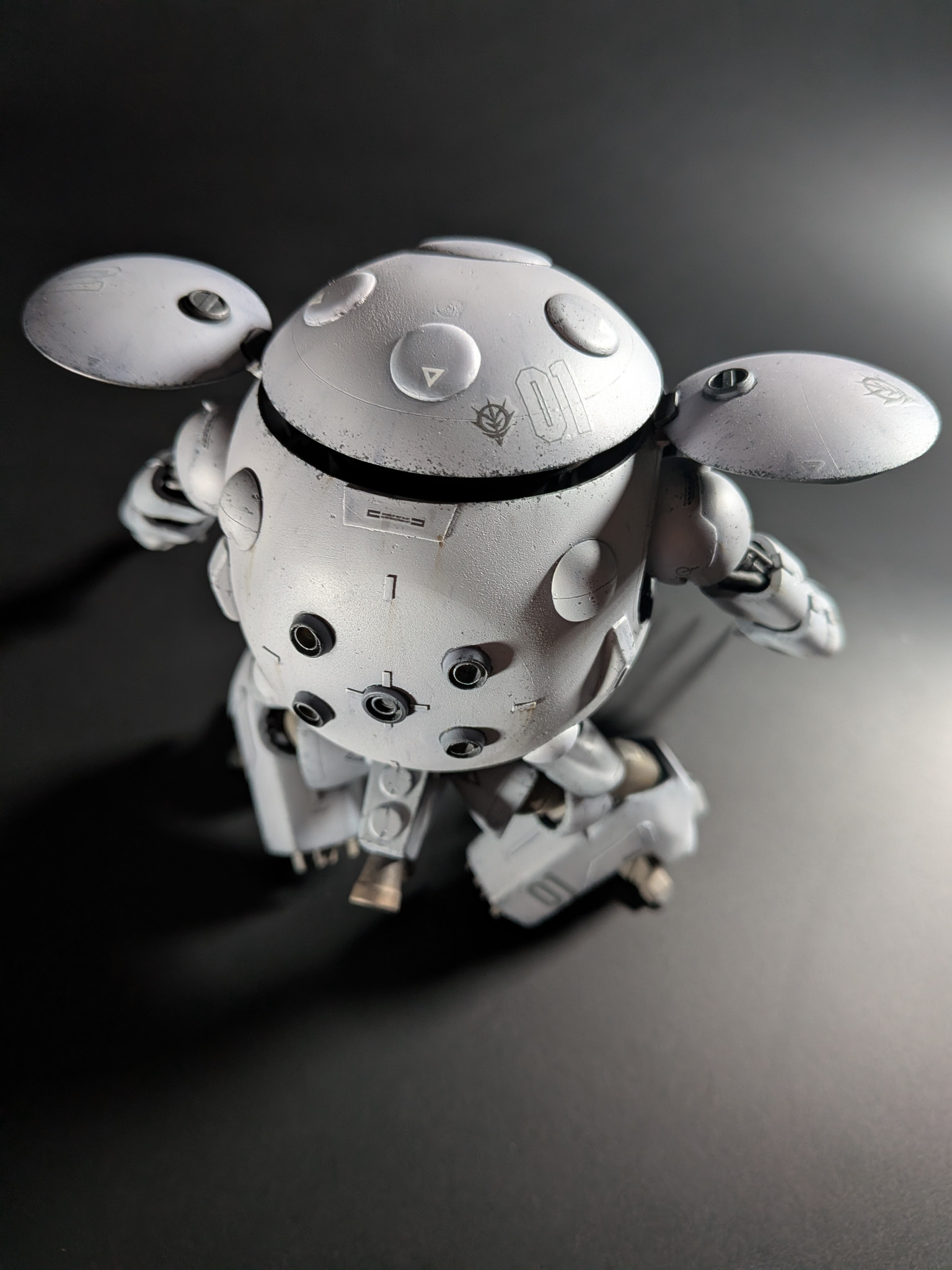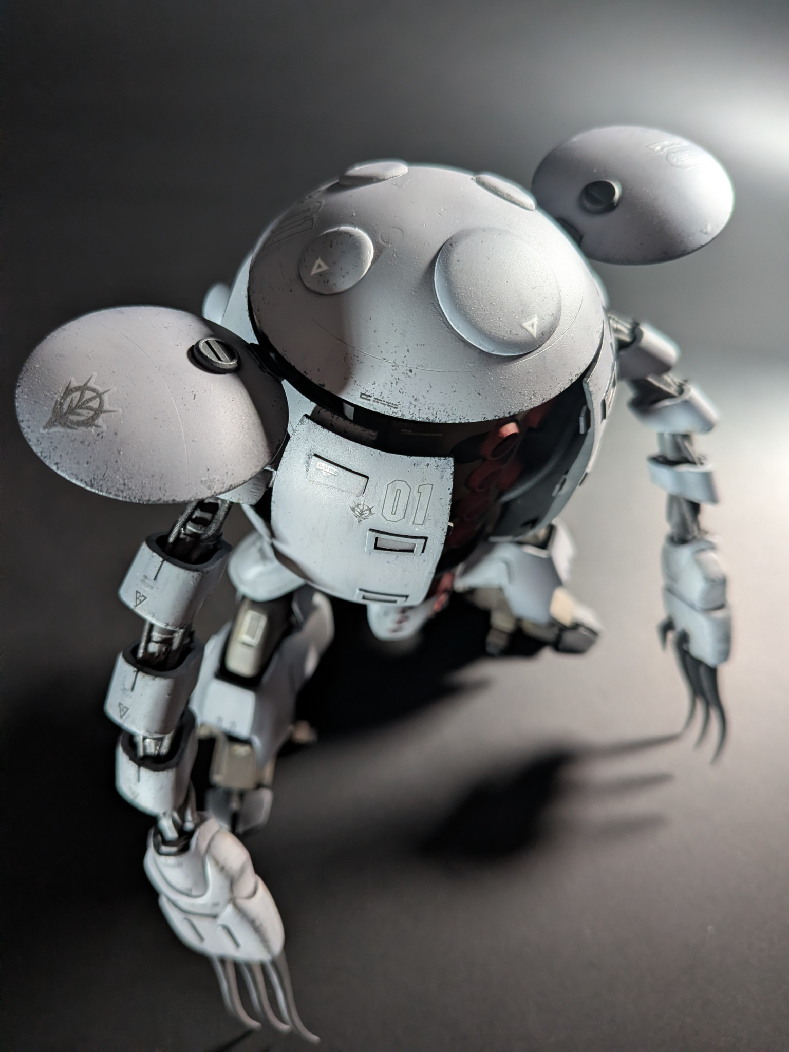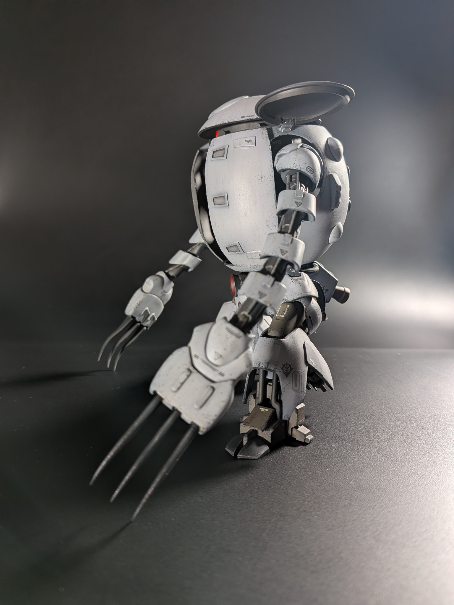 肩はガンキャノンの肩パーツにパテ盛りでボリュームアップし、ハイゴックの腕の装甲をカットしてそれっぽく……。手はプラ板とパテで作製、クローは歯のフロスのピック部分を使用してます笑 脚部は、ハイゴックの物をベースにして、カットしたりパテ盛りしたり……プラ板で足部はプラ板で自作。所々カプールとディテールが違っているので、試作1号機ということでお許しください🙏