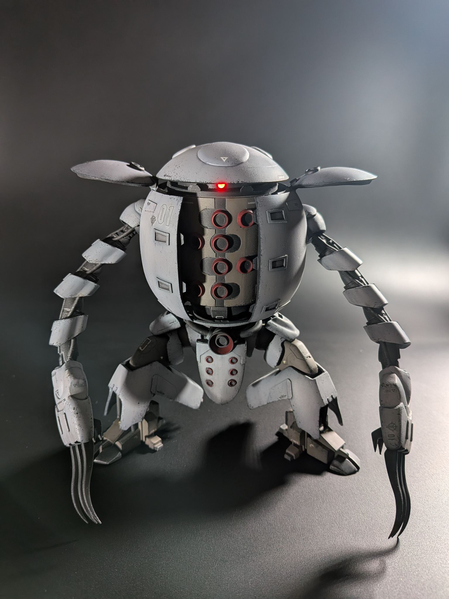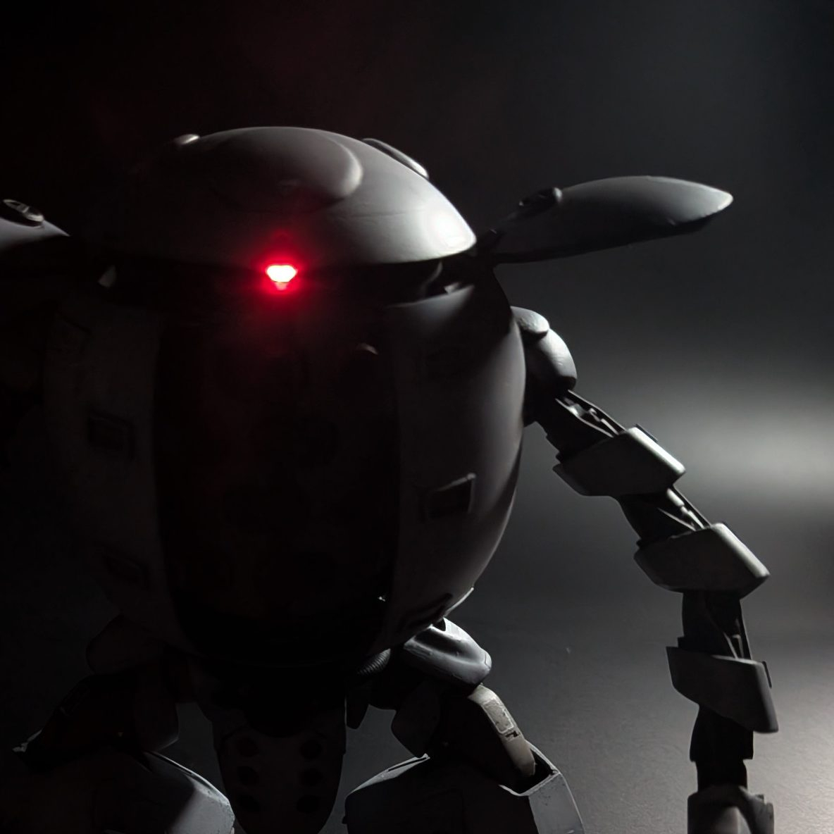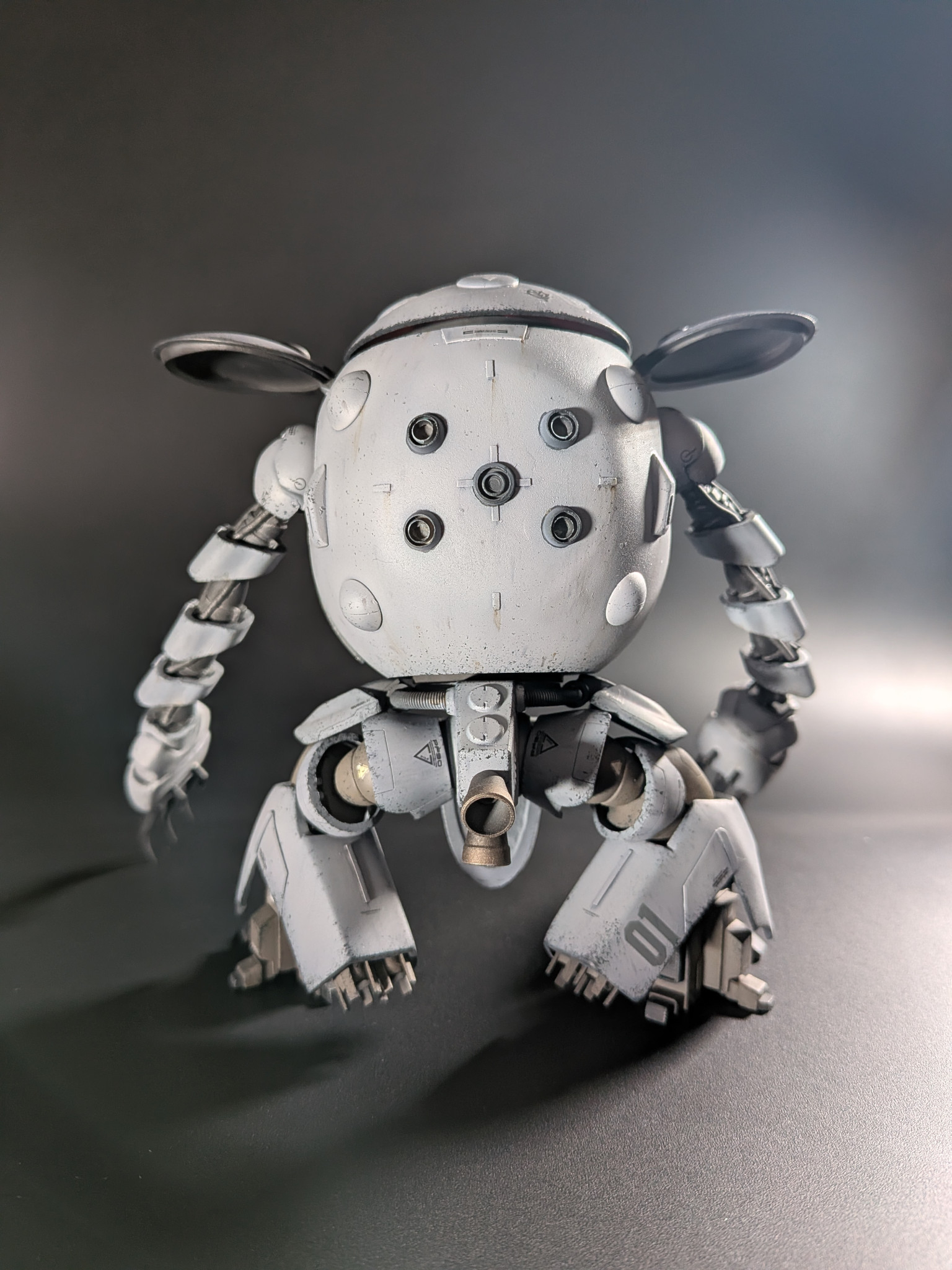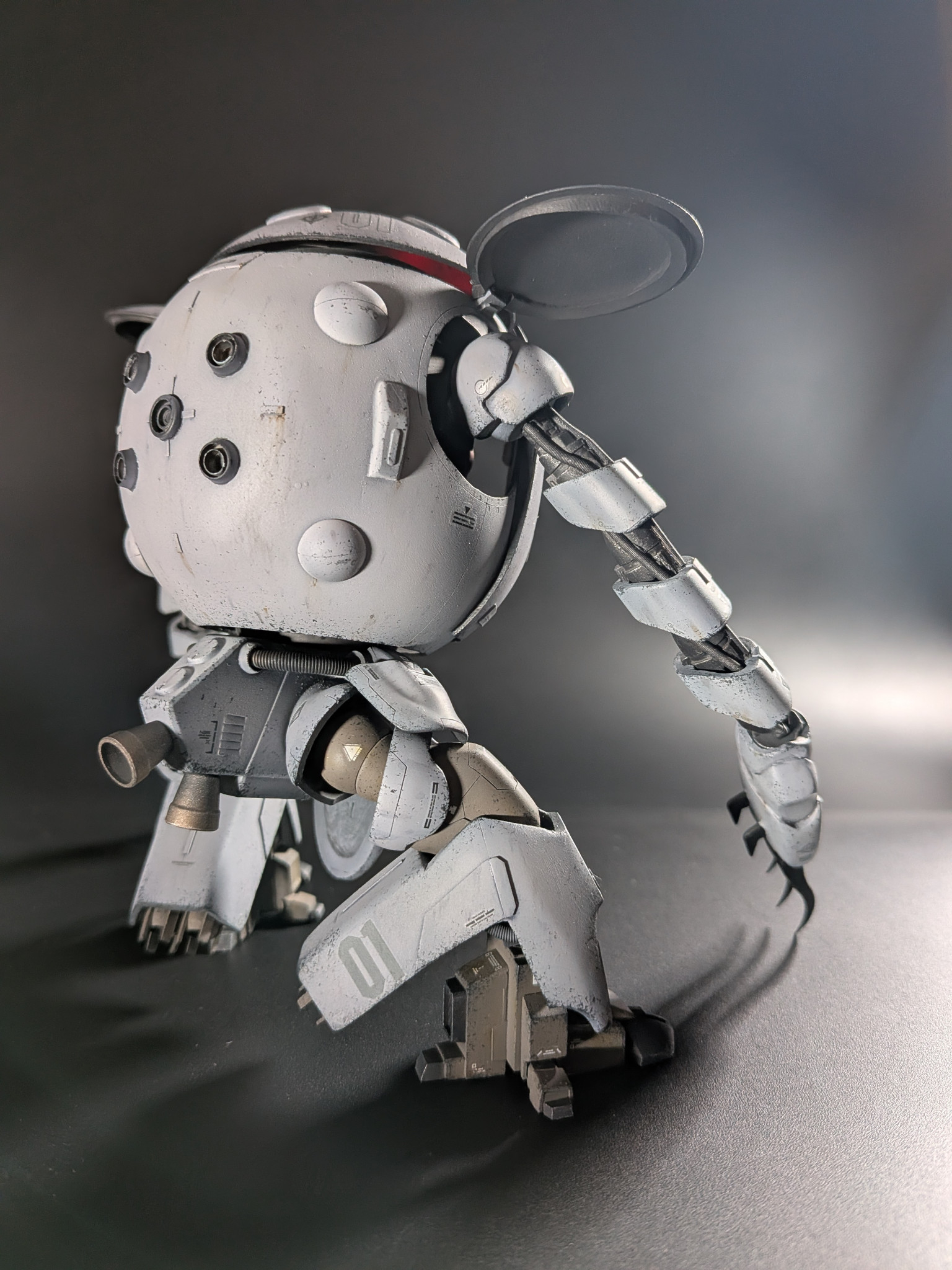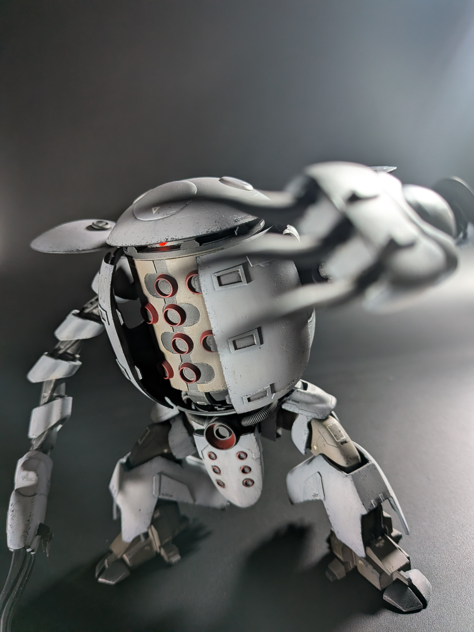 肩はガンキャノンの肩パーツにパテ盛りでボリュームアップし、ハイゴックの腕の装甲をカットしてそれっぽく……。手はプラ板とパテで作製、クローは歯のフロスのピック部分を使用してます笑 脚部は、ハイゴックの物をベースにして、カットしたりパテ盛りしたり……プラ板で足部はプラ板で自作。所々カプールとディテールが違っているので、試作1号機ということでお許しください🙏
