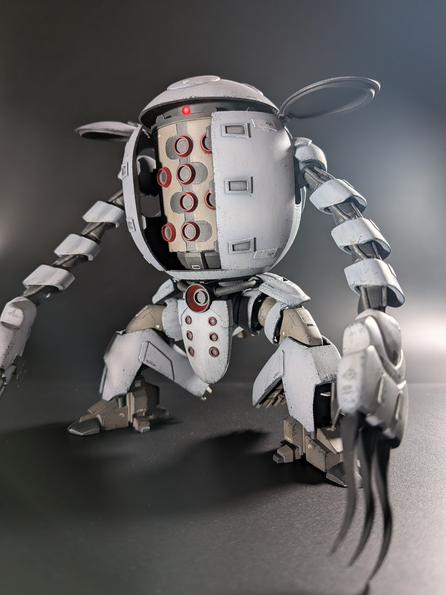 胴体内部がポールキャップ、頭、胴体外部、肩の丸い装甲はガチャガチャのカプセルで作製してます。