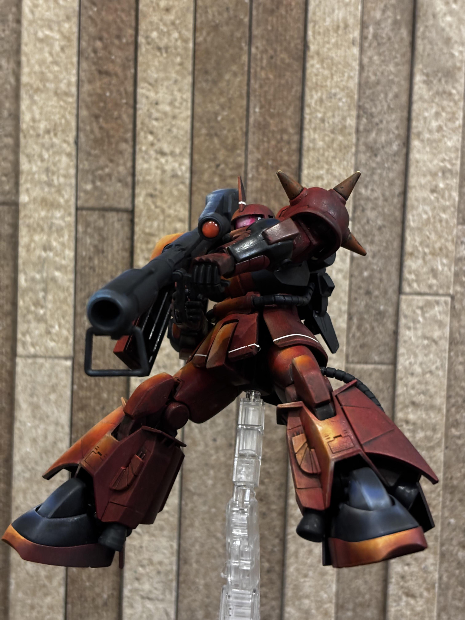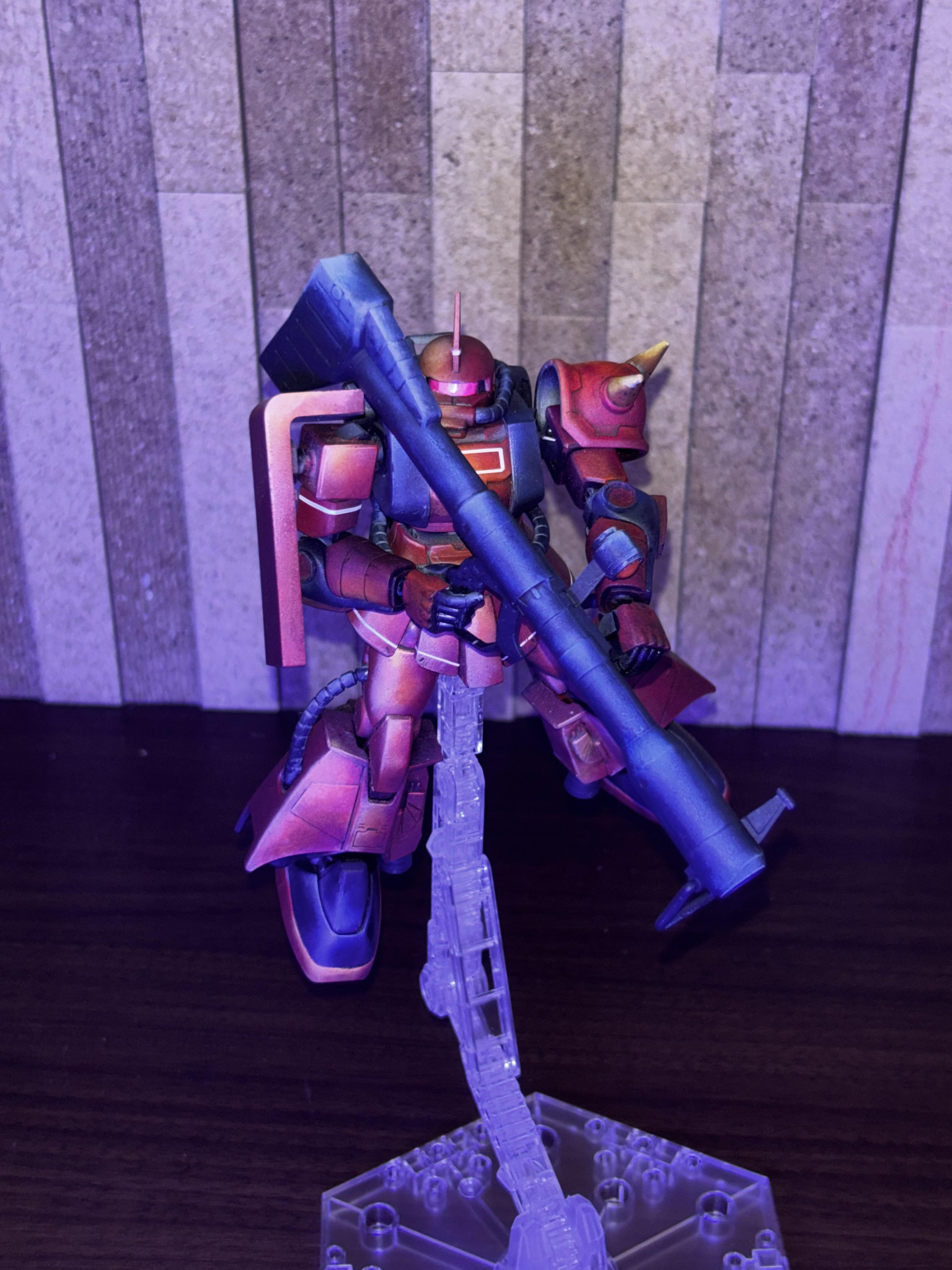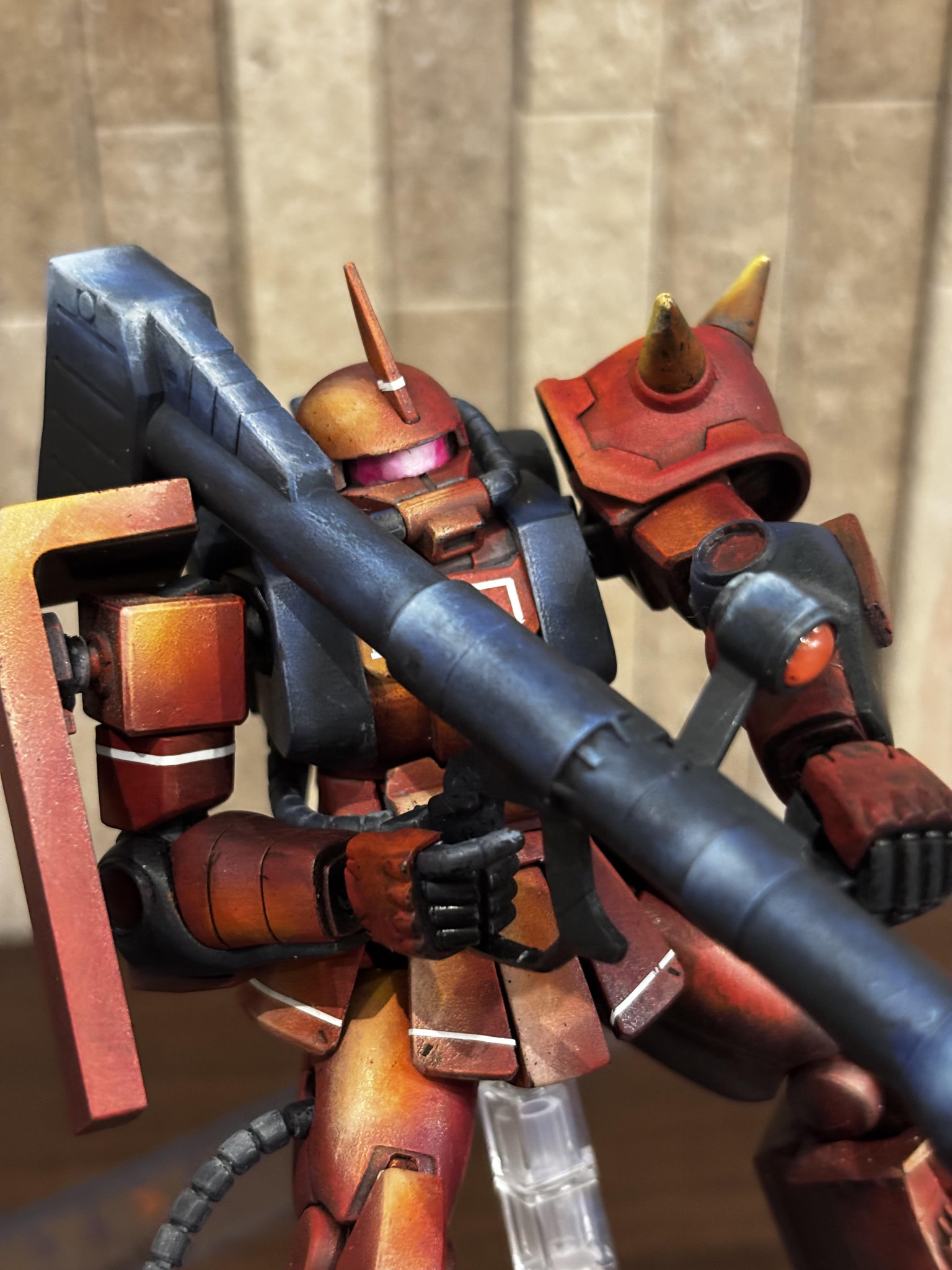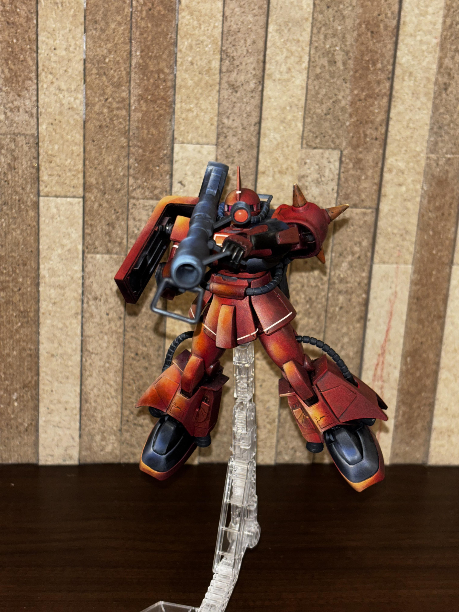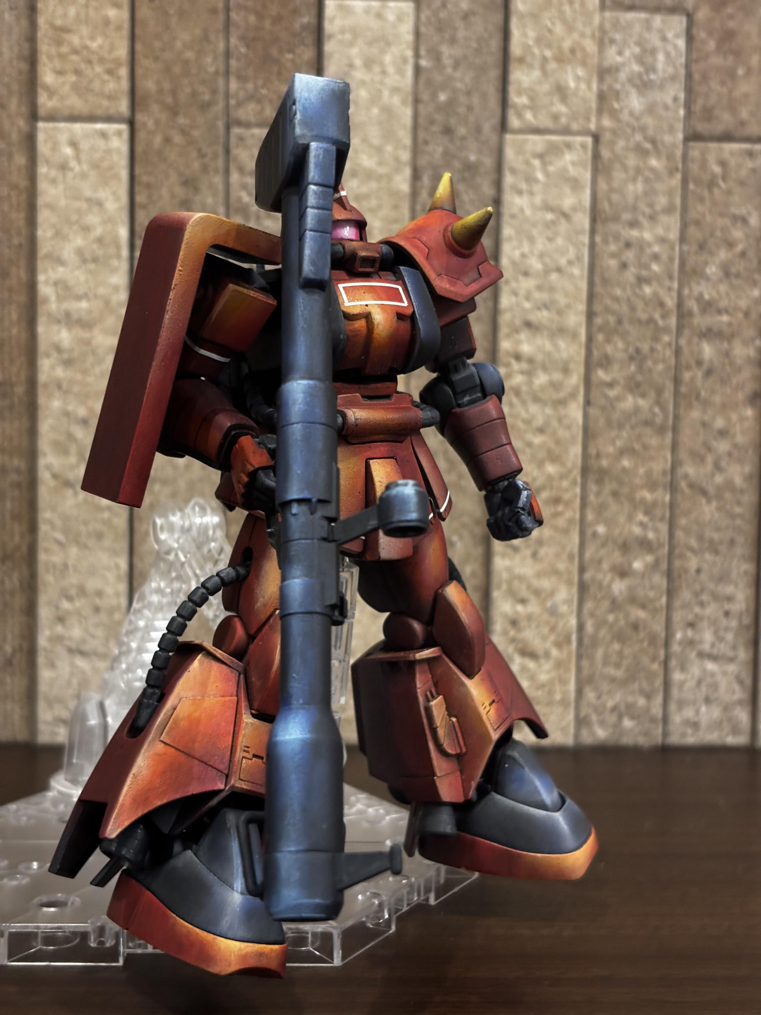 アニメ絵塗装っぽい雰囲気もありながらジョニーライデン機の渋さが良いですね👍🥰 バズーカ構える姿勢がよく似合う🥳 少し影の方もメリハリが👍👍