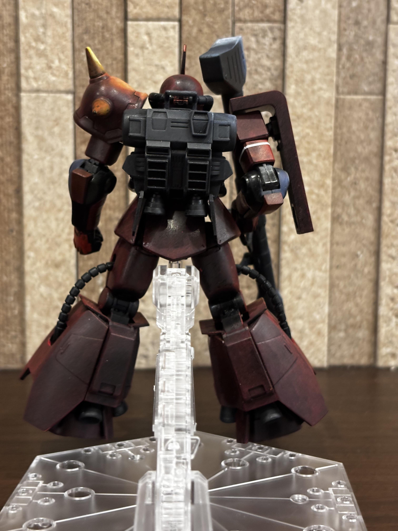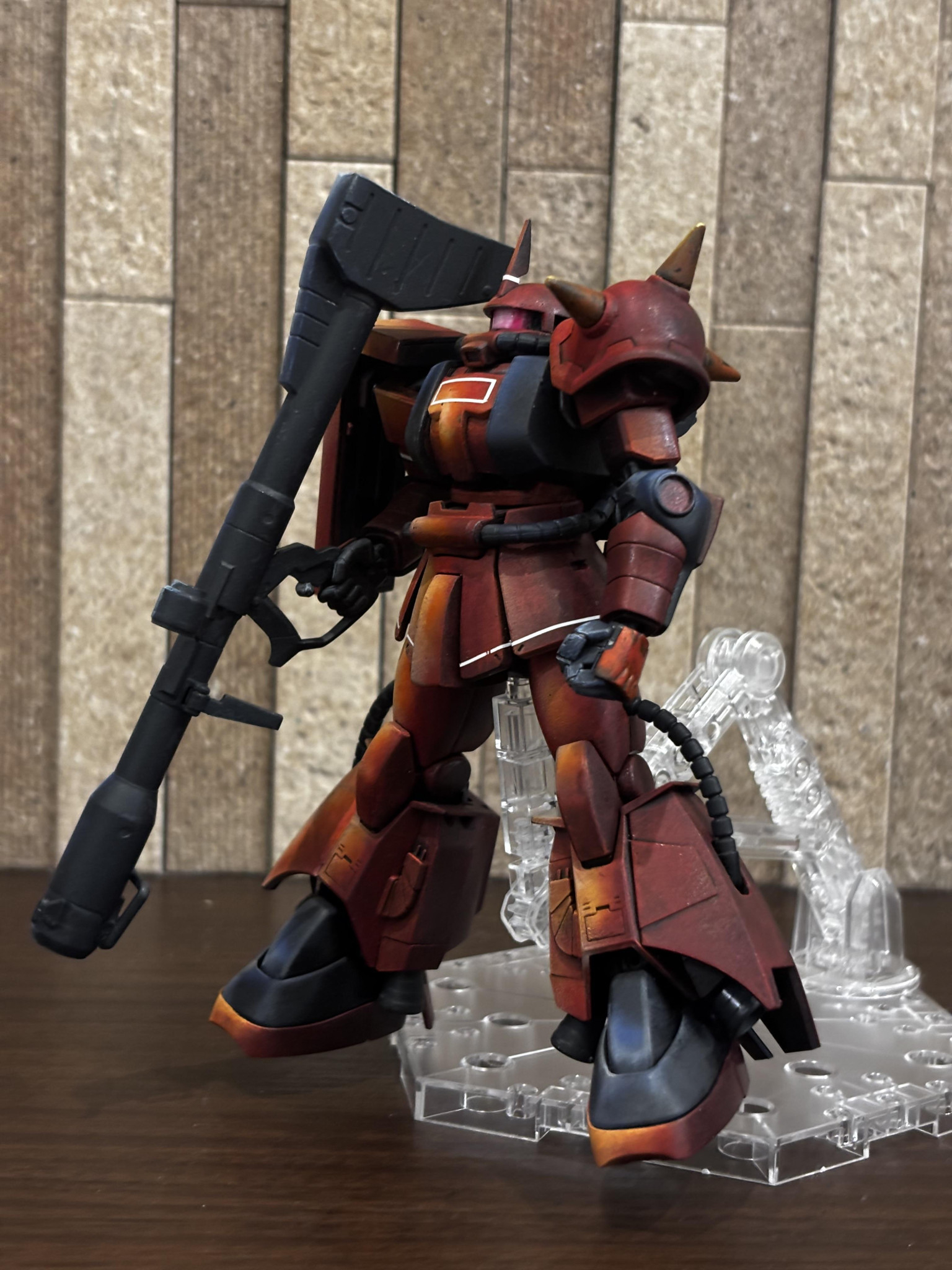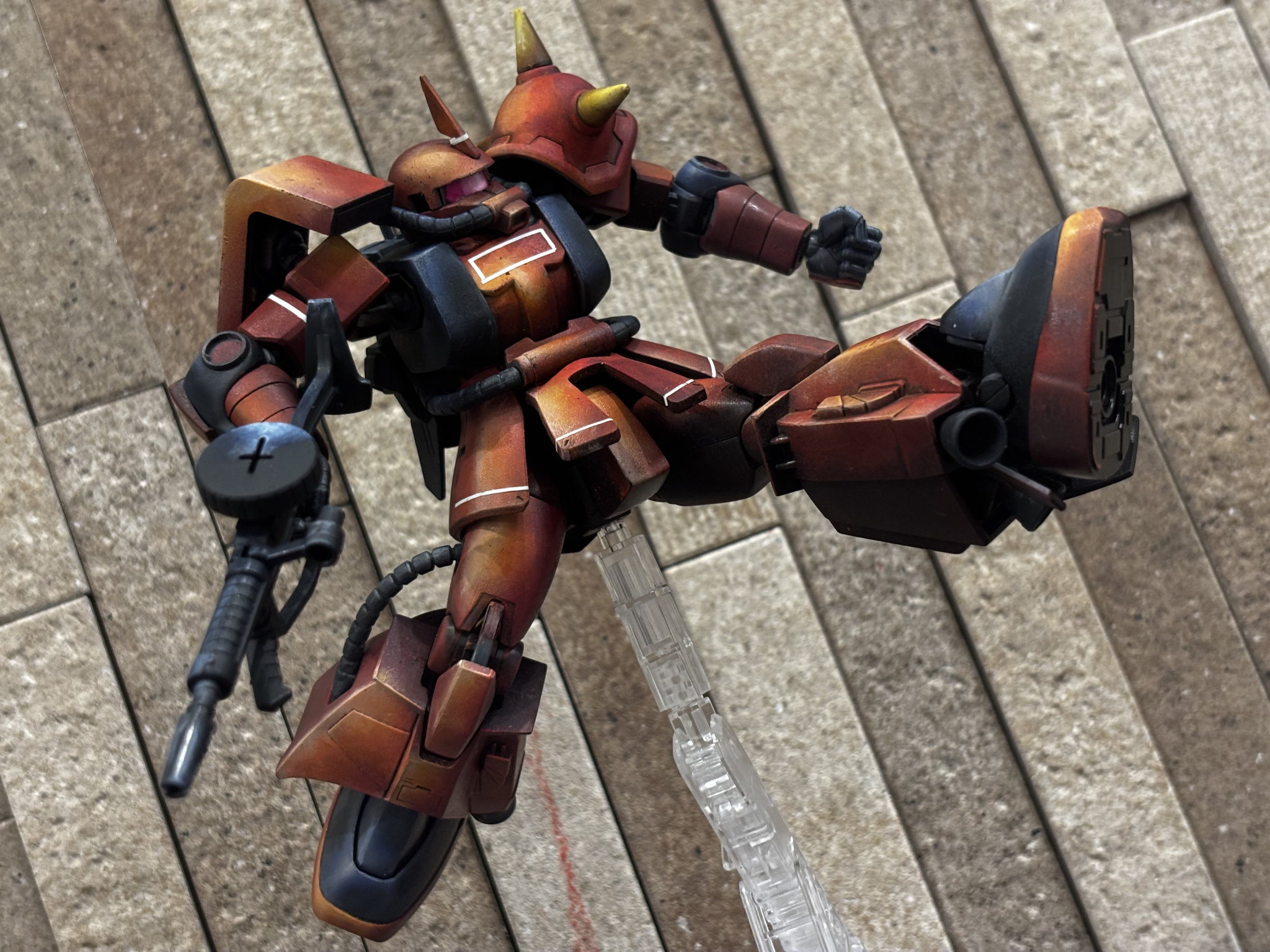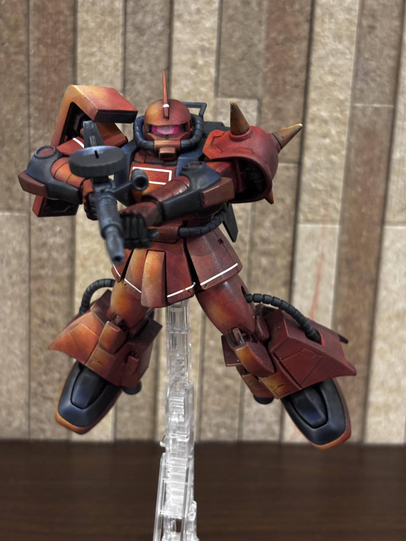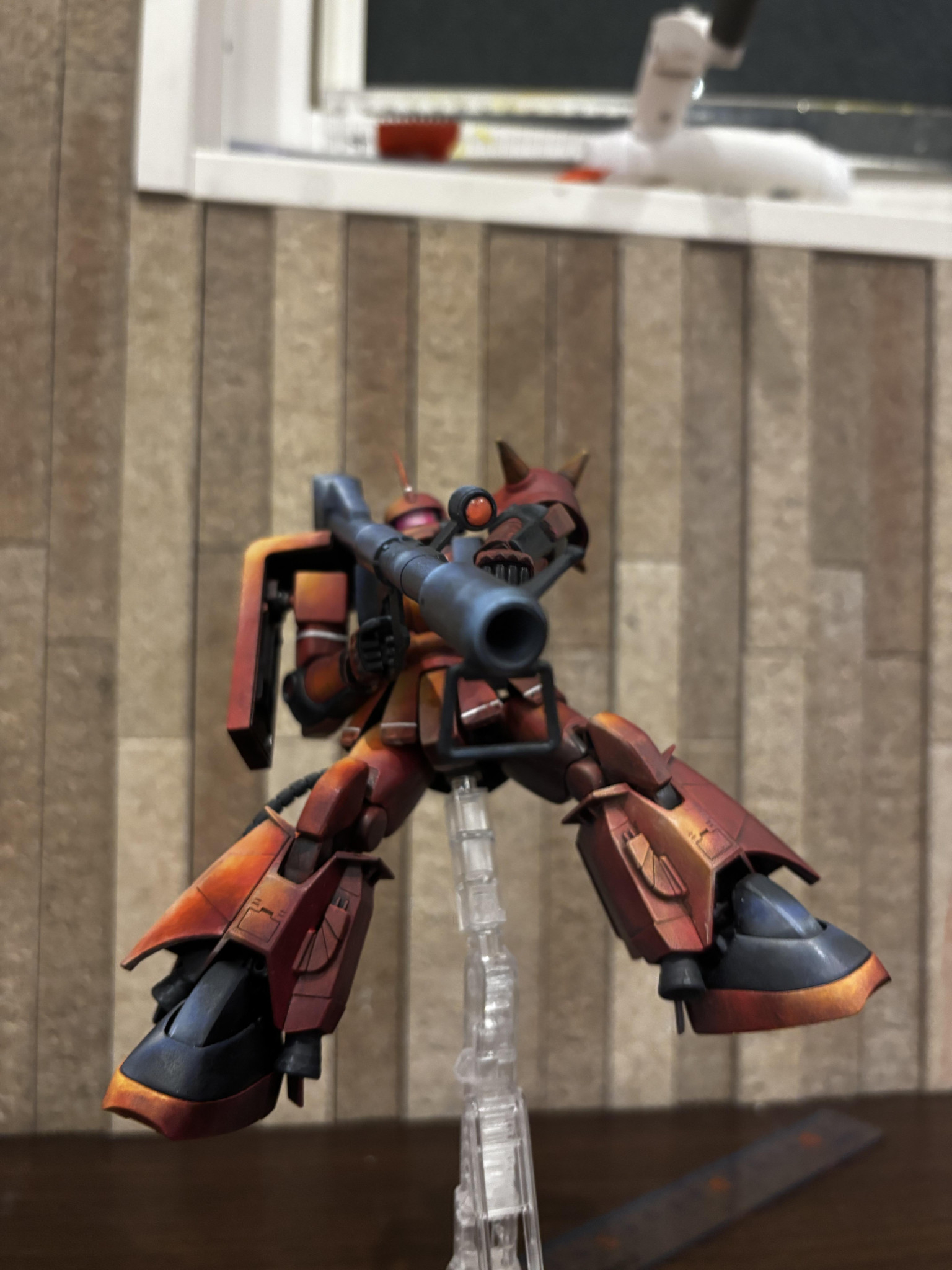 アニメ絵塗装っぽい雰囲気もありながらジョニーライデン機の渋さが良いですね👍🥰 バズーカ構える姿勢がよく似合う🥳 少し影の方もメリハリが👍👍