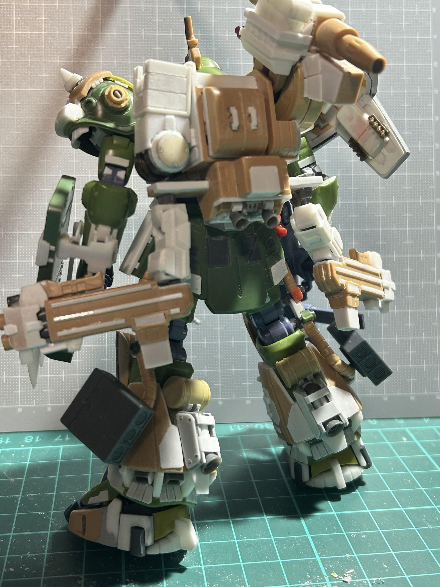 キャノンが写ってなかったので最後に一枚。戦車のプラモデルの砲身を使いました。シールドは元々使っていた破損した肩アーマーを流用したイメージです。