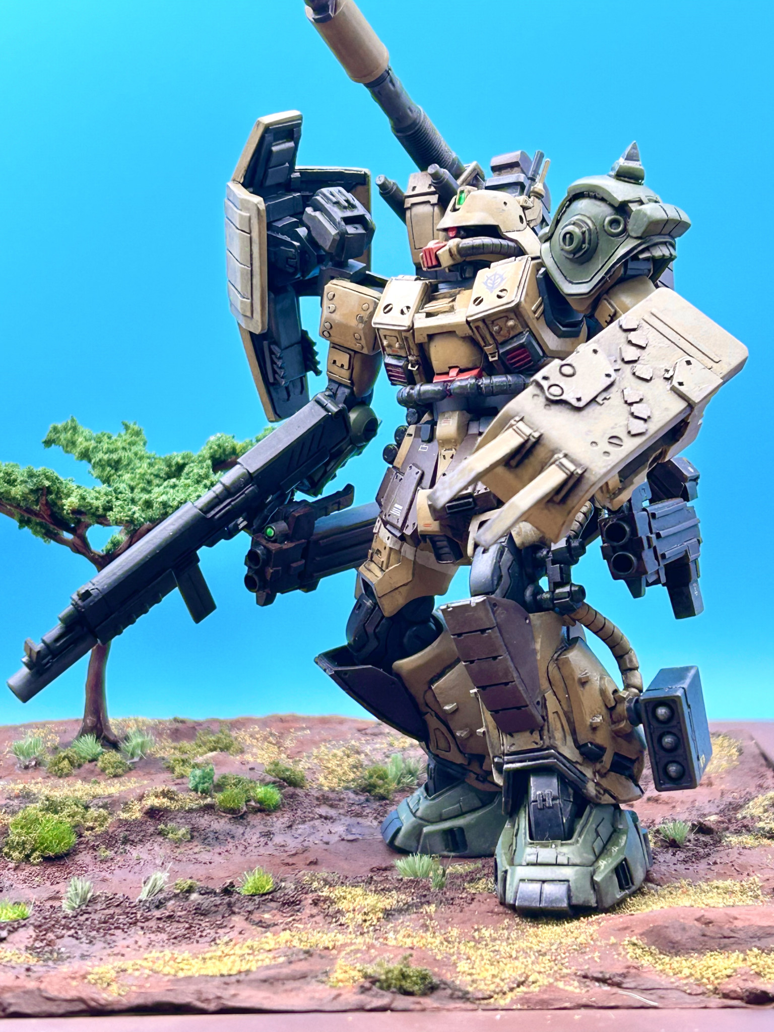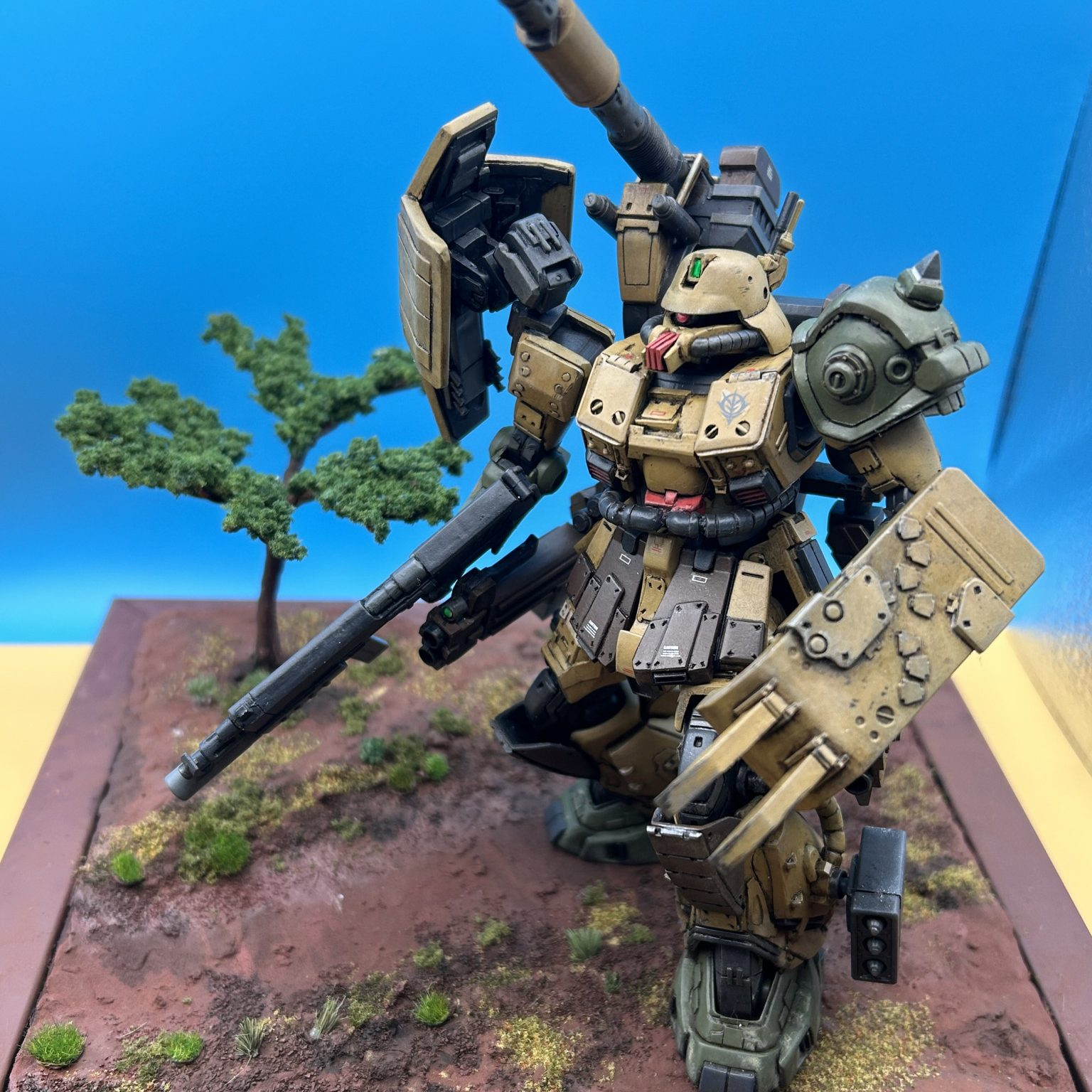 ディティール増やしたいな→せっかくなら最新キットのザクに寄せたいな→せっかく地上用だし、ウェザリングしたいな→ウェザリングしたし専用の土台欲しいな→せっかくならアフリカの荒野のジオラマ作りたいな(ジオラマ作ったことない)