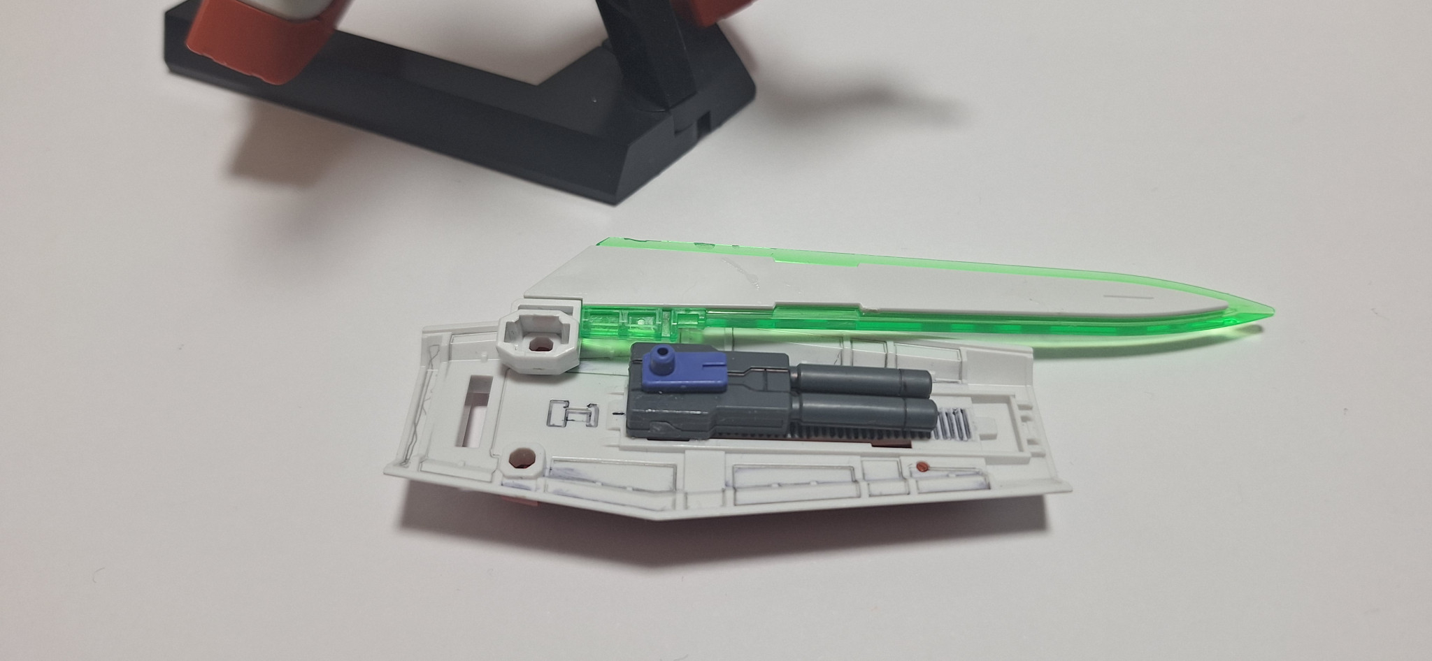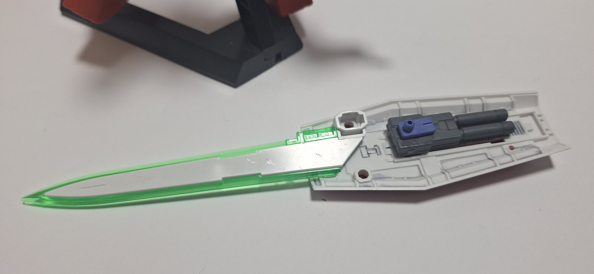 GNシールドソードⅢ、シールド機能の他に内側にキャノン二門と剣を兼ね備えた遠近攻防をこなす万能武器。連邦の盾が剣になり、フルアーマーガンダム腕の二門砲みたいなものをつけたくて作りました。