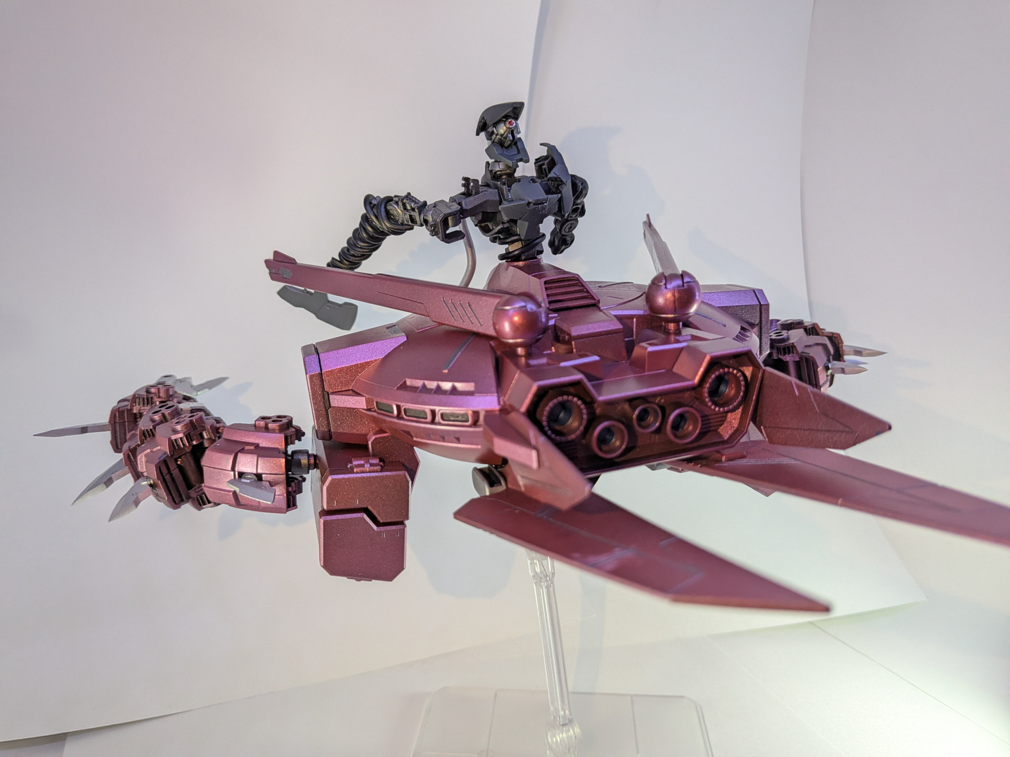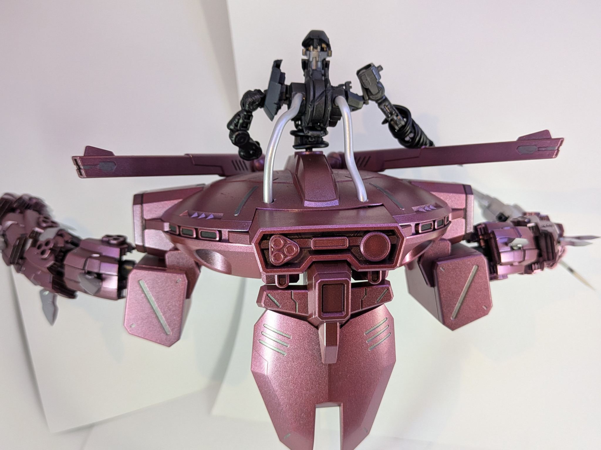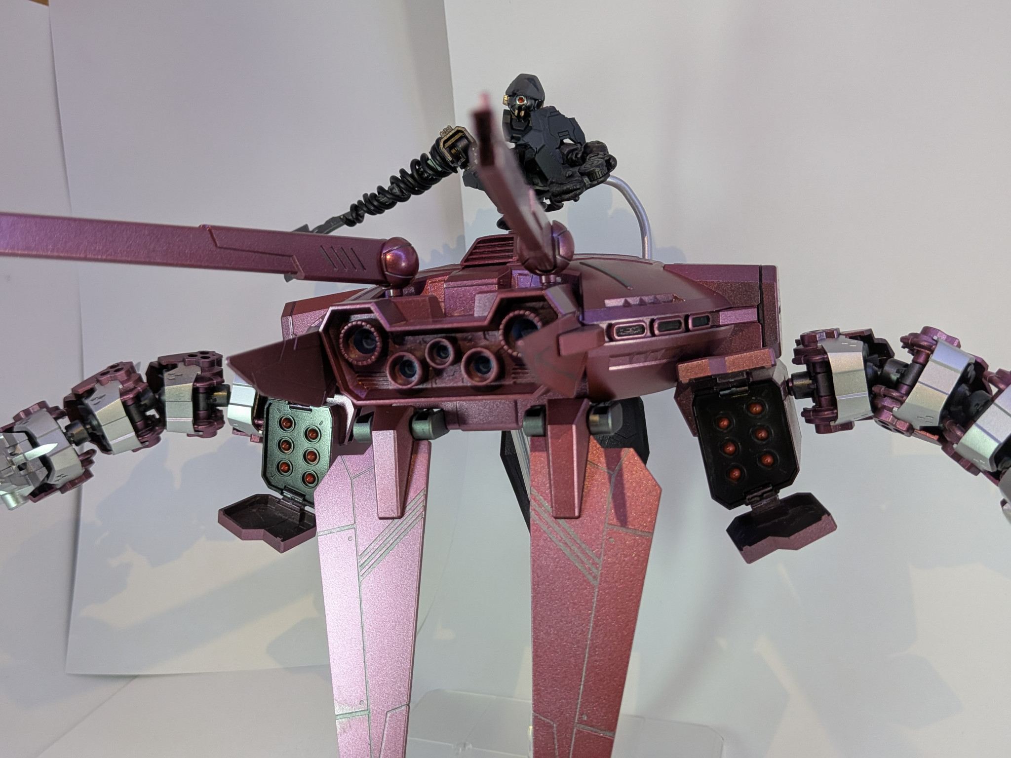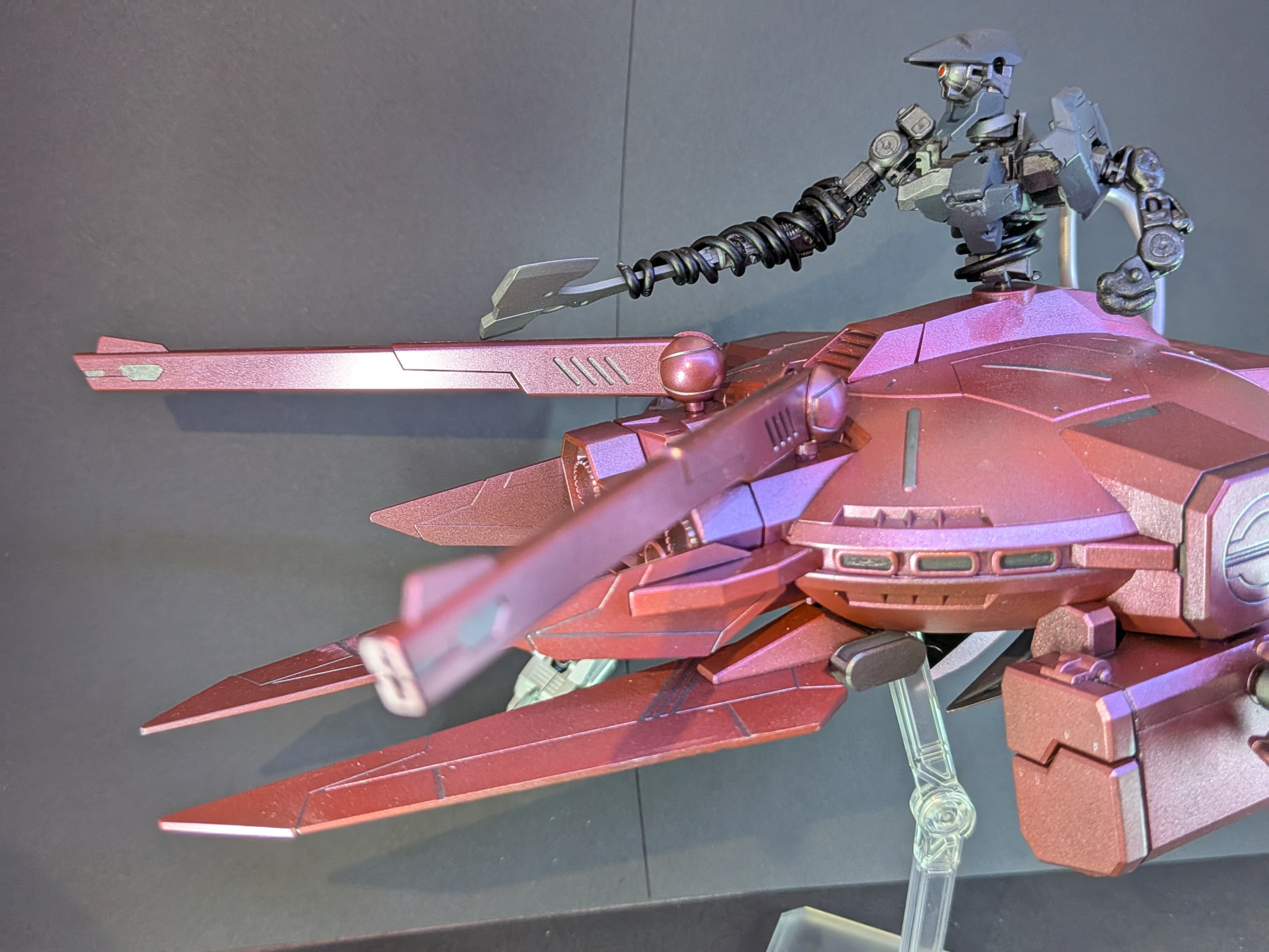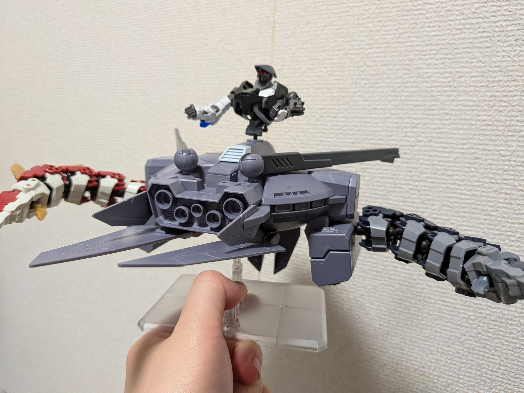 初めはキャバリアーの翼をそのまま使う予定でしたが、友人からセミエビみたいと言われ海鮮系に舵を取りました。腕はウツボ、2つのビーム砲は海老の触角のイメージ。