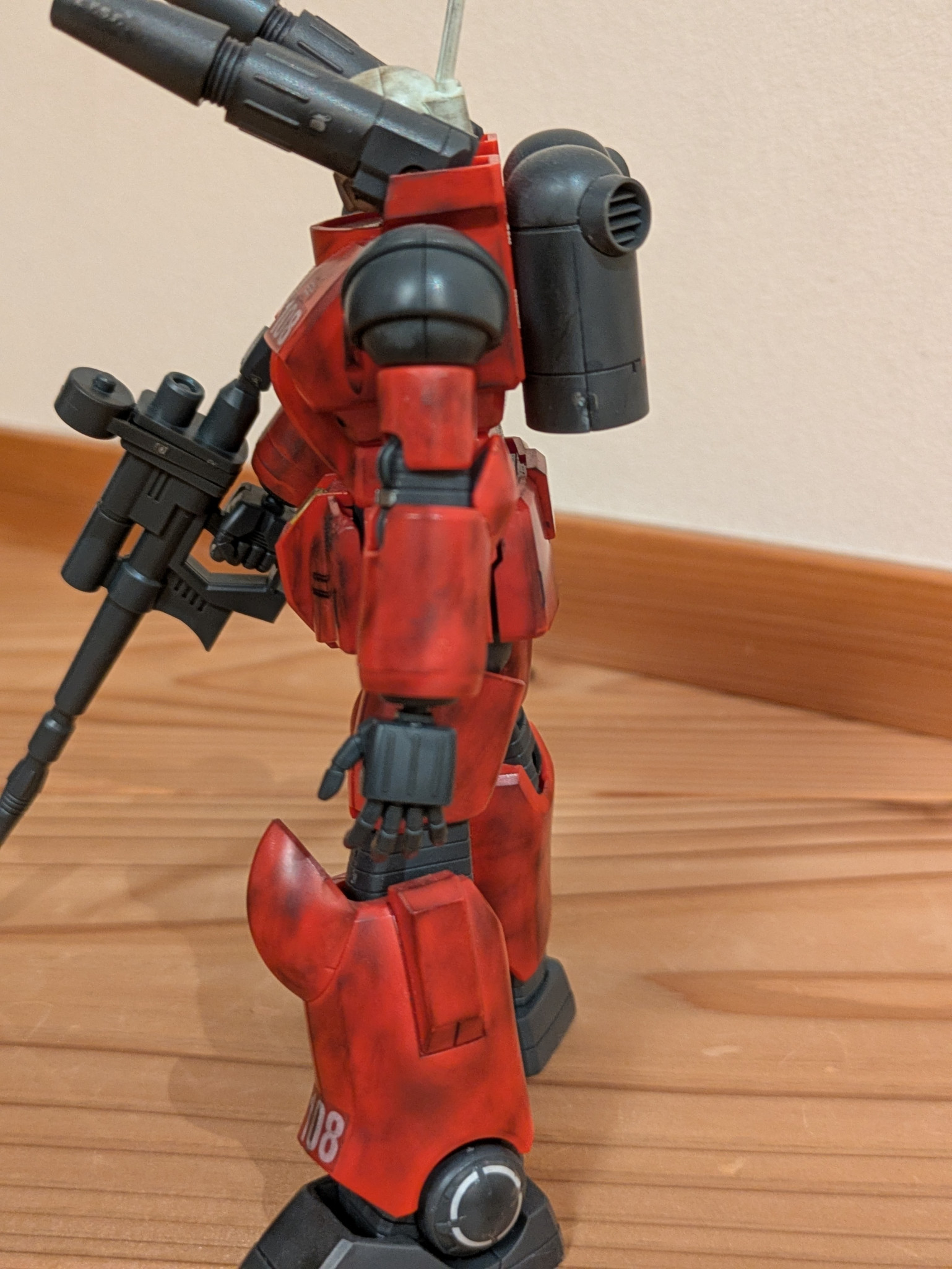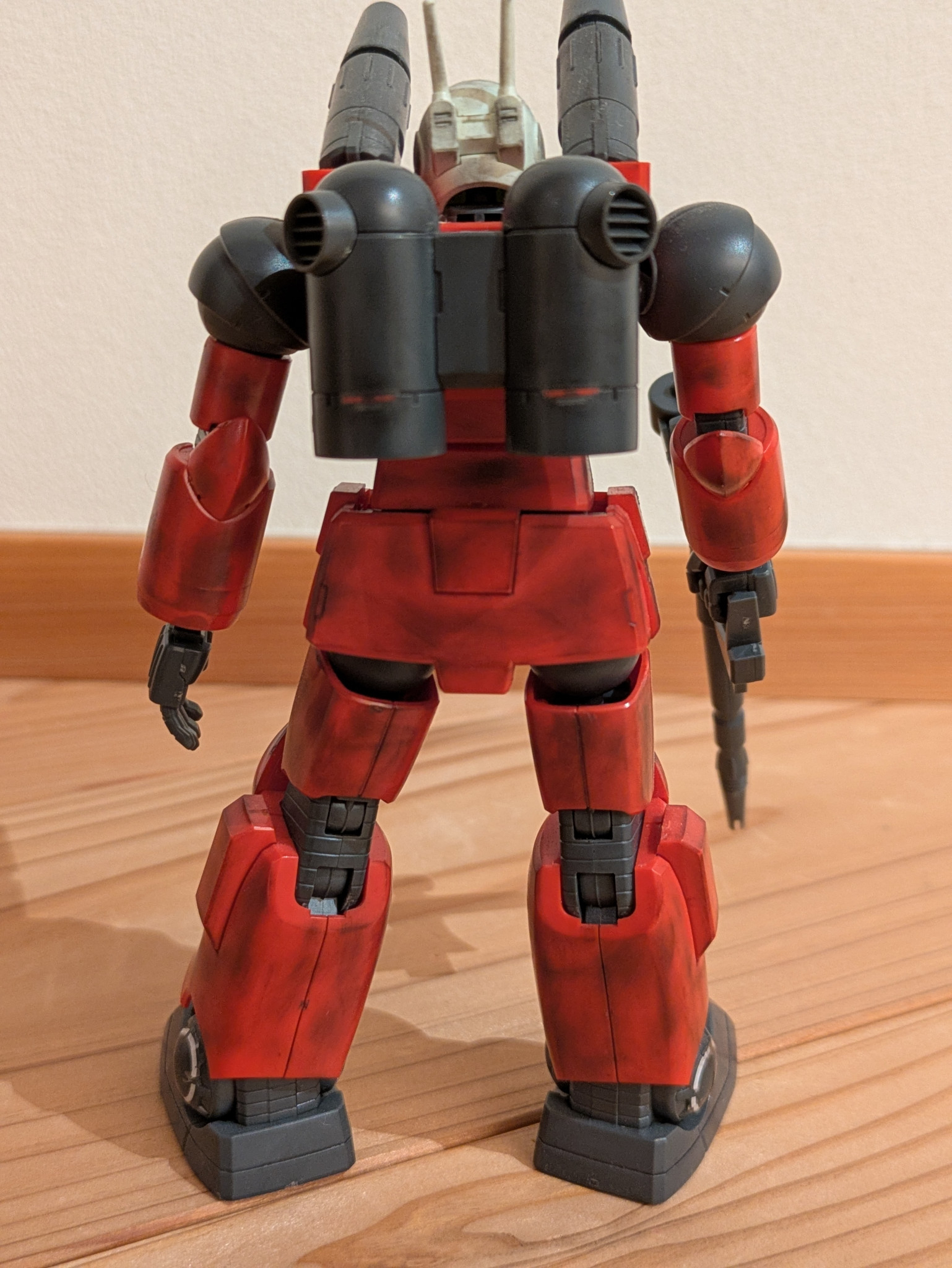前から。腕の関節をガンダムマーカーのシルバーで塗装。他はガンダムマーカーで墨入れ。ウェザリングマスターBで汚しました。まだ汚し方がよくわかりません!