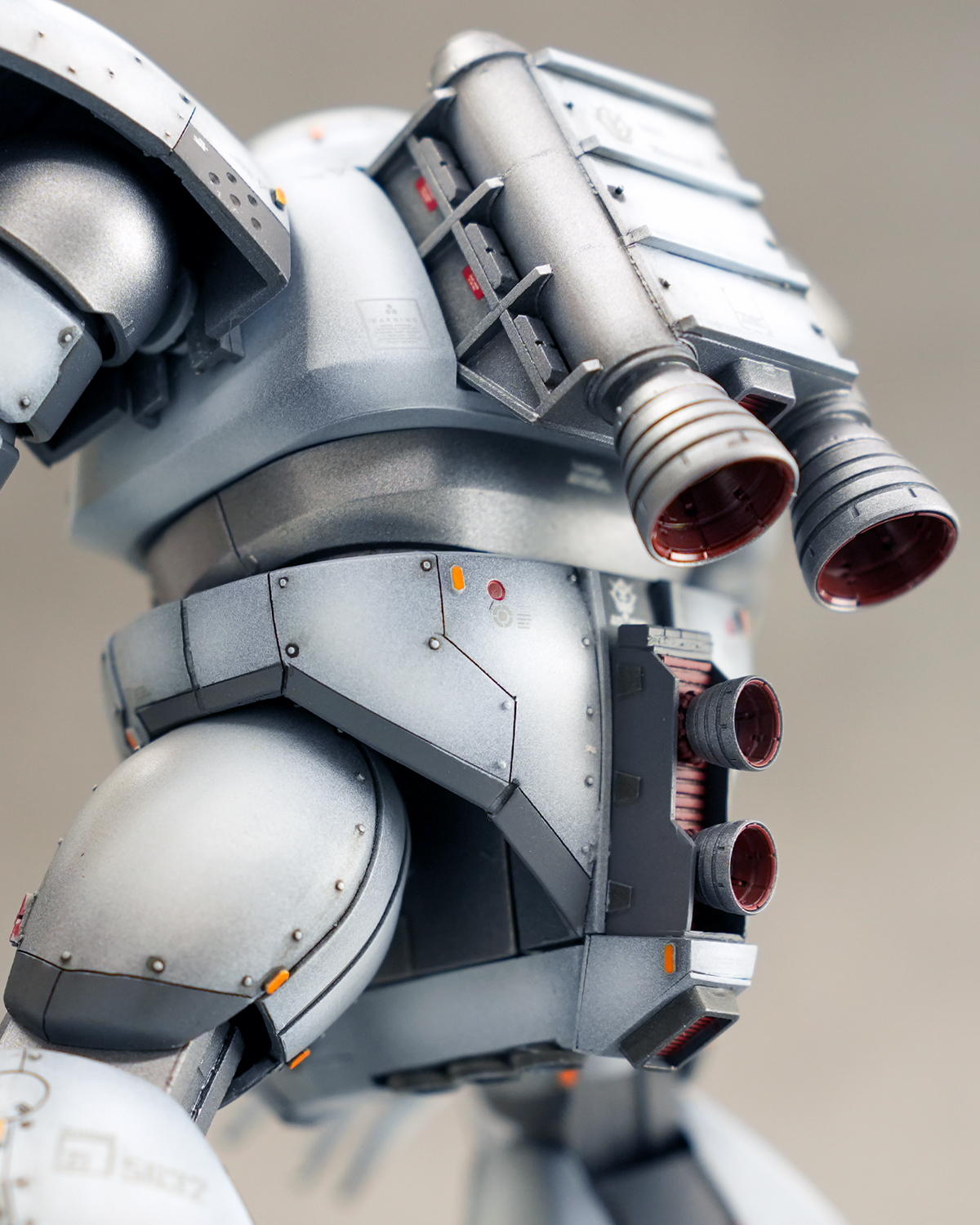 胸部→首がめりこむ定番的な改造をしてます、大幅に加工しています、リベット多めに打って現地改修感が出るように工夫しています。